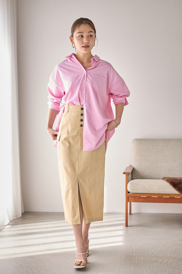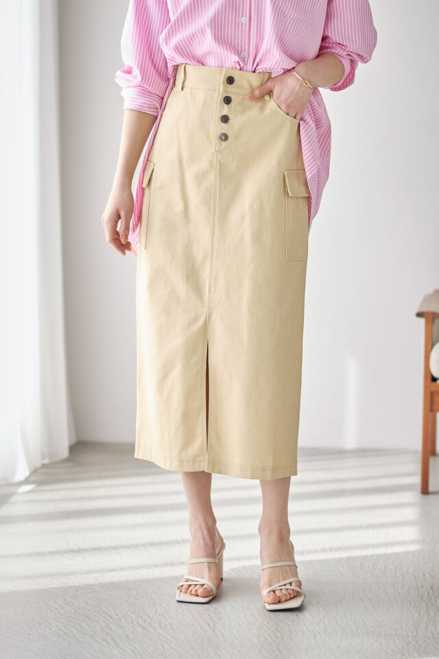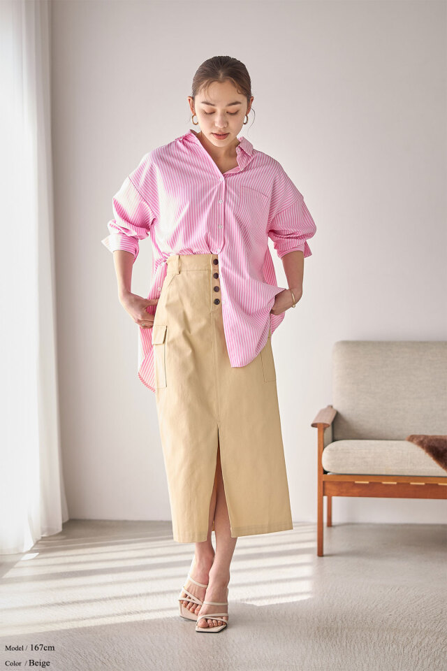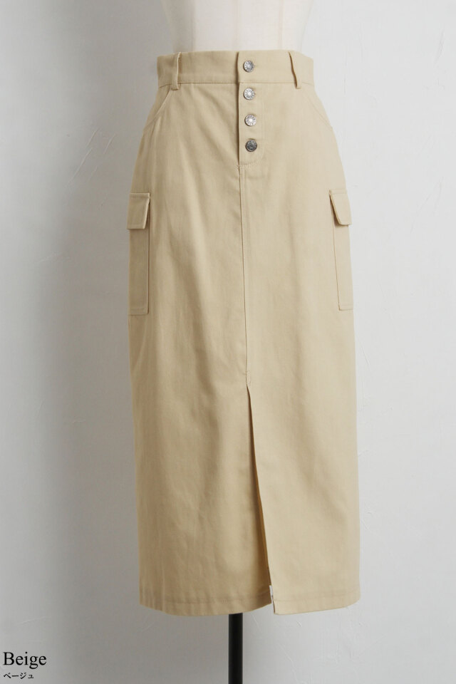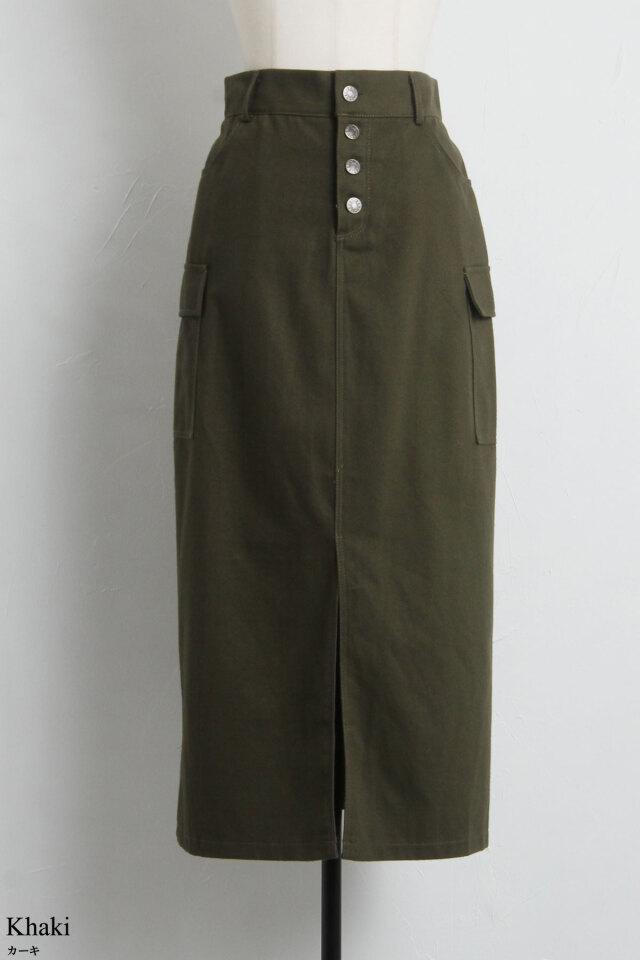 | 商品説明 | : | トレンド感のたっぷり詰まったツイルサイドポケットスカート トレンドのカーゴポケットに加えシルエットをキレイに魅せてくれるストレートIラインとフロントスリットデザインで足長効果抜群◎ |