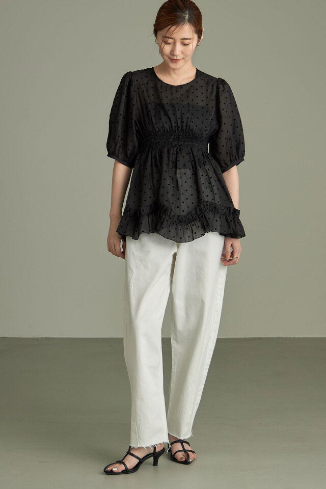 | 商品説明 | : | 着映えするデザインが詰まった!フロッキードットヘムフリルチュニック トレンドのヘムフリルデザインで、1枚で動きの出るチュニック! ノスタルジアで人気のフロッキードット生地を使用し、高見えする大人のドットブラウスに仕上げました! 透け感がある事で軽やかさもあり、ドットだけど決めすぎてない、きれいめカジュアルコーデが叶うアイテムです◎ |