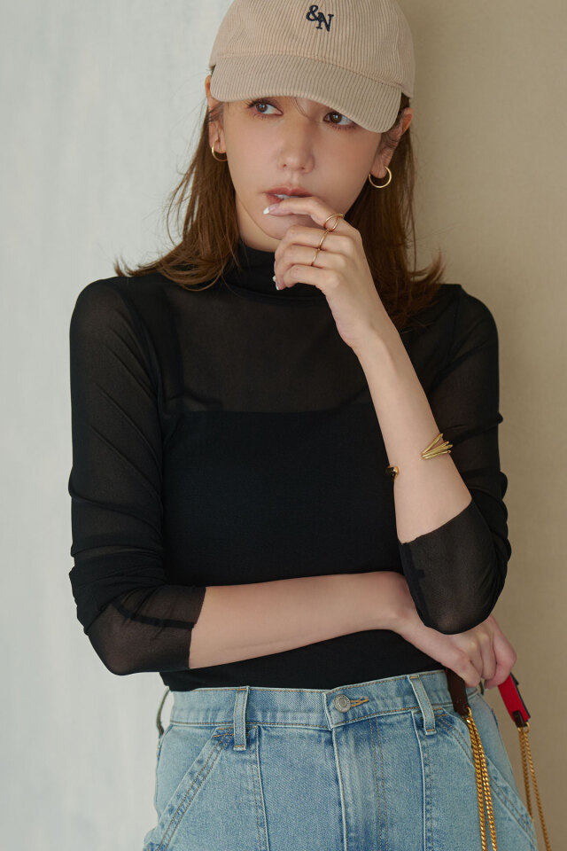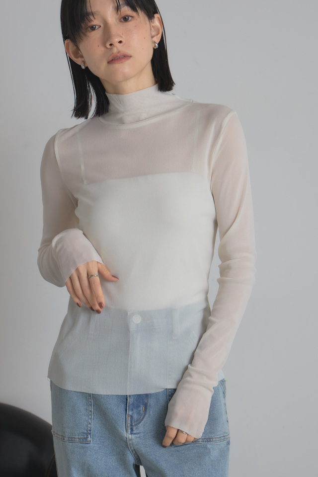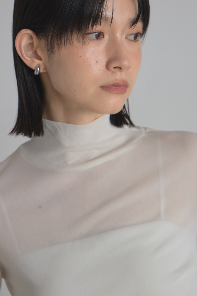 程よいシアー素材が女性らしさを引き立て、1枚でもインナーとしても活躍する万能アイテムです