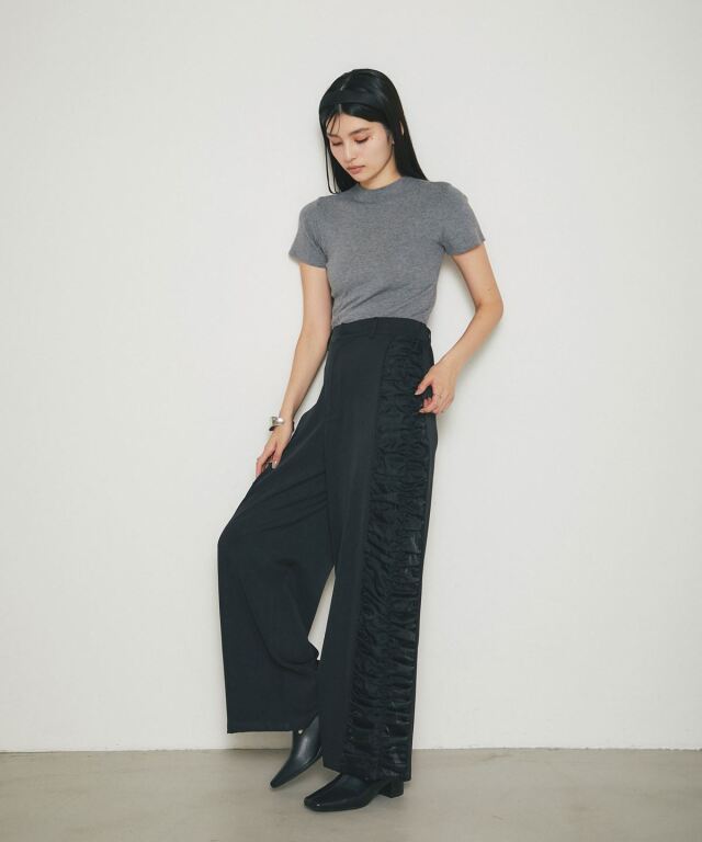 | 商品説明 | : | サイドフリルで魅せる、エレガントモードなワイドパンツ。 両サイドに贅沢なフリルを施した、存在感抜群のワイドパンツ。 縦のラインを強調するデザインで、脚長効果も。 程よいハリ感と落ち感のある素材を使用し、動くたびにフリルが美しく揺れて、女性らしさを引き立てます。 ウエストはすっきりとしたハイウエスト仕様で、トップスインも映えるシルエット。 シンプルなトップスと合わせるだけで、一気に洗練されたコーディネートが完成します。 特別な日にも、日常のおしゃれにも取り入れたい一本です。 |