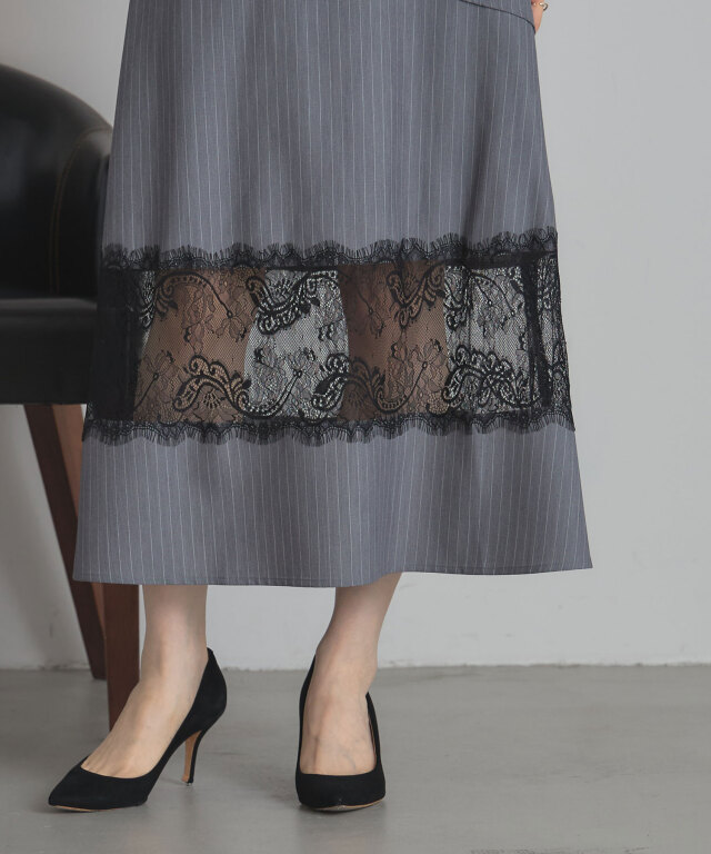 | 商品説明 | ≪ Attention:販売日、在庫状況はWEBと店舗と異なります。予めご了承くださいませ。≫ レースと切り替えデザインが魅せる、上品かつモードなスカート。 クラシカルなストライプ地に繊細なレースを組み合わせた、大人の女性らしさが際立つスカート。 裾部分に透け感のあるレースをあしらうことで、程よい抜け感とエレガントな雰囲気を演出します。 腰回りには斜めに走る切り替えデザインを取り入れ、 視線を自然に分散させることでスタイルアップ効果も期待できる仕立てに。 すっきりとしたウエストラインから裾に向かって広がるシルエットは、 体のラインを拾いすぎず、美しく見せてくれるのも嬉しいポイントです。 きれいめなブラウスを合わせればオフィスやフォーマルシーンに、 シンプルなニットと合わせればこなれ感のあるデイリーコーデにと、幅広いスタイルで活躍。 シンプルながらも存在感を放つ一枚は、着こなしをクラスアップしてくれる頼れるアイテムです。 |