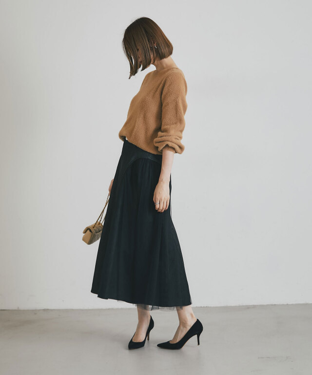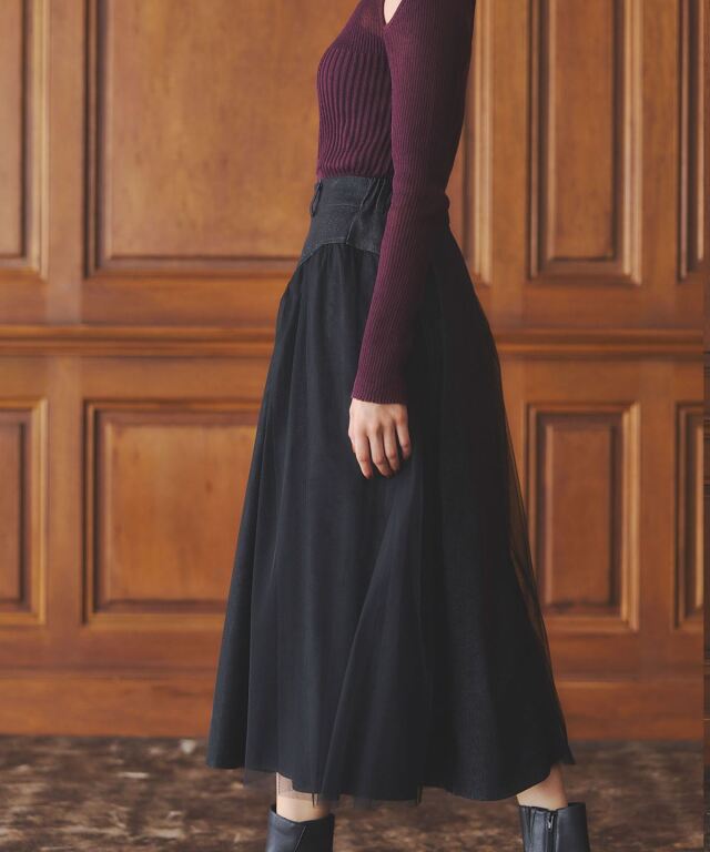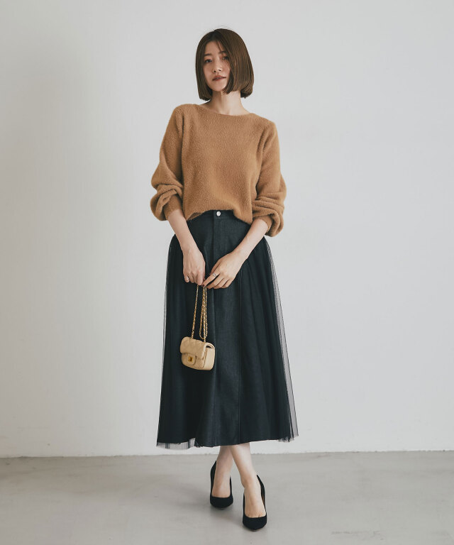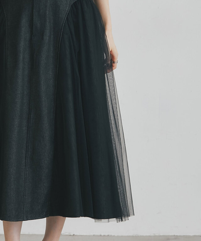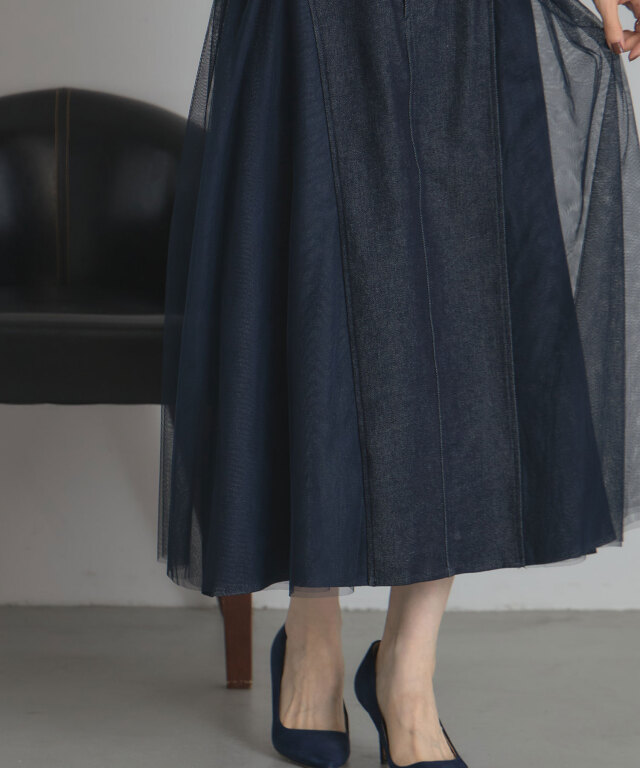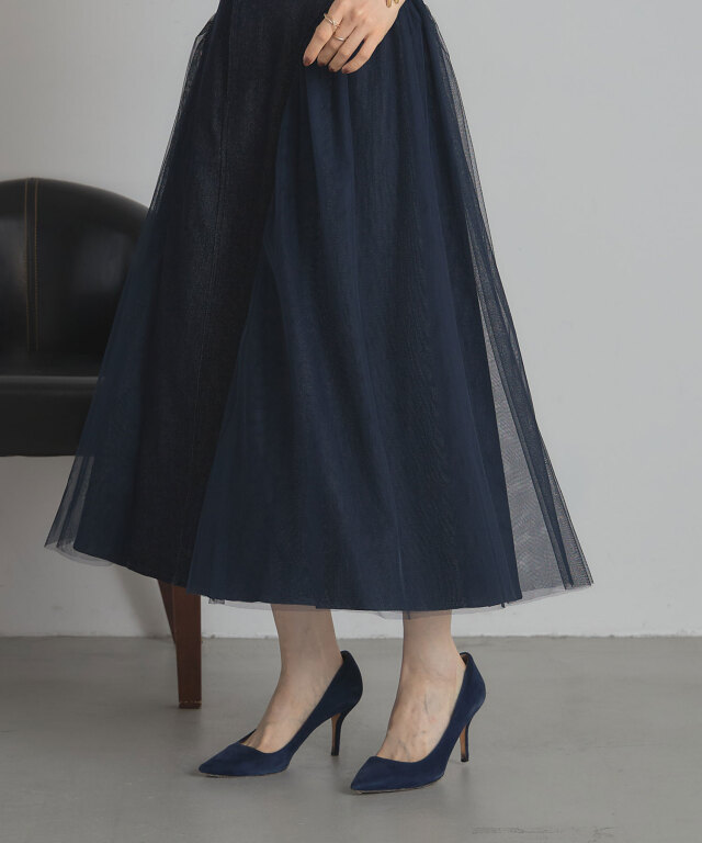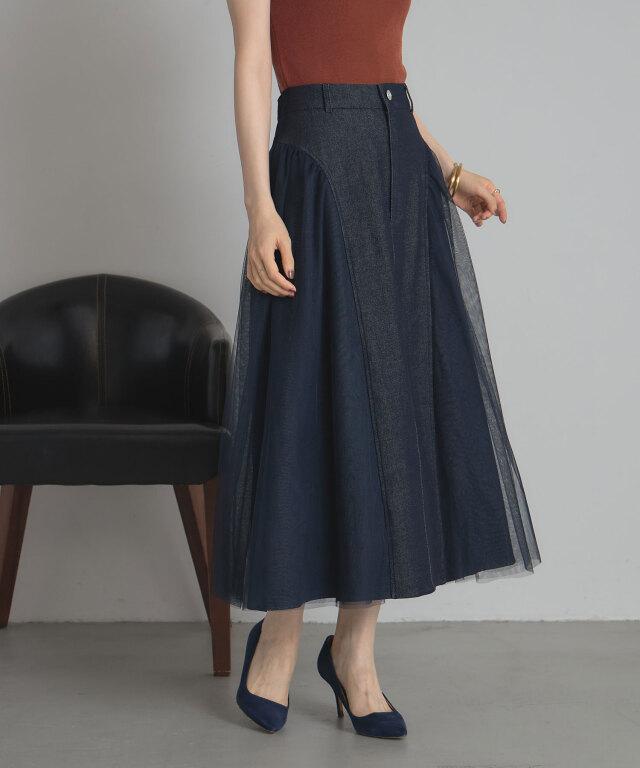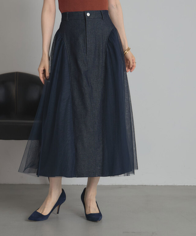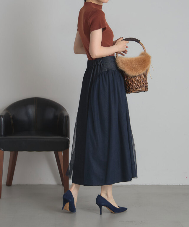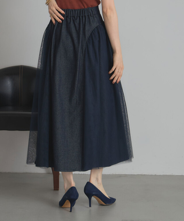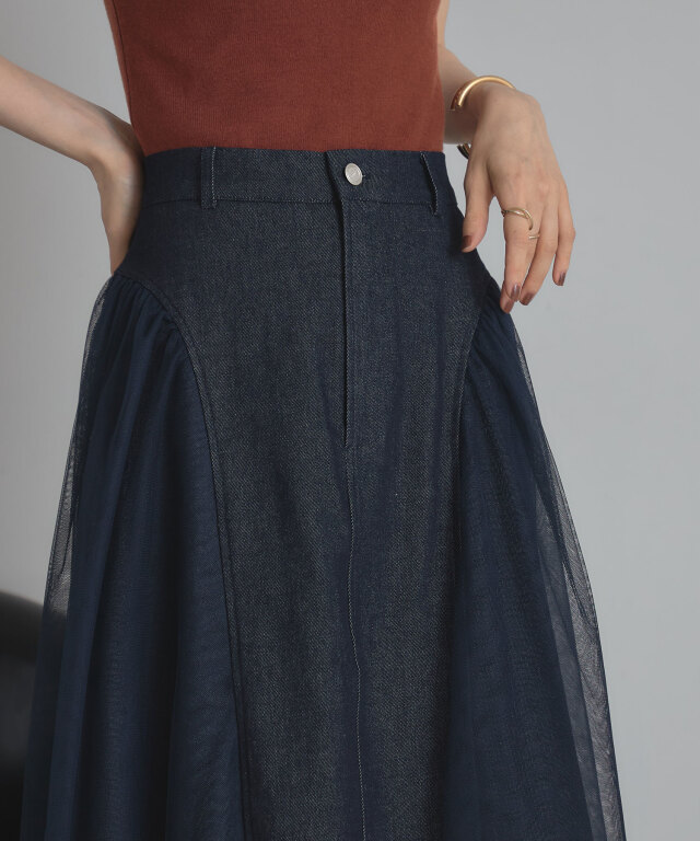 | 商品説明 | : | 透け感と重厚感をひとつに、異素材が奏でる大人のデニムスカート。 ハードな印象になりがちなデニムに、繊細なチュールを重ねることで、 軽やかさとフェミニンさをプラスした新感覚のスカート。 程よく広がるAラインシルエットが美しく、脚のラインを自然にカバーしながら、 歩くたびに揺れるチュールがエレガントな雰囲気を演出します。 ウエストはすっきりとしたデザインで、トップスをインしてももたつかず、 スタイルアップ効果も抜群。 デニムの程よいカジュアル感に、チュールの抜け感が加わることで、 Tシャツやニットなどのデイリーアイテムとも好相性。 足元をヒールでまとめれば、きれいめなお出かけスタイルにも◎。 定番のデニムに飽きた方や、人と差がつくボトムをお探しの方にぴったりの一枚です。 |