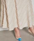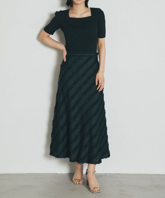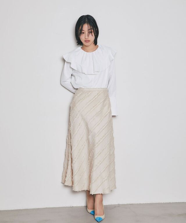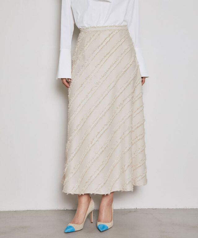 | 商品説明 | : | 歩くたび、表情を変える。斜めのフリンジラインが織りなす、大人カジュアルスカート。 表面感のあるジャガード織りのような生地に、同色のフリンジを斜めにあしらった、こだわり抜いたテクスチャーが魅力のロングスカート。 バイアス方向に流れるフリンジのラインが、静止していても躍動感を与え、スタイリングに豊かな奥行きをプラスします。 広がりすぎない絶妙なAラインシルエットが、腰回りをすっきりと見せながら、優雅で女性らしい佇まいを演出。 ブラウスを合わせてレディに仕上げるのはもちろん、シンプルなニットやTシャツと合わせても 、素材の存在感が際立ち、洗練されたモードな装いに導いてくれます。 日常の何気ない動きさえも美しくドラマティックに見せてくれる、主役級のボトムスです。 |