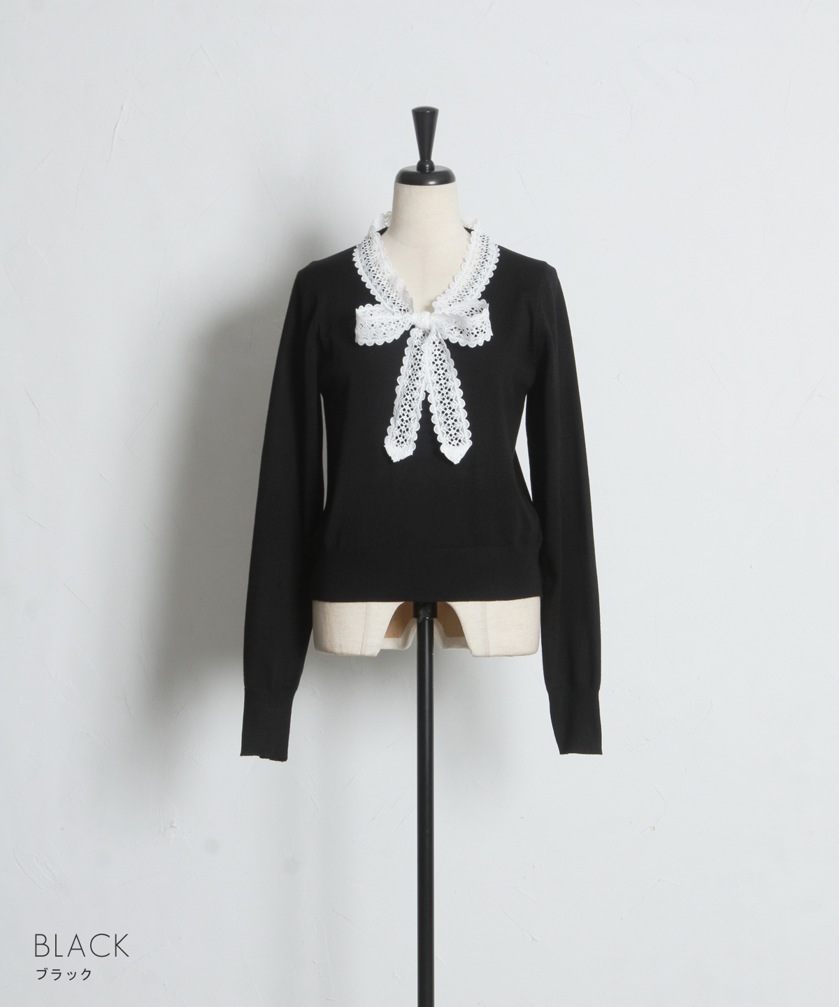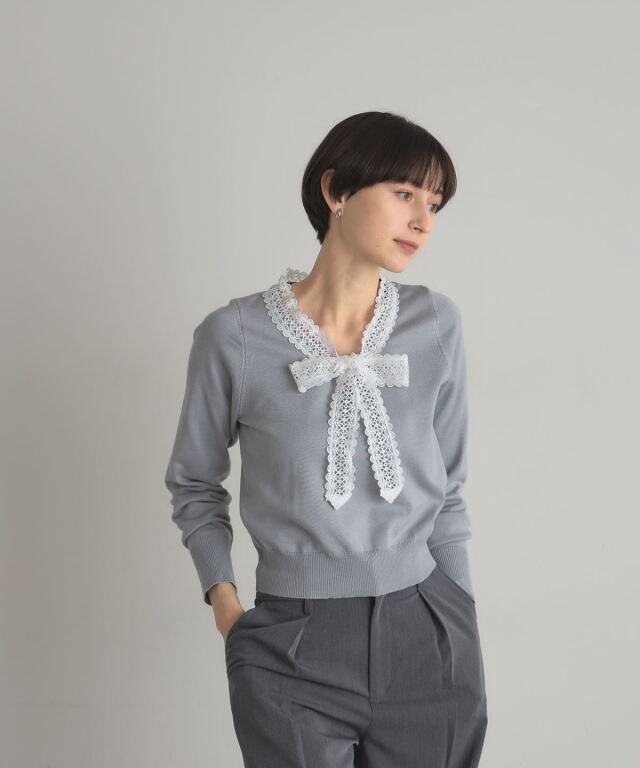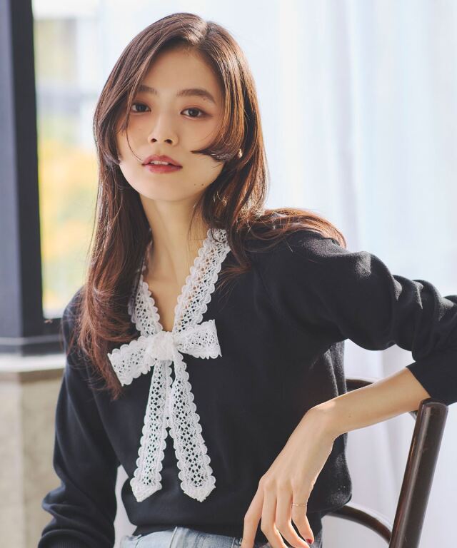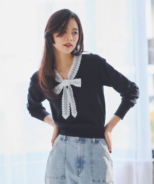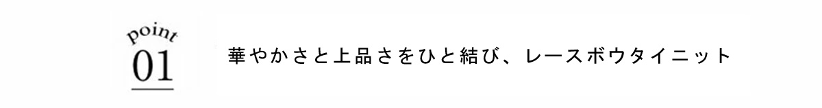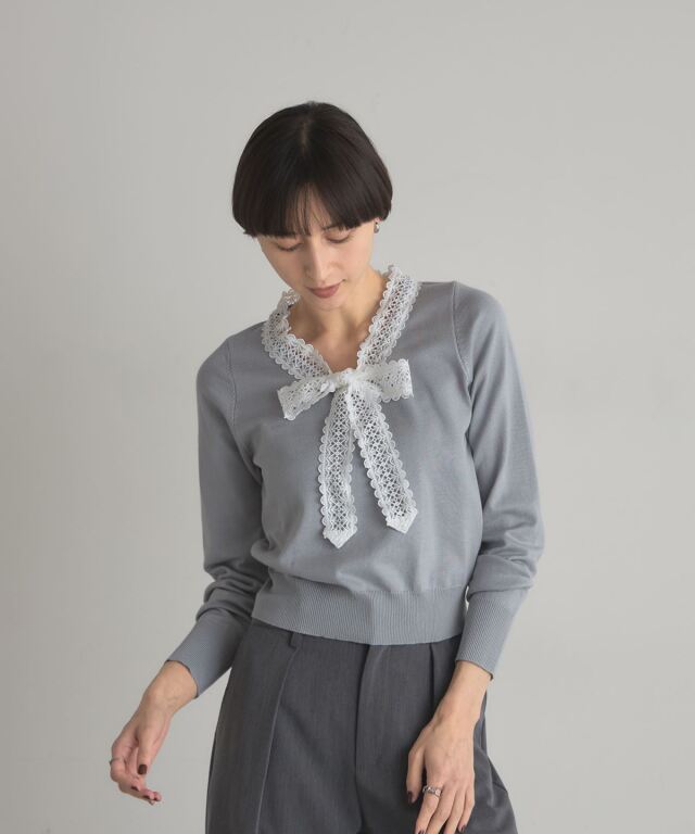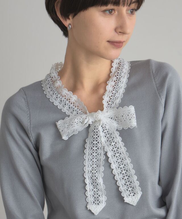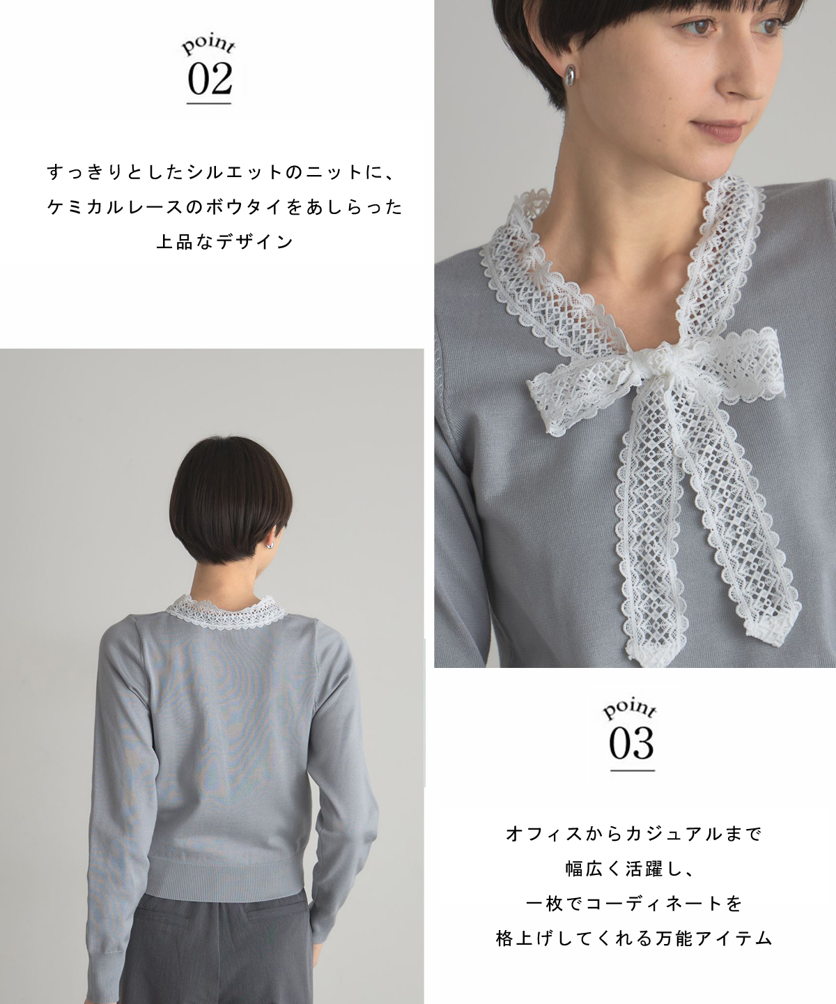| 商品説明 | : | 華やかさと上品さをひと結び、レースボウタイニット。 すっきりとしたシルエットのニットに、ケミカルレースのボウタイをあしらった上品なデザイン。 首元の華やかなディテールが顔周りを明るく見せ、シンプルなボディラインと好バランス。 オフィスからカジュアルまで幅広く活躍し、一枚でコーディネートを格上げしてくれる万能アイテムです。 |