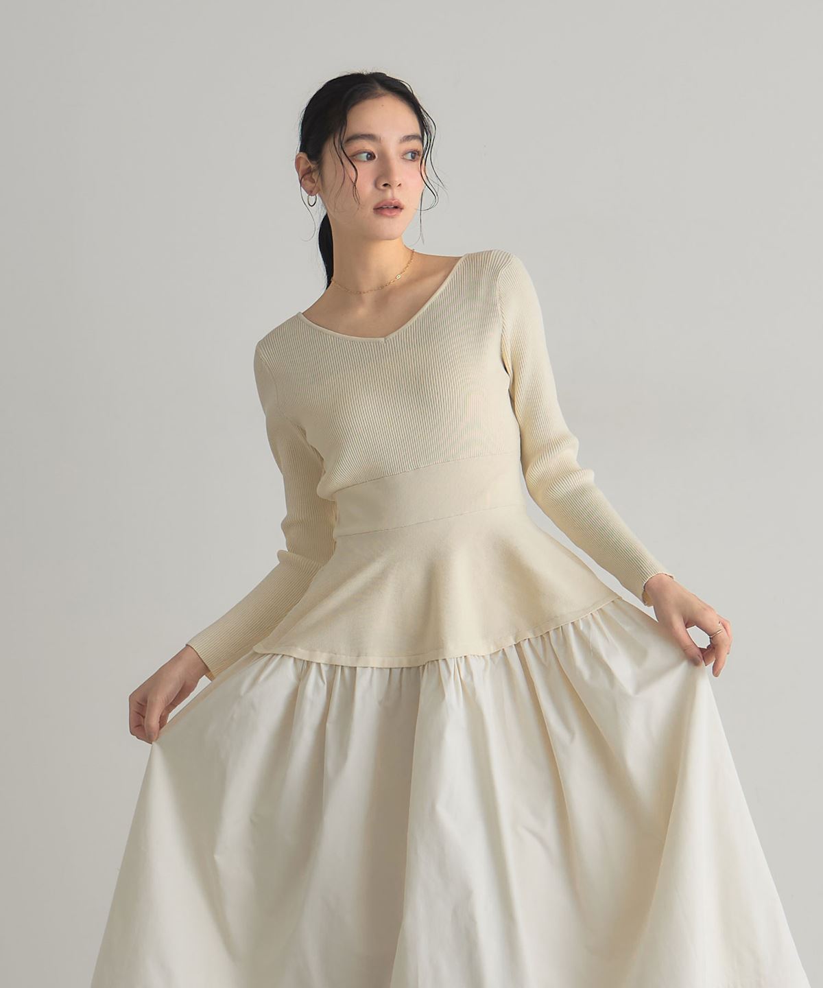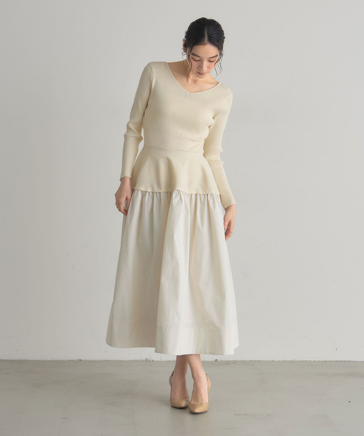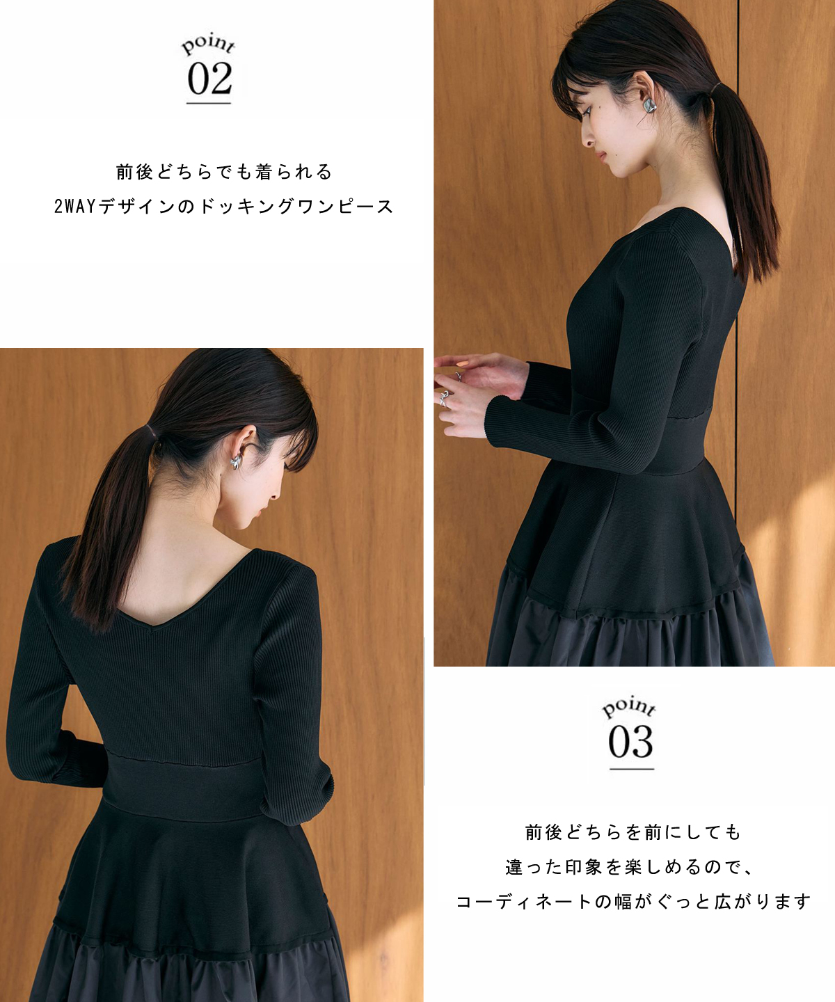 | 商品説明 | : | 前後どちらでも楽しめる、着回し力抜群のドッキングワンピース。 前後どちらでも着られる2WAYデザインのドッキングワンピース。 異素材を組み合わせたドッキング仕立てで、シンプルながら立体感のあるシルエットに。 トップス部分はすっきり、スカート部分は程よくゆとりのあるラインで、 デイリーからお出かけまで幅広く活躍。 前後どちらを前にしても違った印象を楽しめるので、コーディネートの幅がぐっと広がります。 |