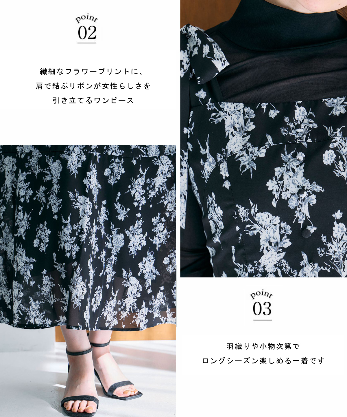 | 商品説明 | : | 繊細な花柄とリボンが彩る、華やぎワンピース。 繊細なフラワープリントに、肩で結ぶリボンが女性らしさを引き立てるワンピース。 柔らかな配色と軽やかな素材感で、甘くなりすぎず上品な印象に仕上げました。 動くたびに揺れるシルエットが、自然な華やかさを演出。 1枚で着映えするデザインなので、デイリーからデート、ちょっとしたお呼ばれまで幅広いシーンに活躍します。 羽織りや小物次第でロングシーズン楽しめる一着です。 |