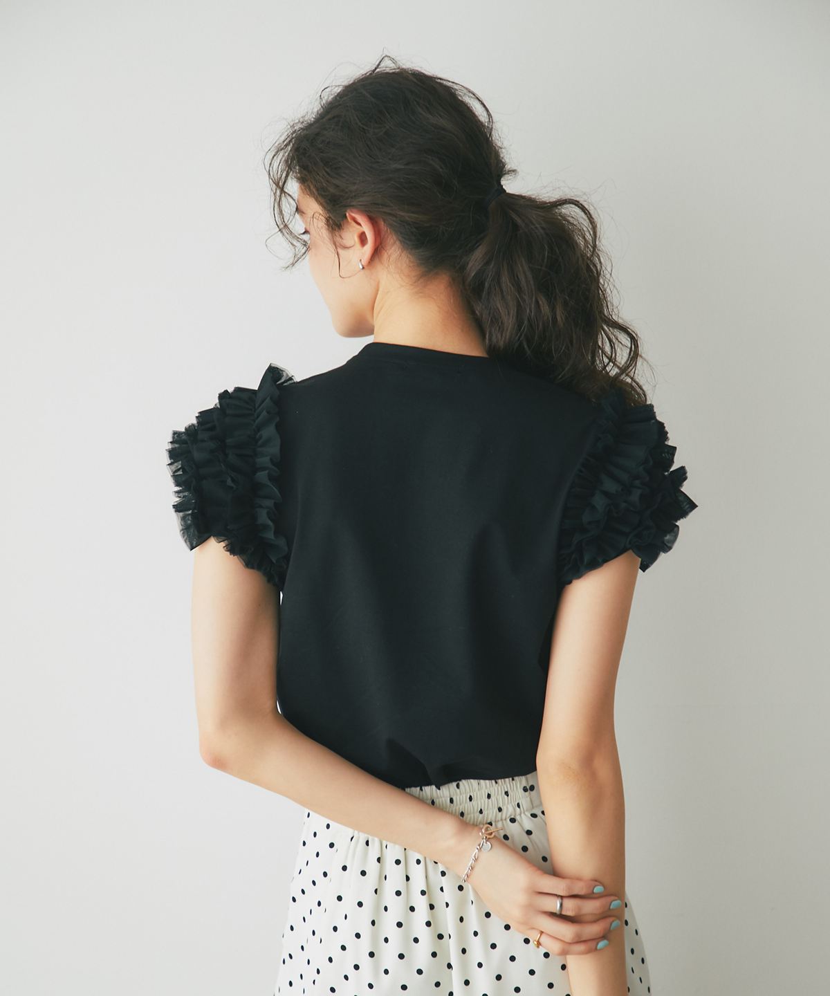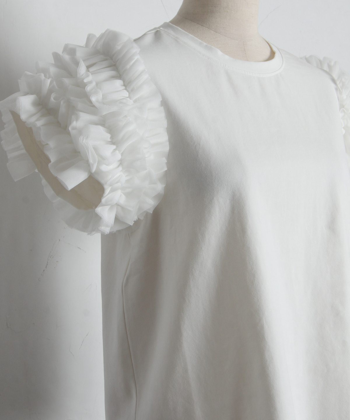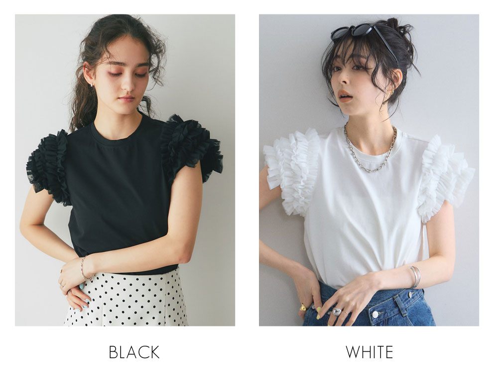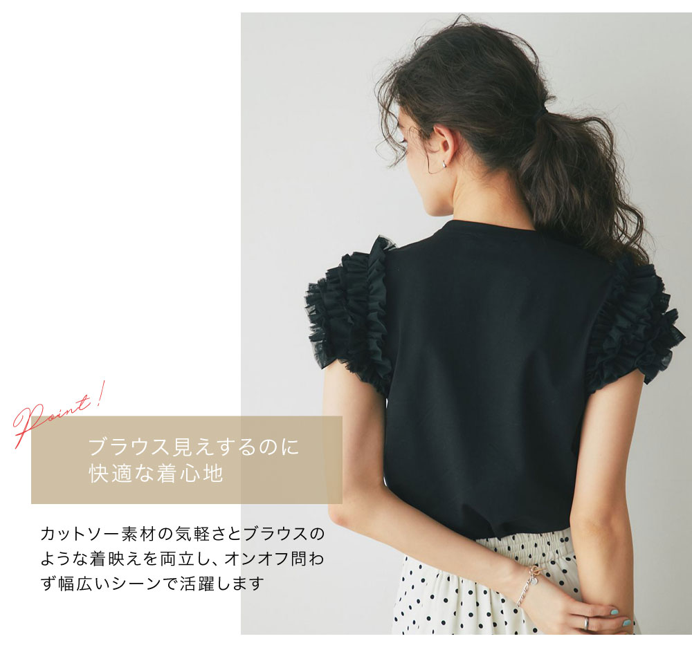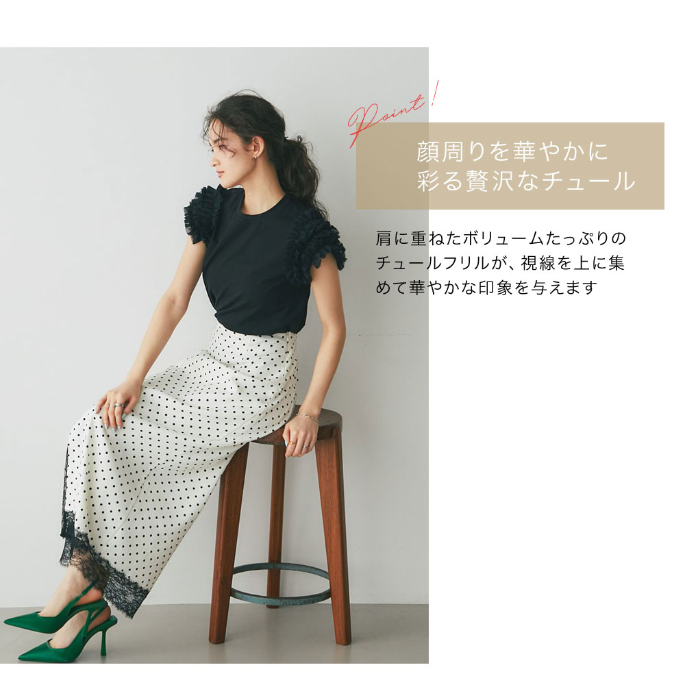 存在感のあるチュールフリルが、いつものTシャツスタイルをドラマチックにアップデートする一枚。