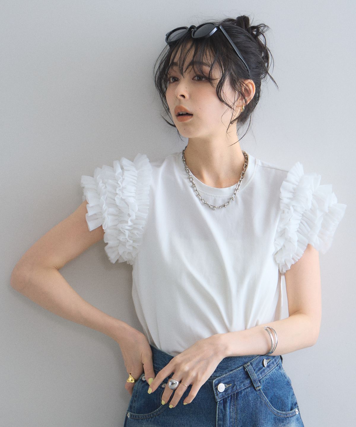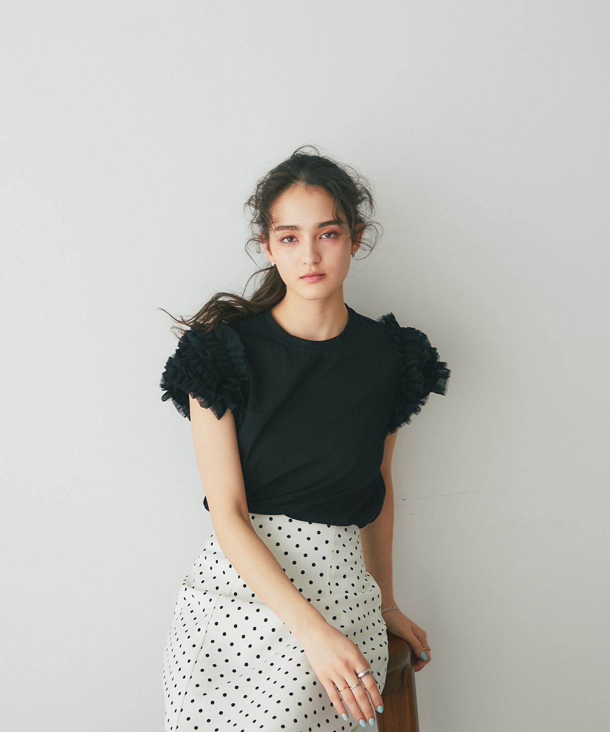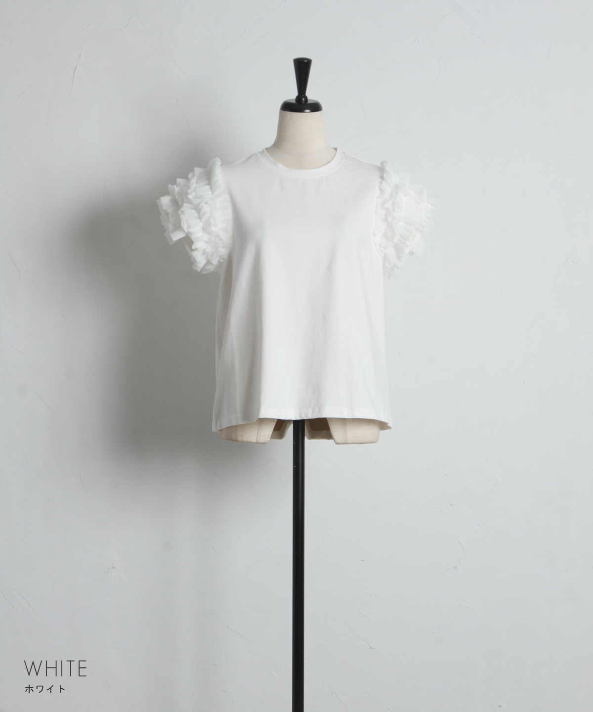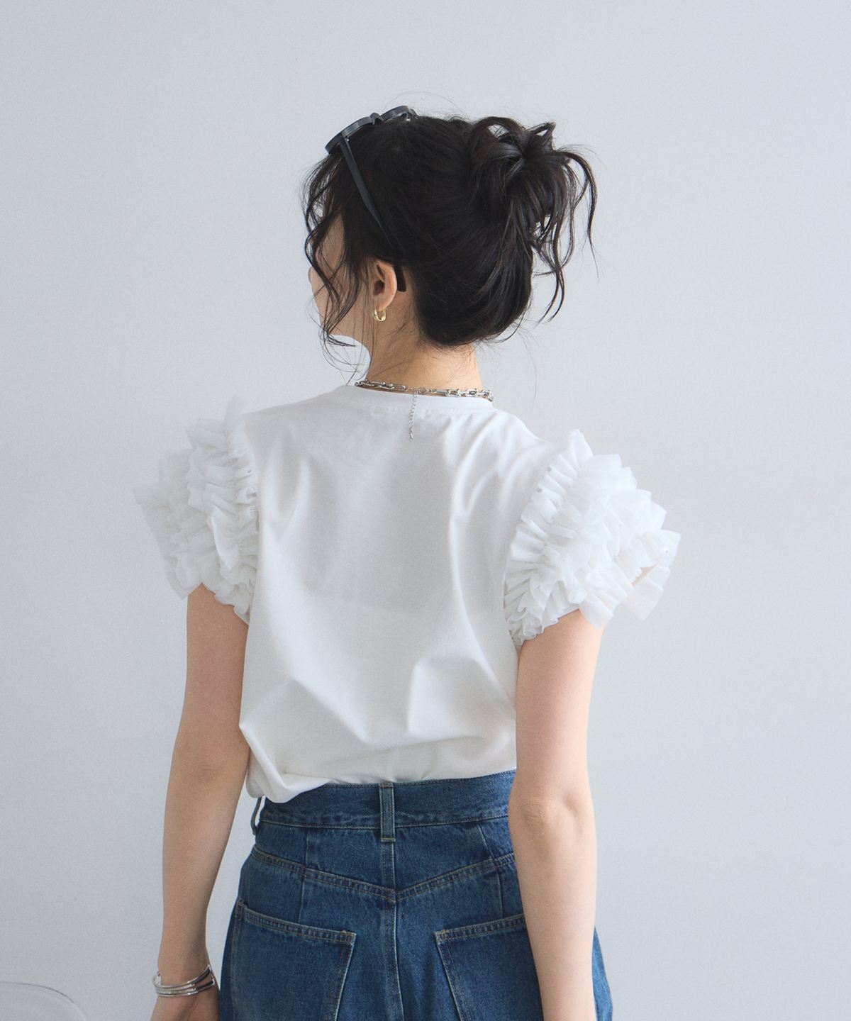 存在感のあるチュールフリルが、いつものTシャツスタイルをドラマチックにアップデートする一枚。