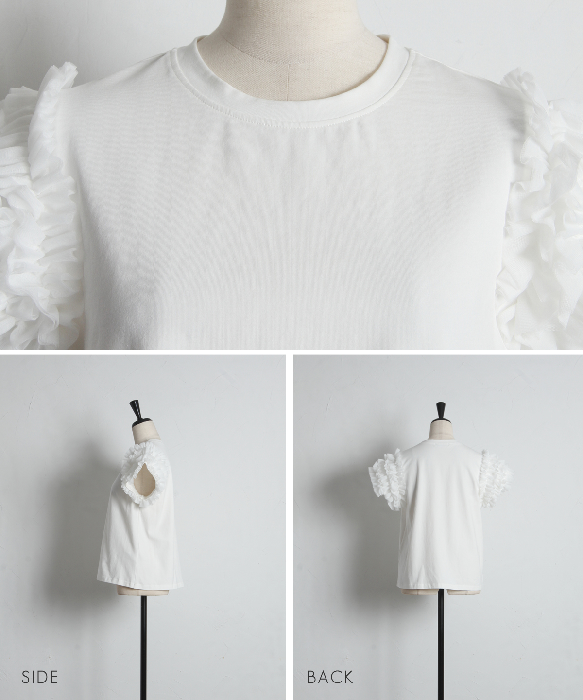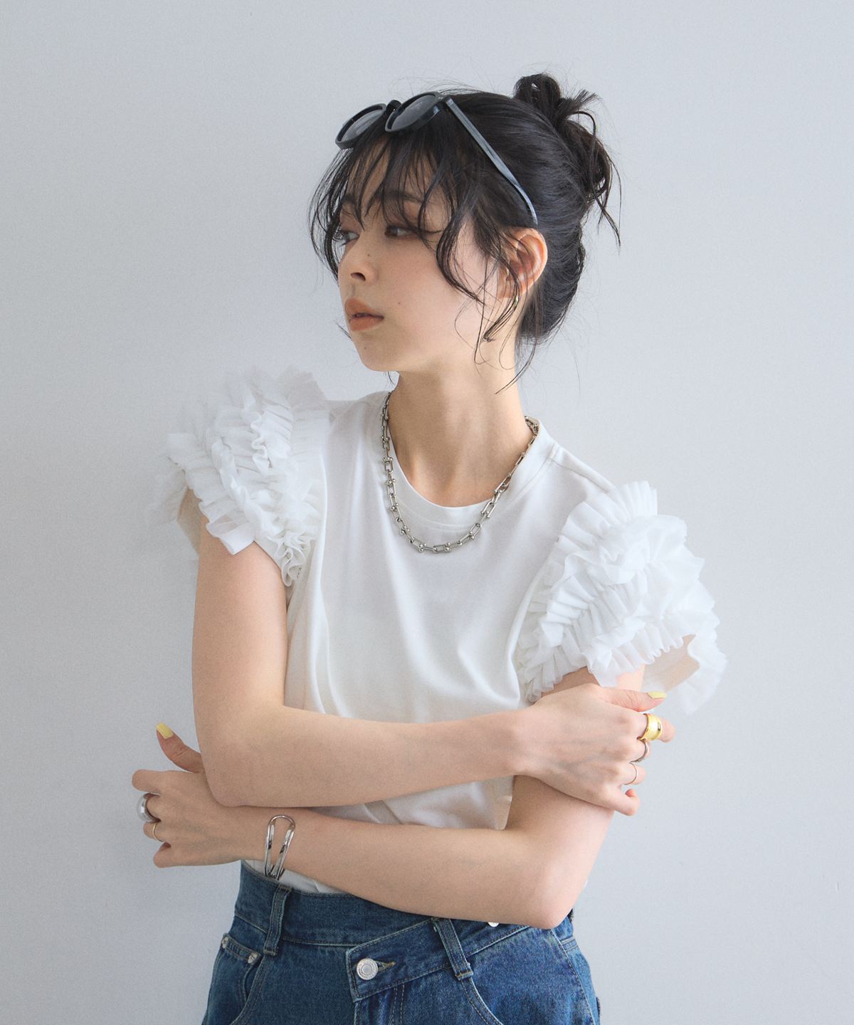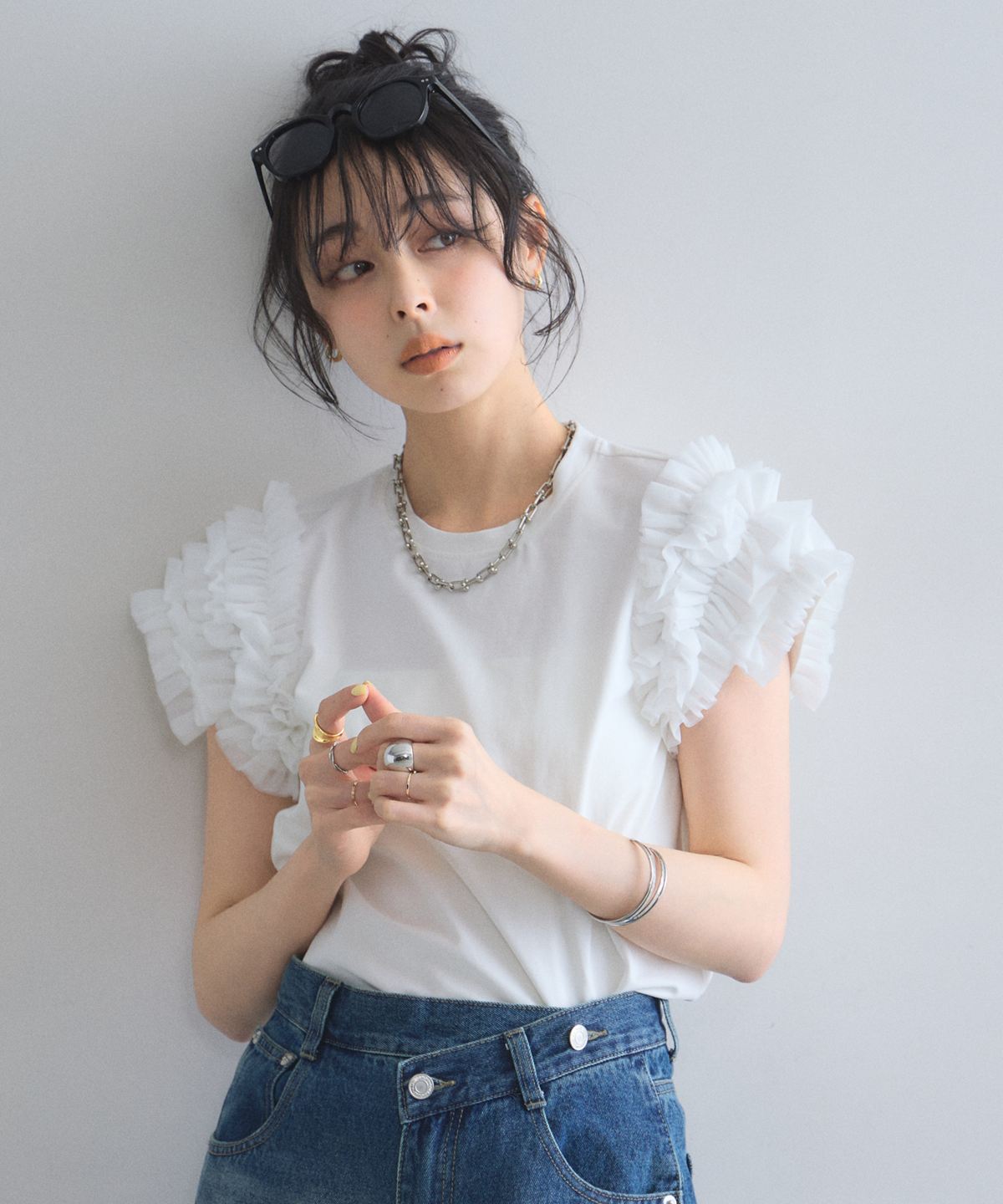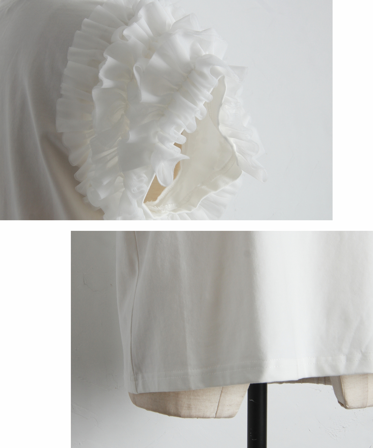 存在感のあるチュールフリルが、いつものTシャツスタイルをドラマチックにアップデートする一枚。