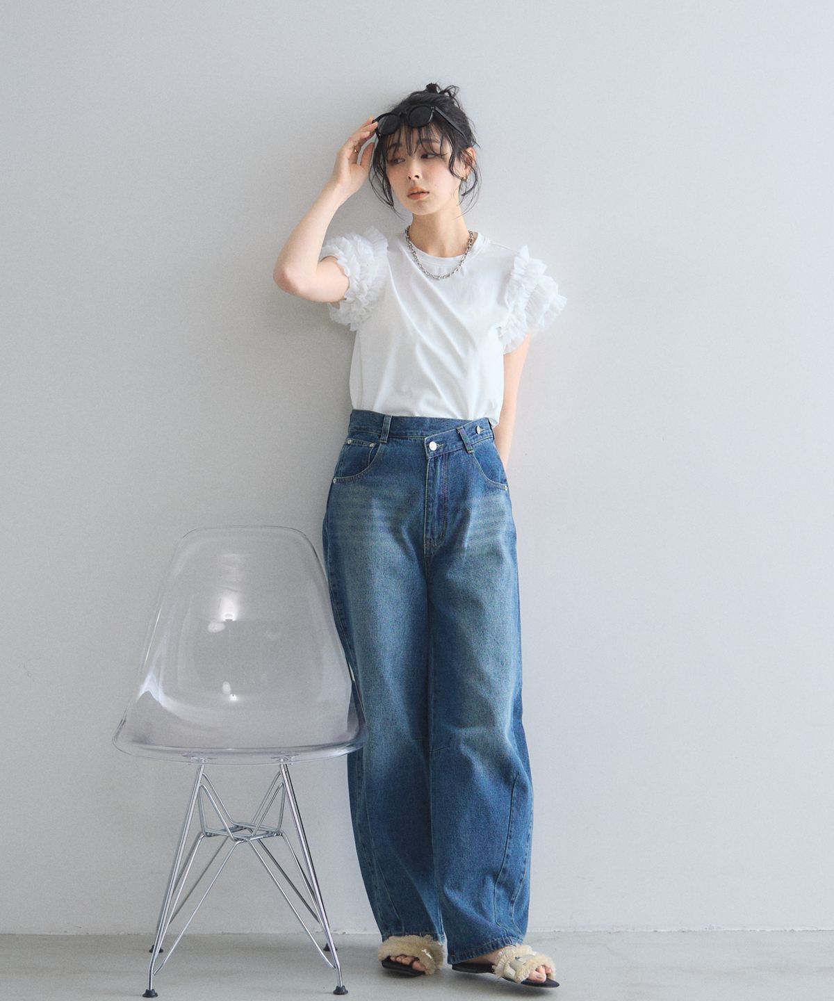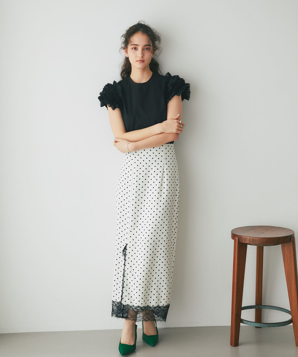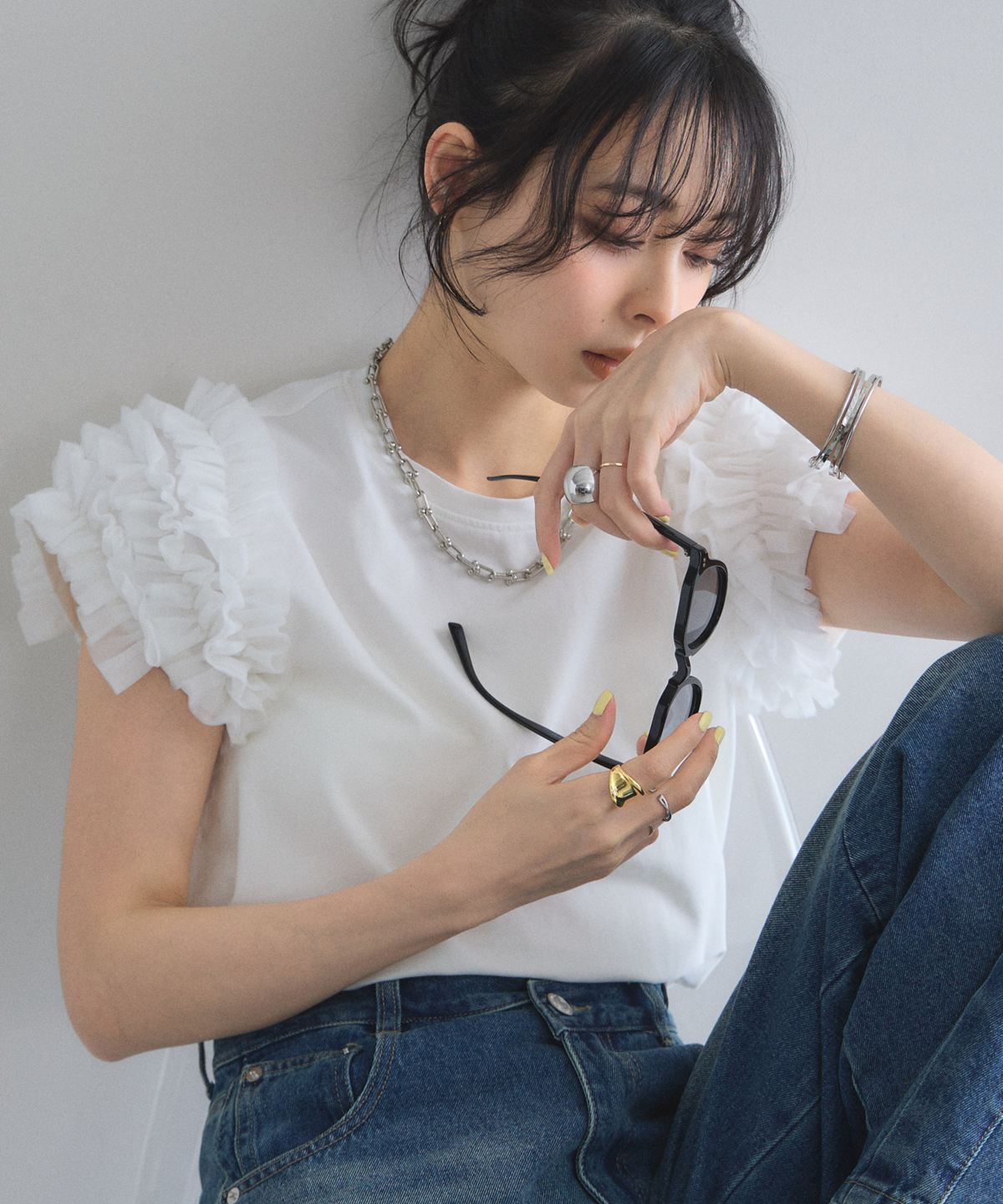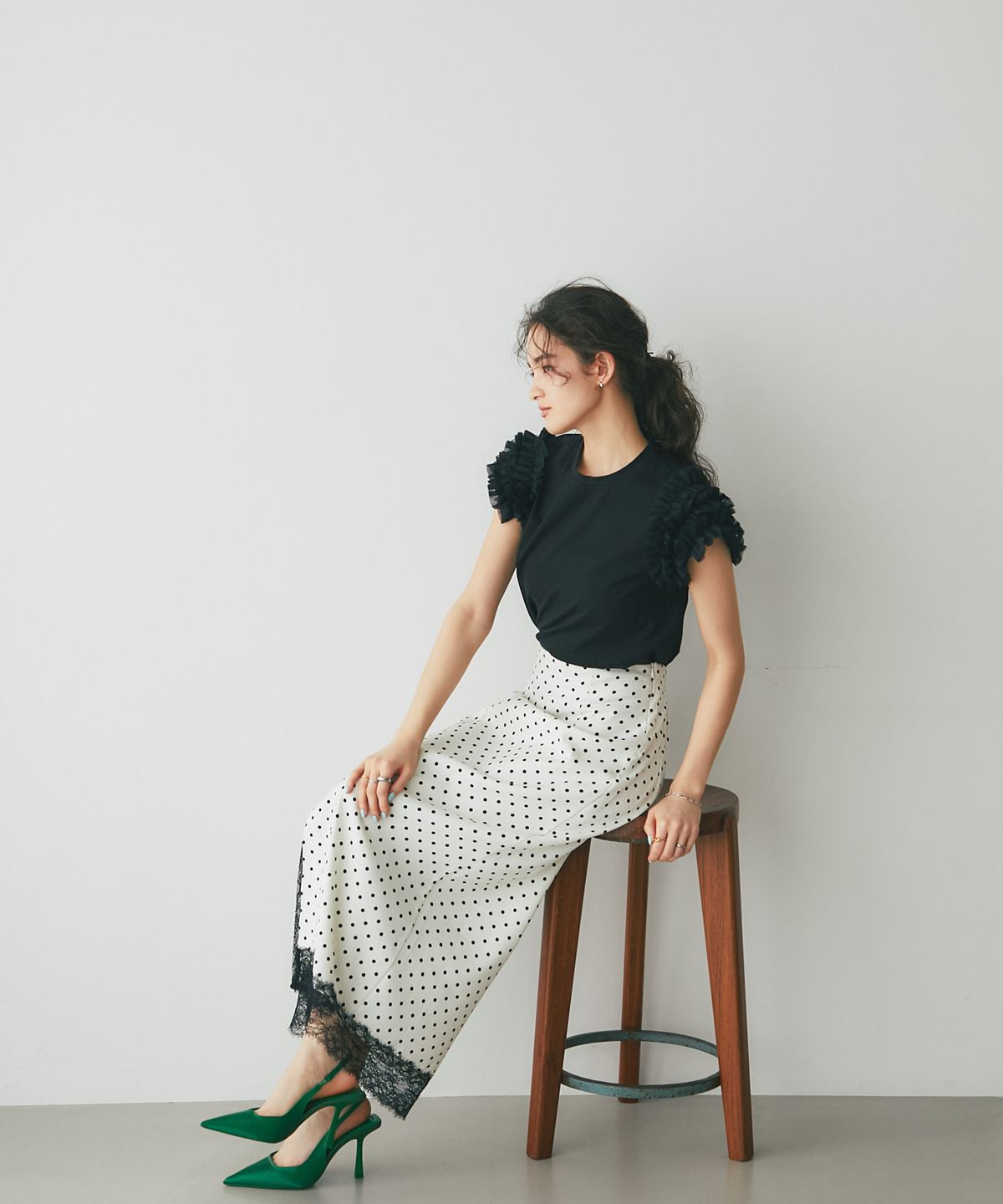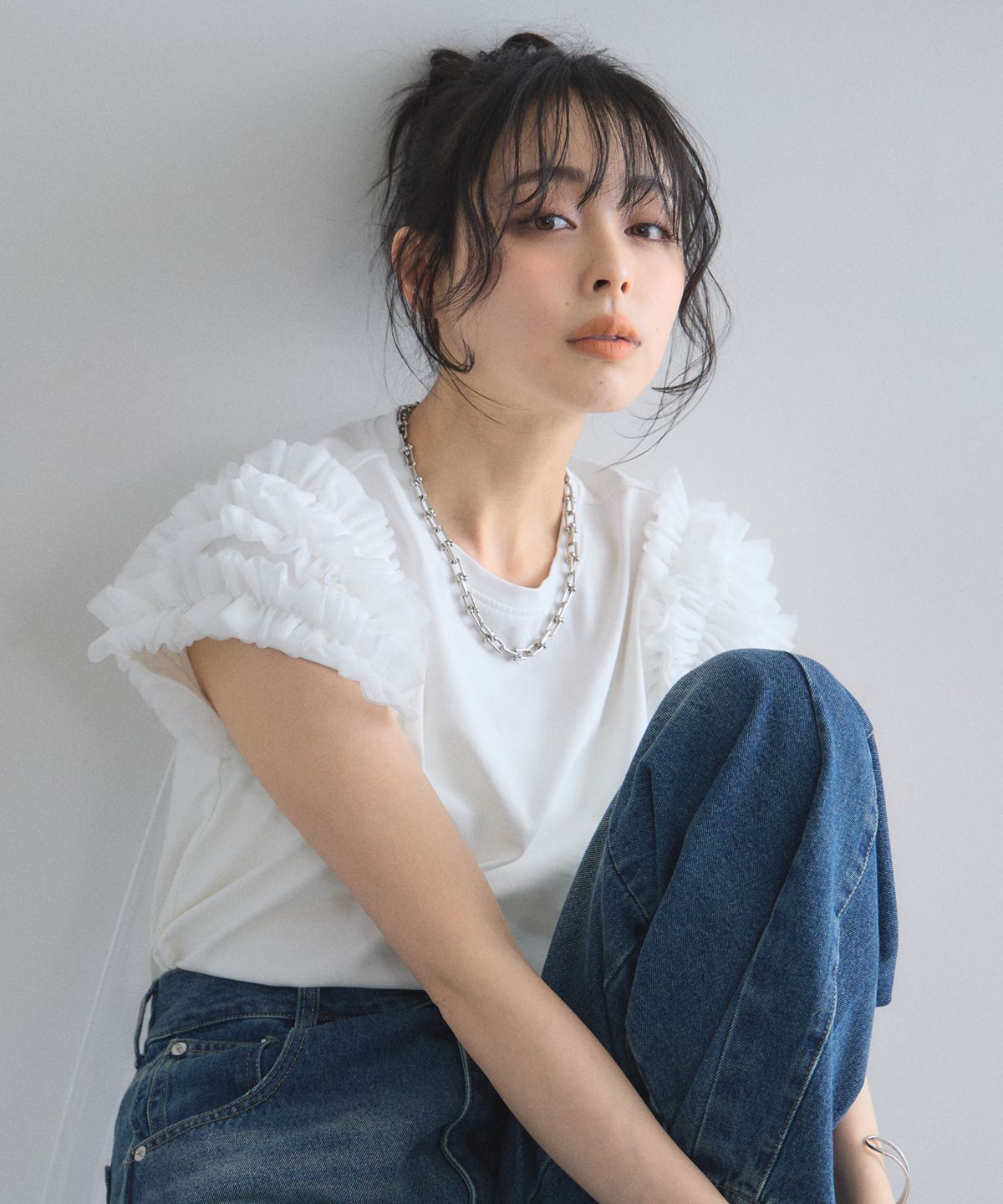 存在感のあるチュールフリルが、いつものTシャツスタイルをドラマチックにアップデートする一枚。