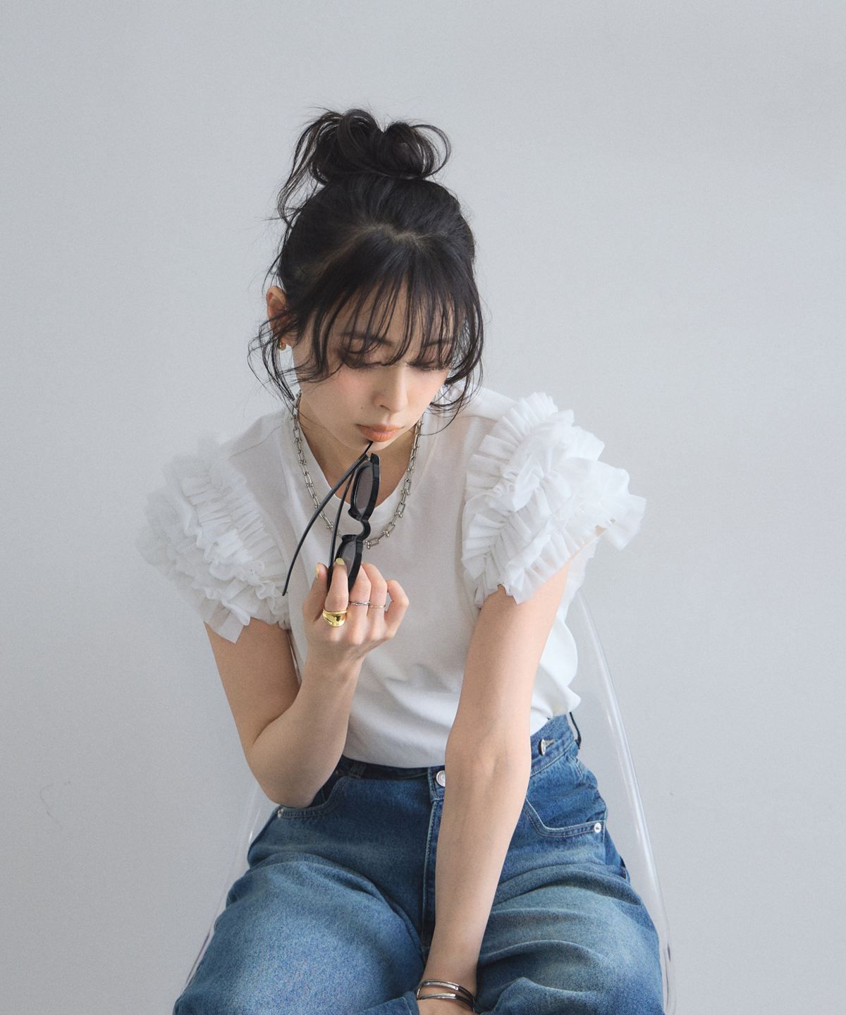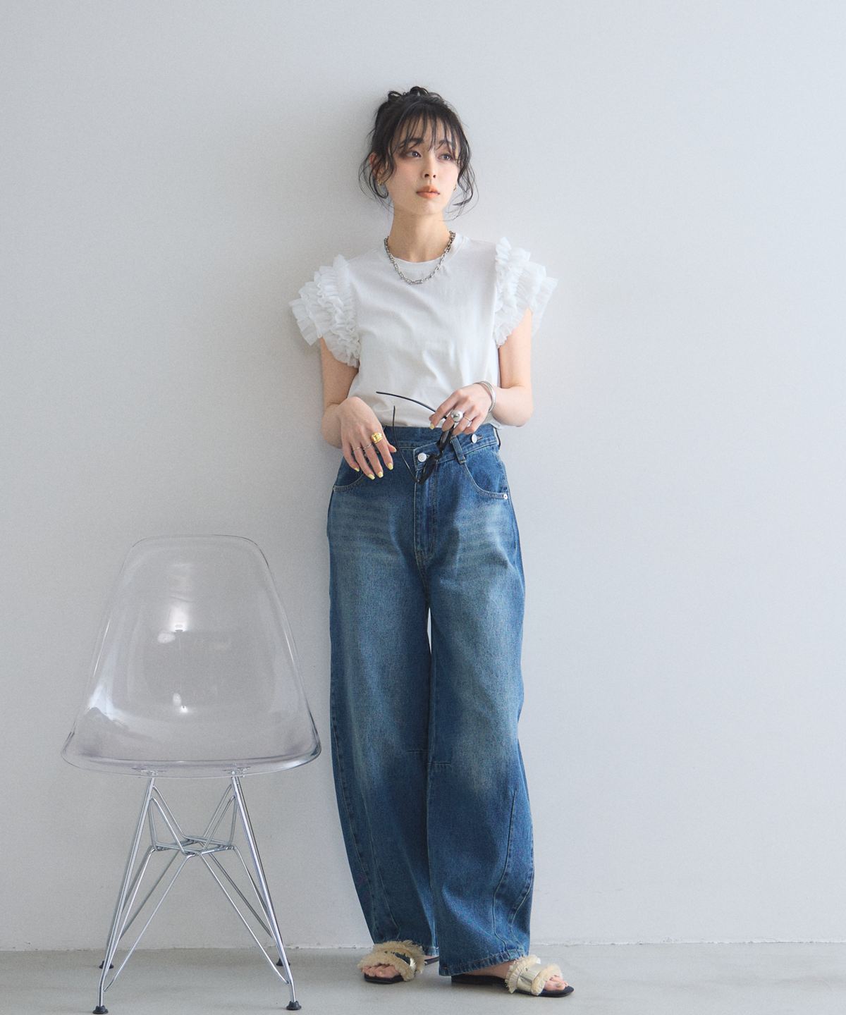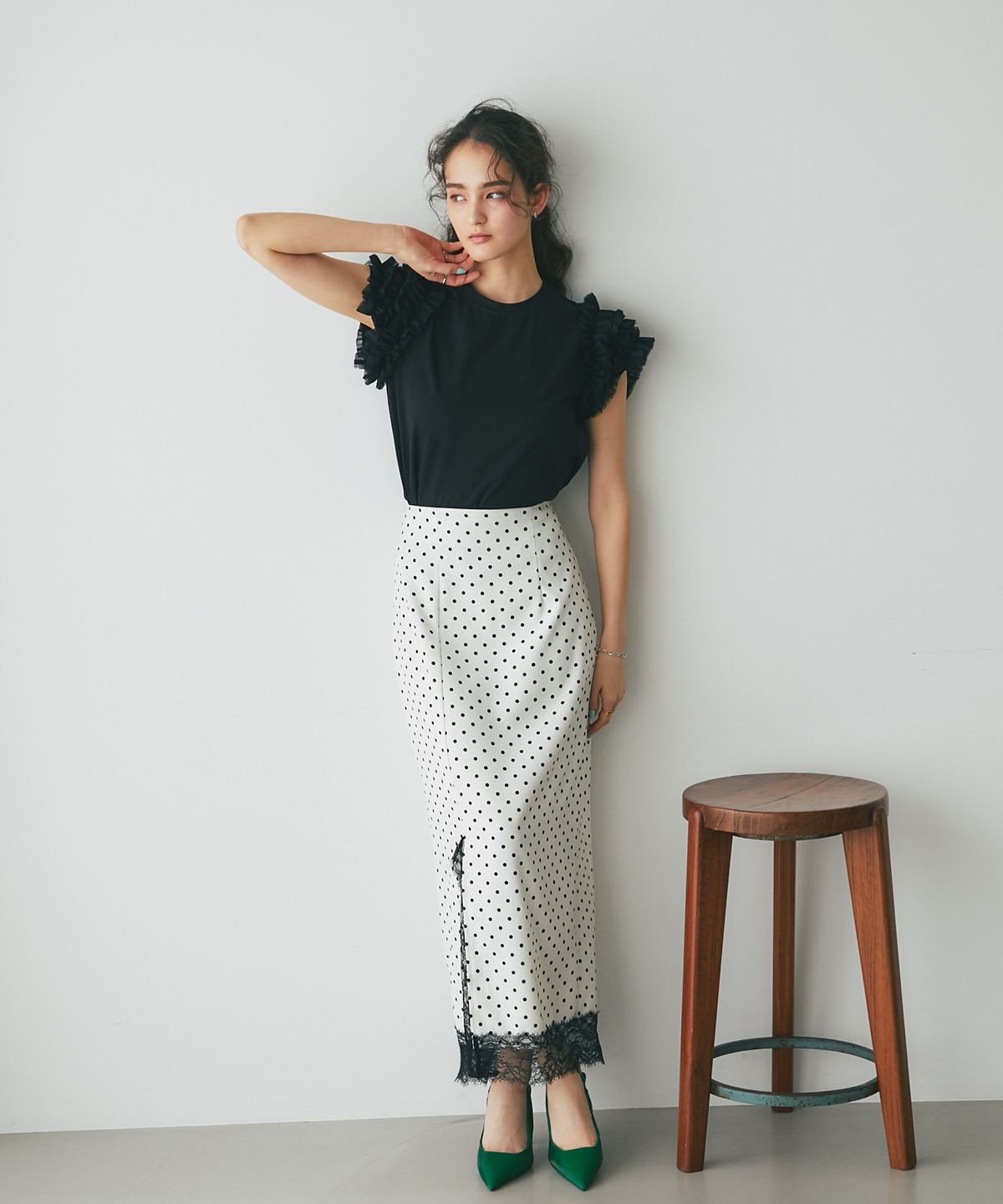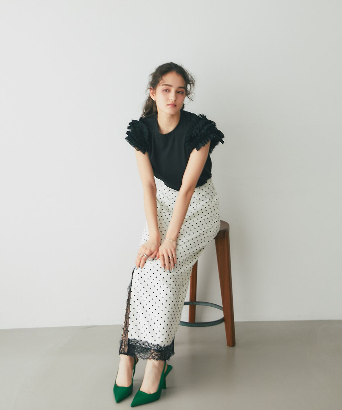 存在感のあるチュールフリルが、いつものTシャツスタイルをドラマチックにアップデートする一枚。