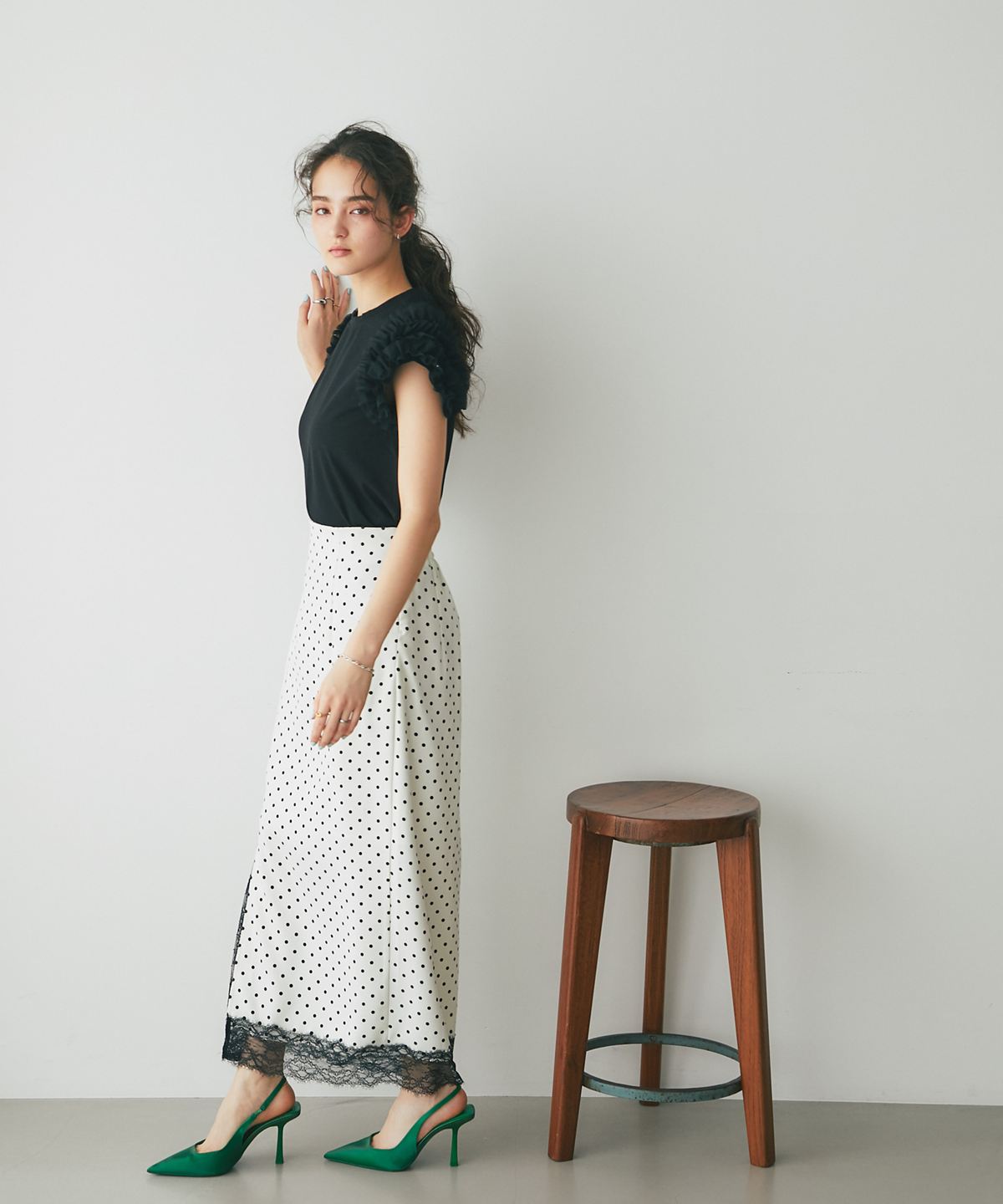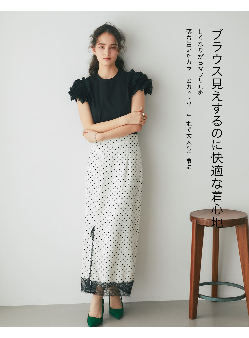 甘くなりがちなフリルを、落ち着いたカラーとカットソー生地で大人な印象に。