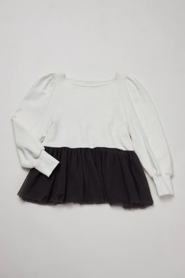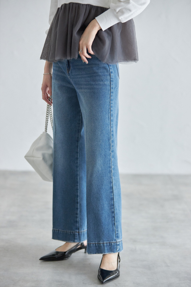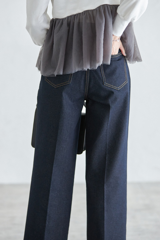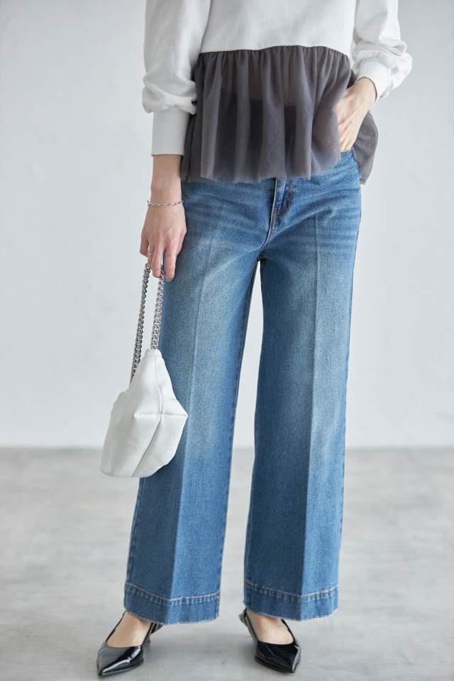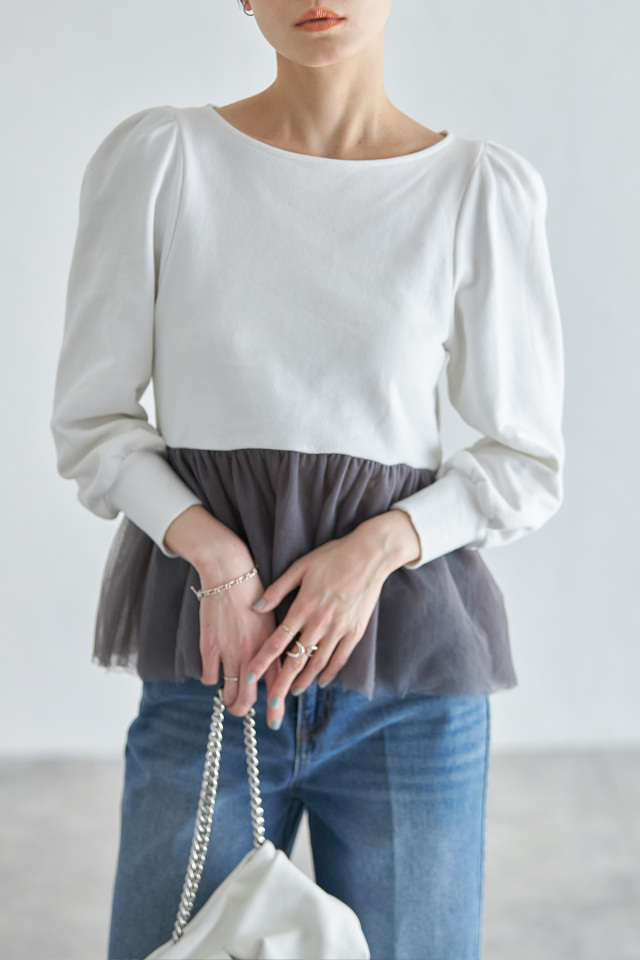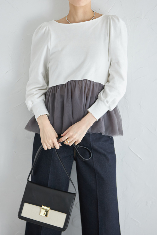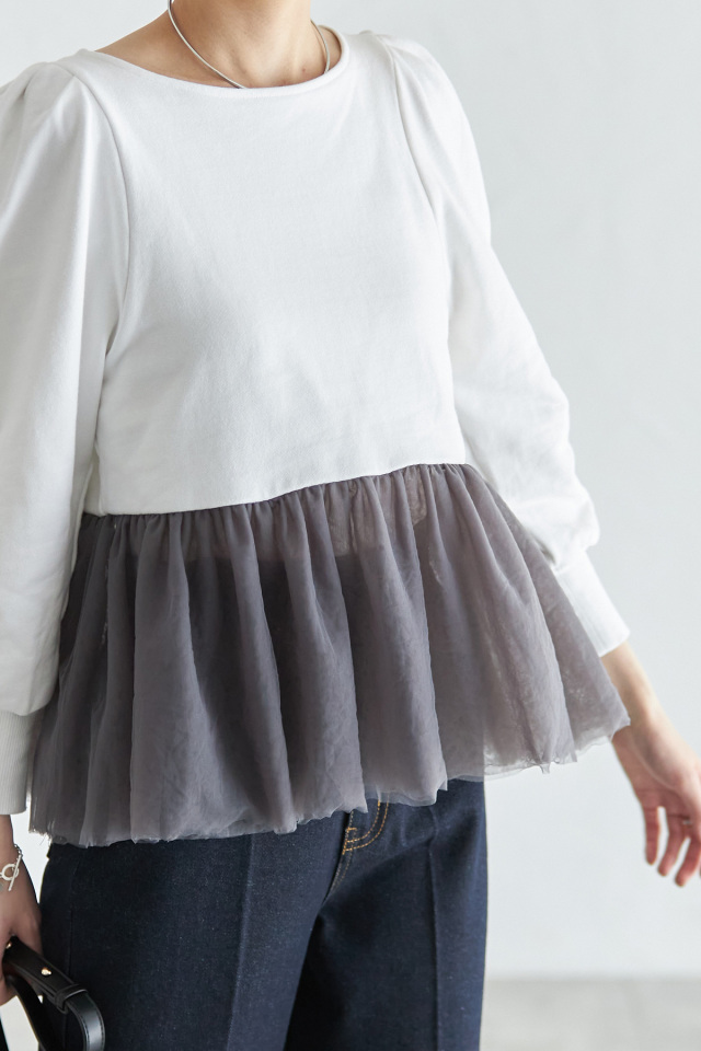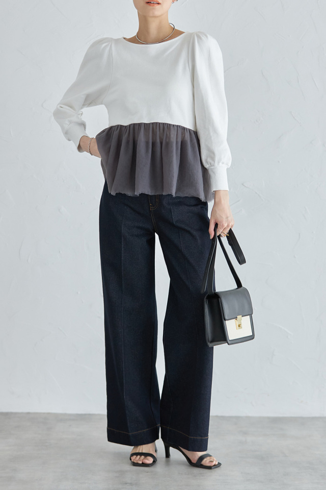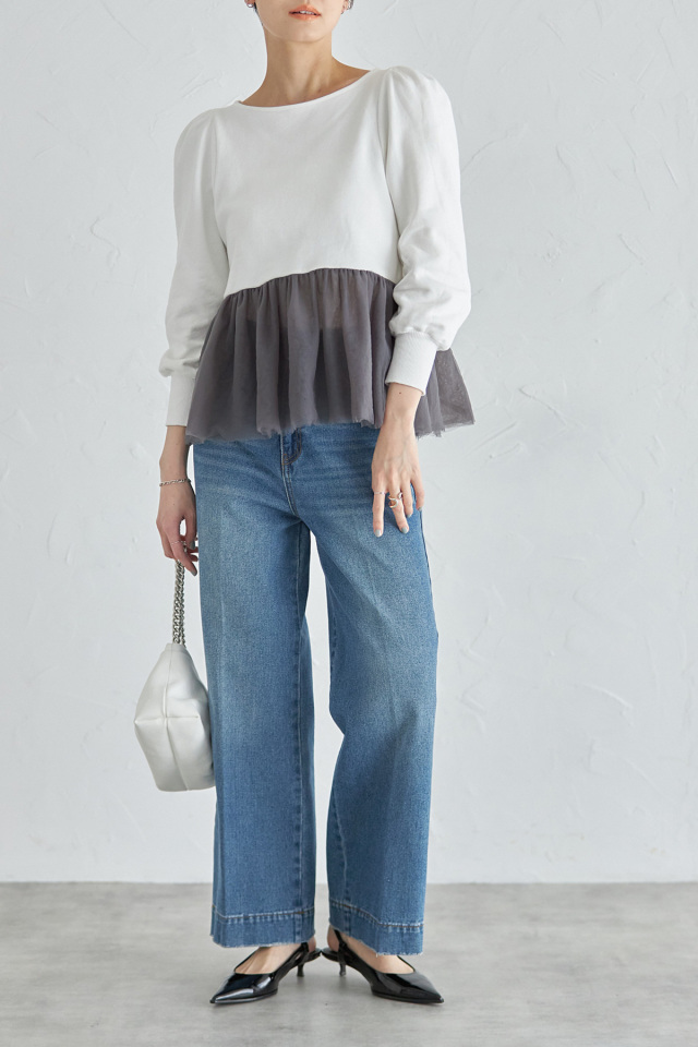 | 素材 | ヘムチュール裏毛ペプラムプルオーバー 表地/綿 100% チュール/ナイロン100% (中国製・伸縮性あり・透け感チュール部分のみあり・裏地なし) センタープレスデニムワイドパンツ 本体/綿100% (中国製・伸縮性なし・透け感なし・裏地なし) |