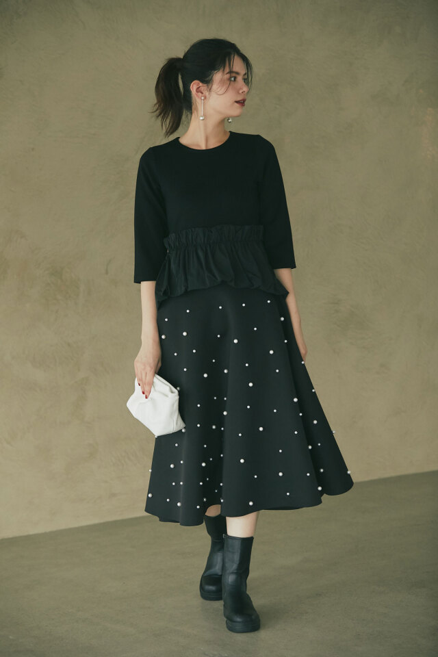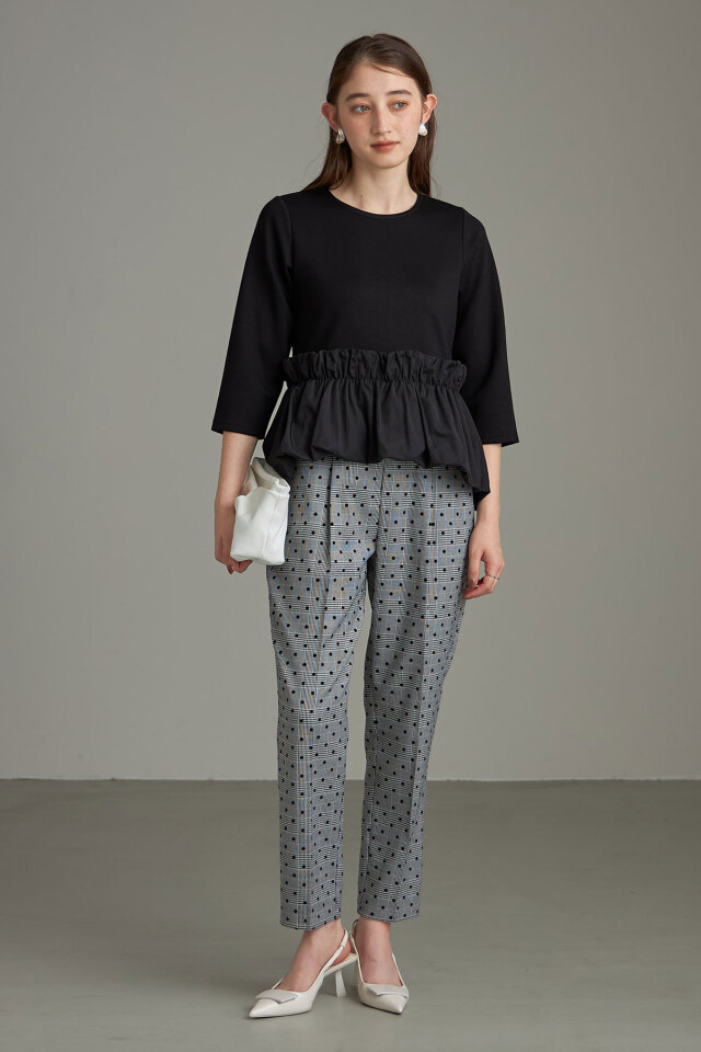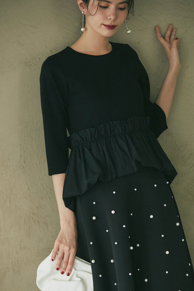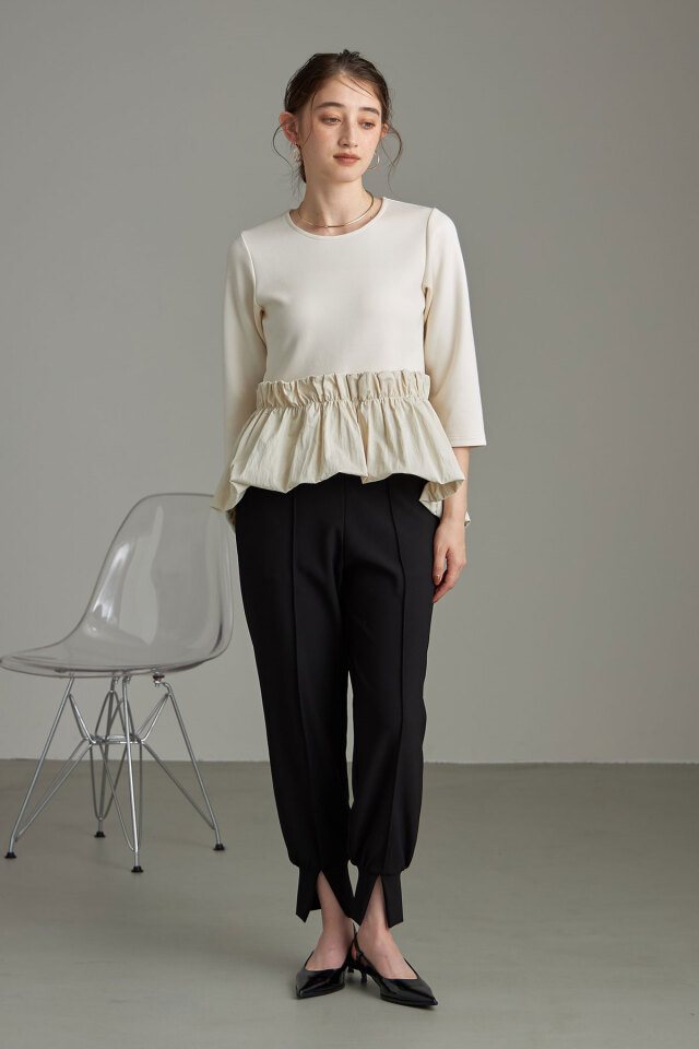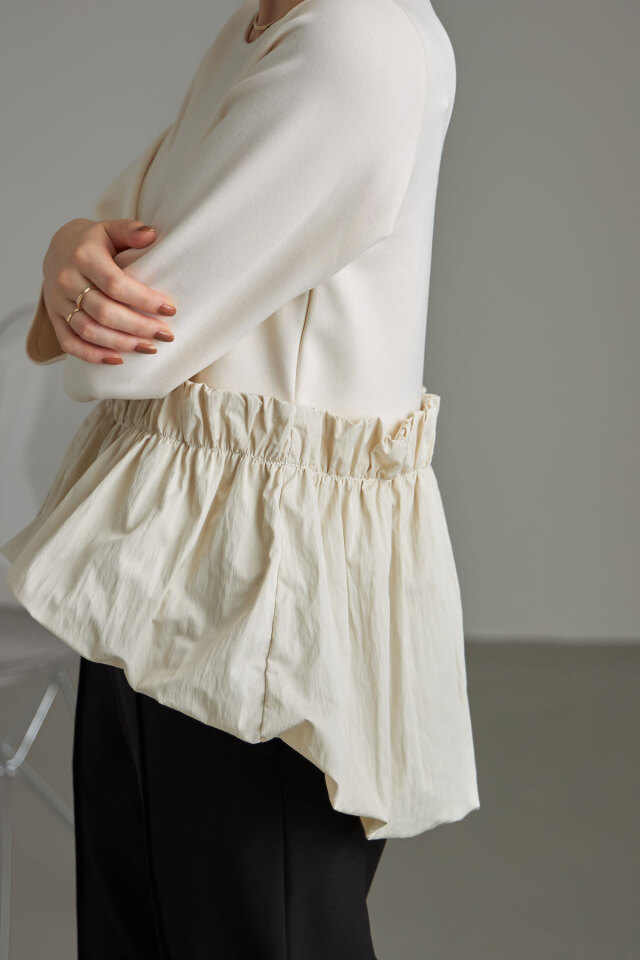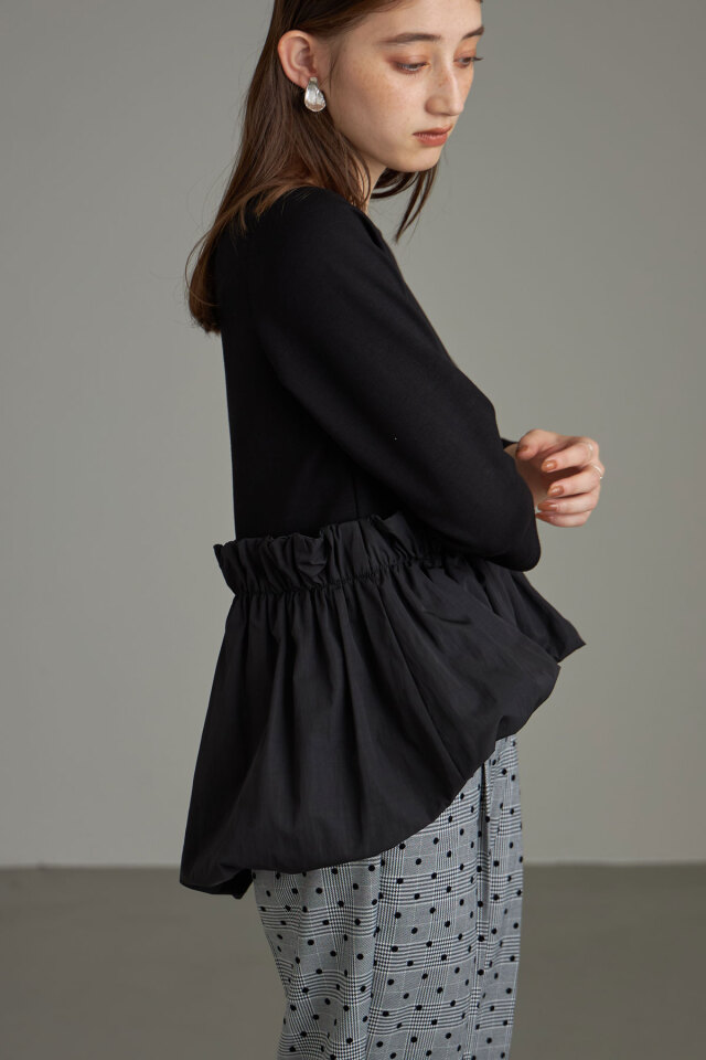 身頃/レーヨン55% ポリエステル40% ポリウレタン5% 裾バルーン部分/ポリエステル70% ナイロン30% (中国製・身頃伸縮性あり・透け感なし・裏地なし) |