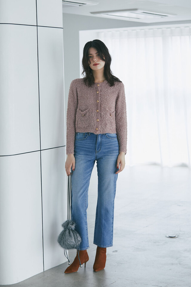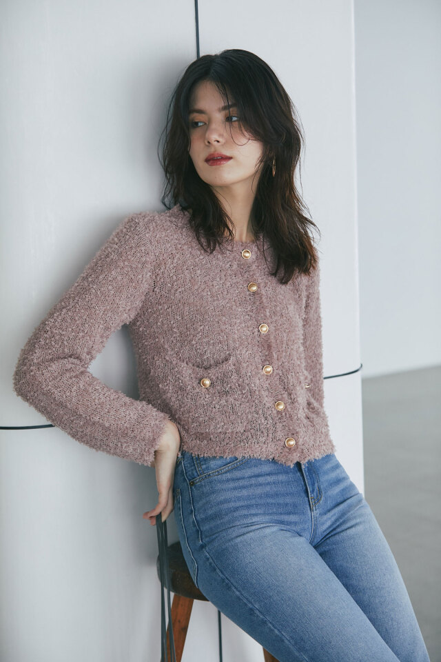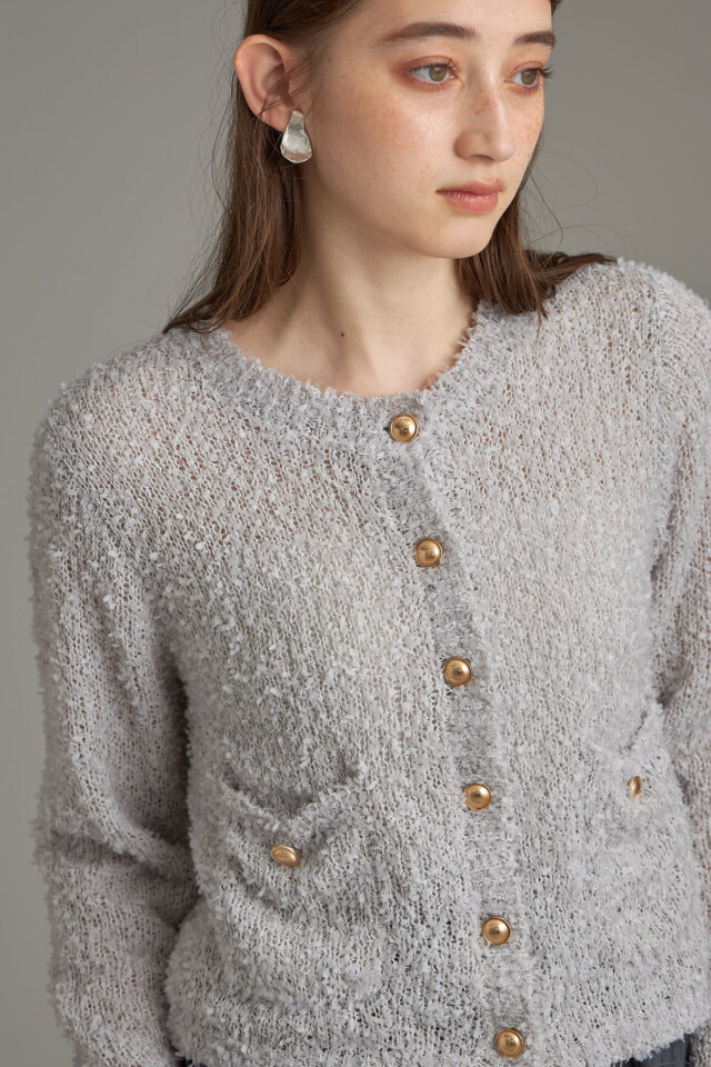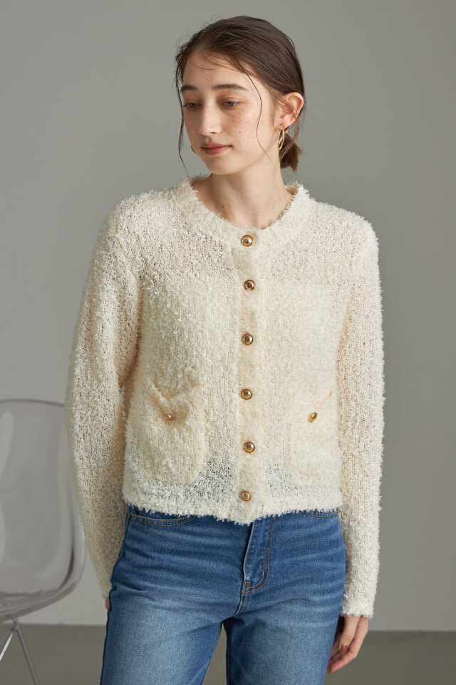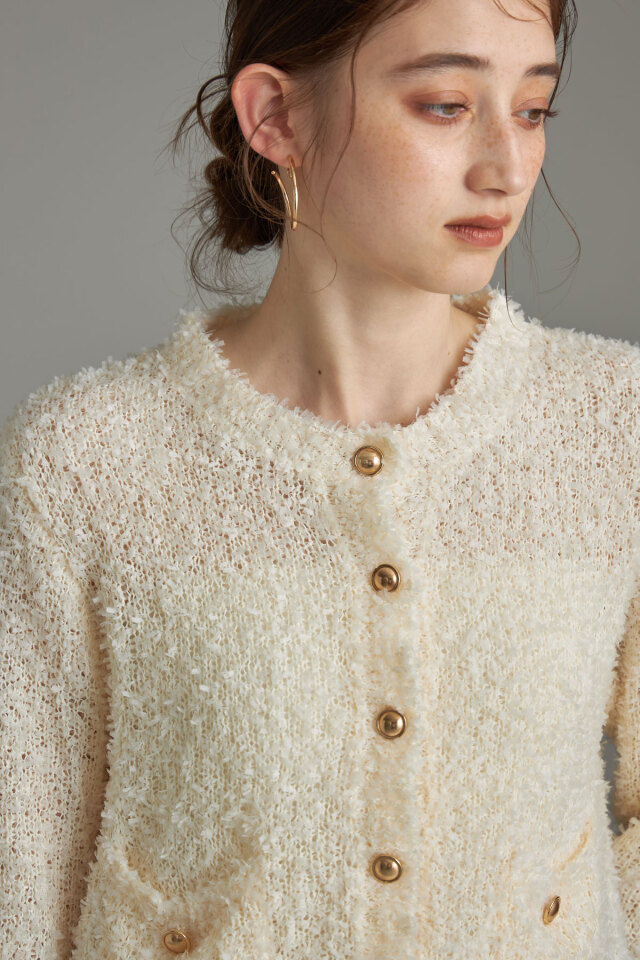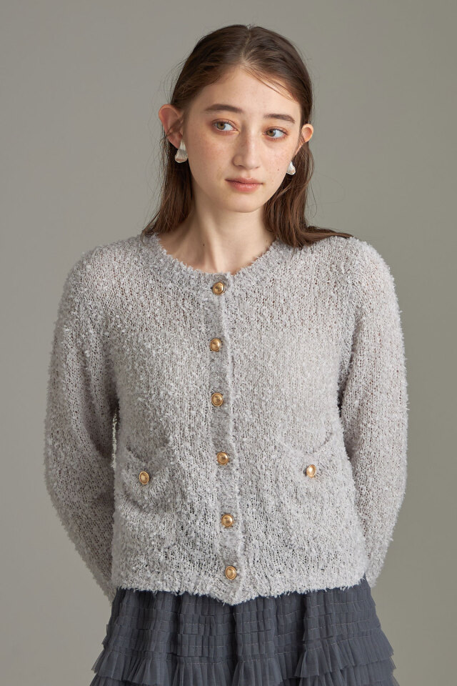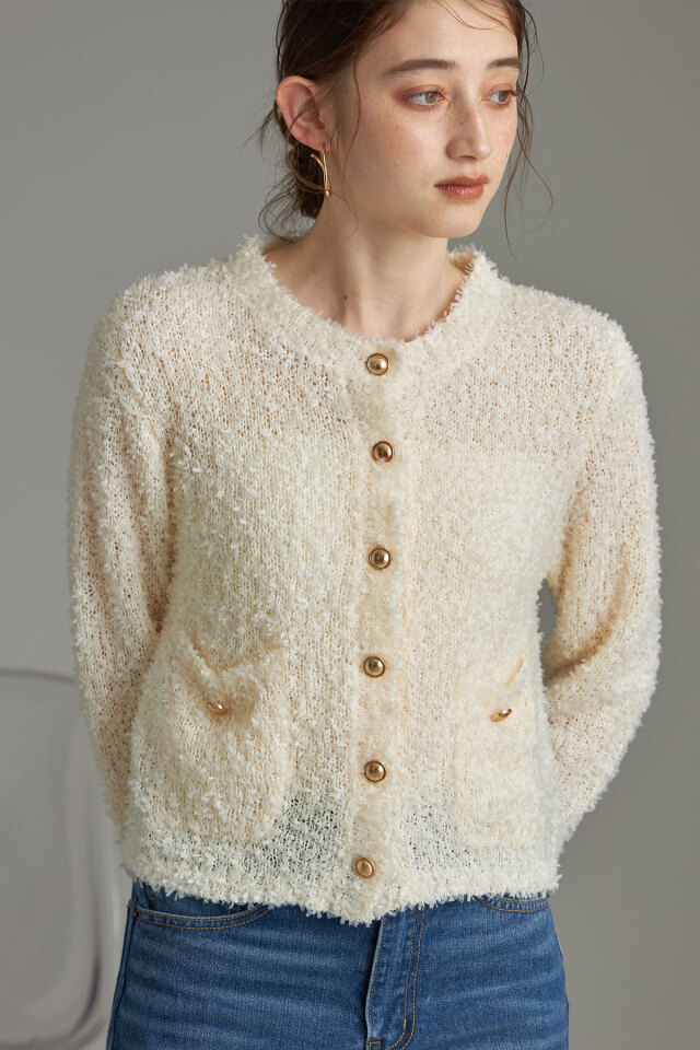 | 商品説明 | ≪ Attention:販売日、在庫状況はWEBと店舗と異なります。予めご了承くださいませ。≫ トレンドのテープシャギー素材でシーズン先取りコーデにおすすめ!テープシャギーニットカーディガン 程よく透け感があり初秋からシーズンコーデを楽しめる素材のカーディガン。 ほっこりした素材感のなかに、きらっと光るボタンがワンポイントになってくれるから、 1枚でもしっかりメリハリのあるアイテムです◎ |