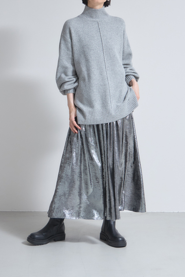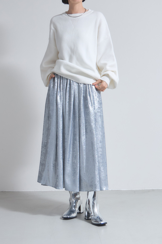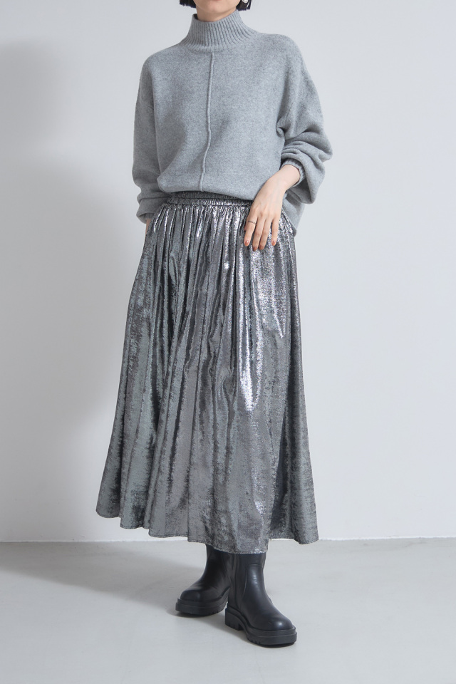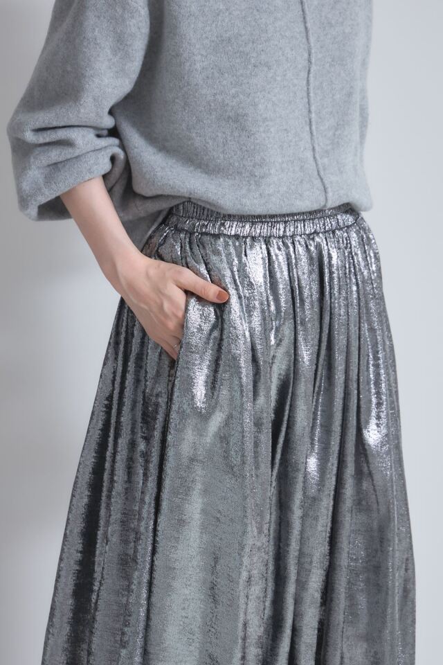 | 商品説明 | : | トレンドのメタリック素材でコーデをアップデートする、メタリックギャザースカート シンプルで何にでも合わせやすいギャザーが入ったロングスカートシルエットながら、 素材にトレンドのメタリックを取り入れ、普段のコーデを格上げしてくれる1枚に仕上げました! ウエストゴムで伸縮もよく、インでもアウトでも着られるのも嬉しい◎ |
