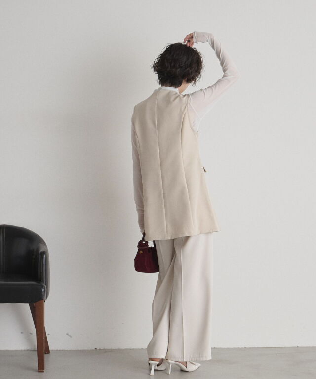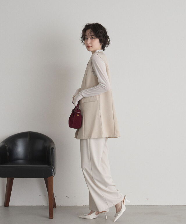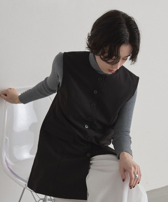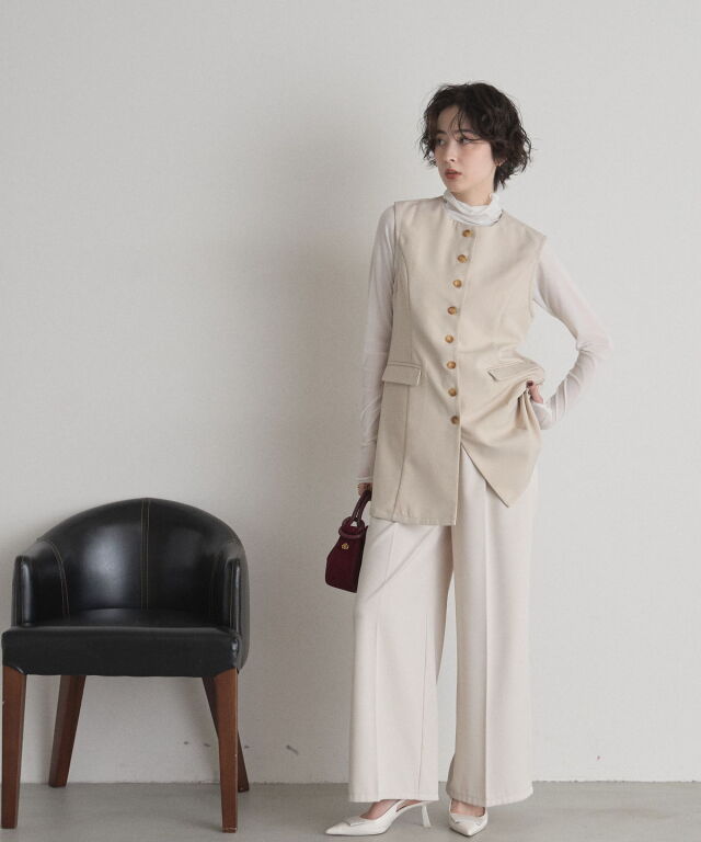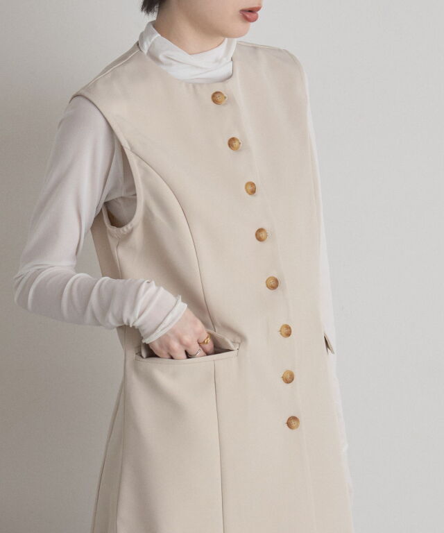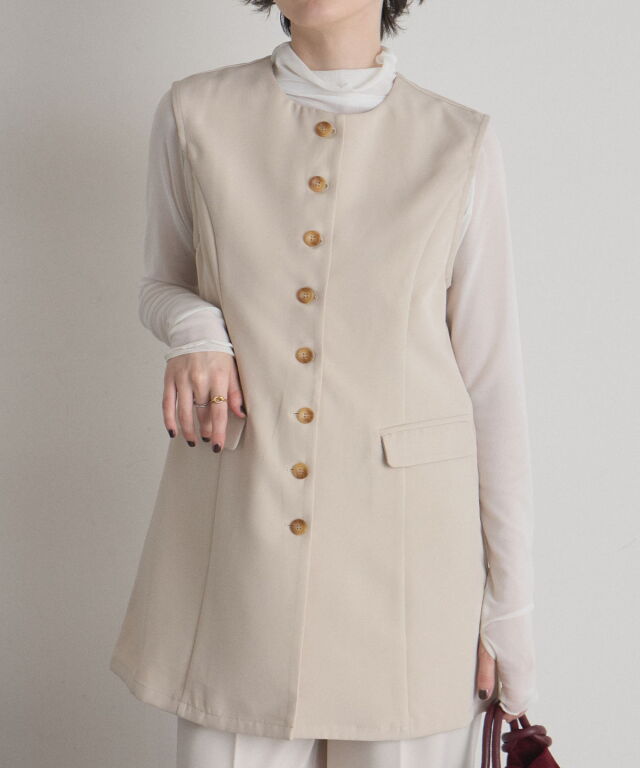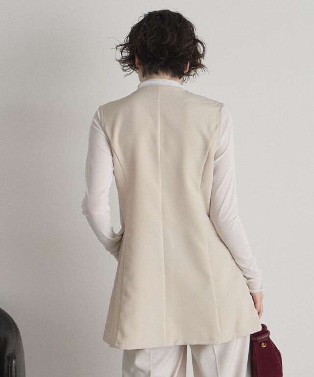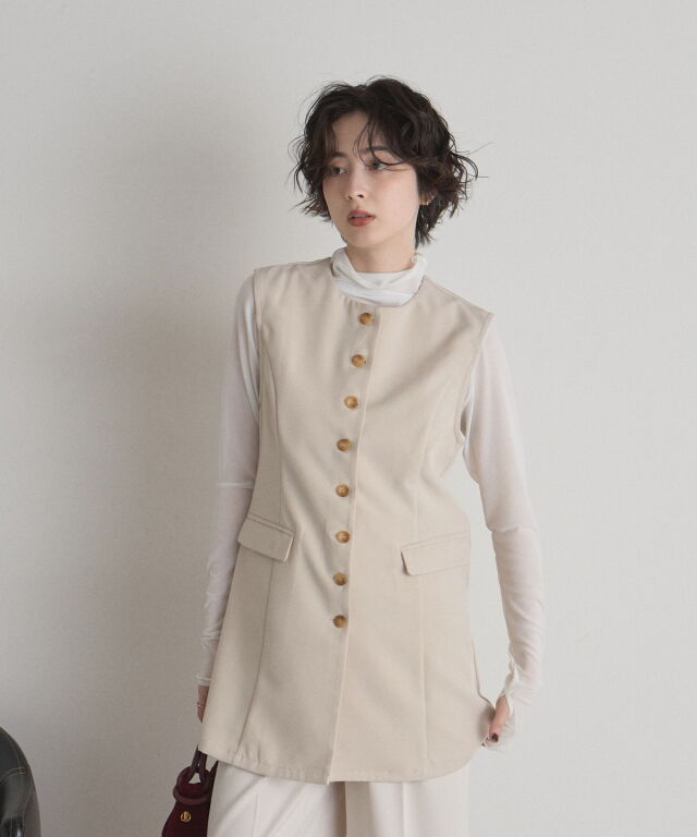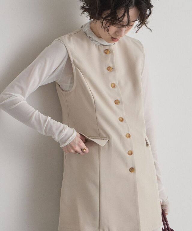 | 商品説明 | : | "ハレの日"も普段使いにも楽しめるクラシカルな印象のシンプルジレ ▼POINT ・裾に向かって流れるように広がるセミフレアの綺麗なシルエット ・大人可愛いノーカラーで上品な雰囲気も ・長めの着丈で体型カバーもしながらおしゃれに見えるジレ ・カジュアルからキレイめまで幅広く着られるアイテム |