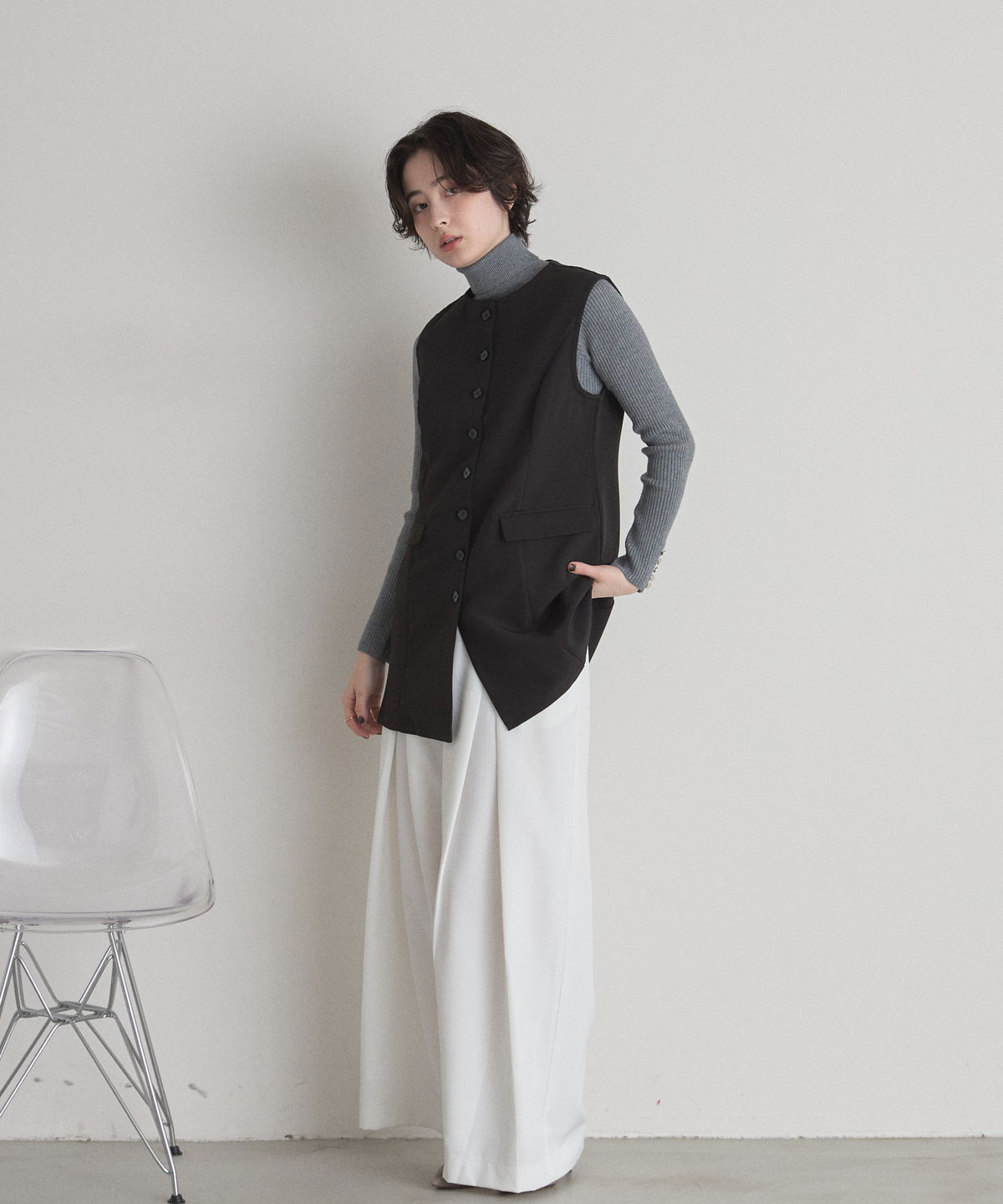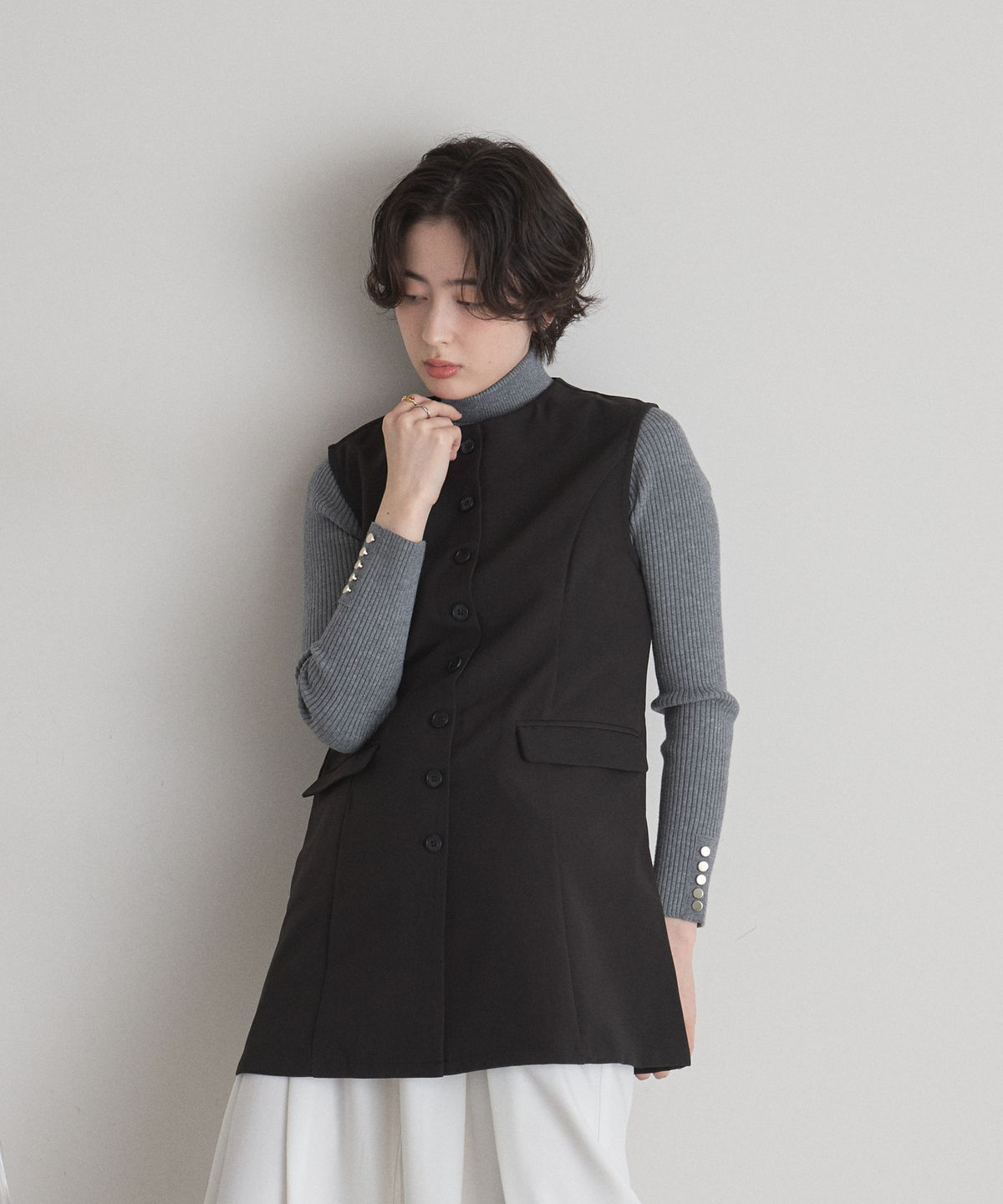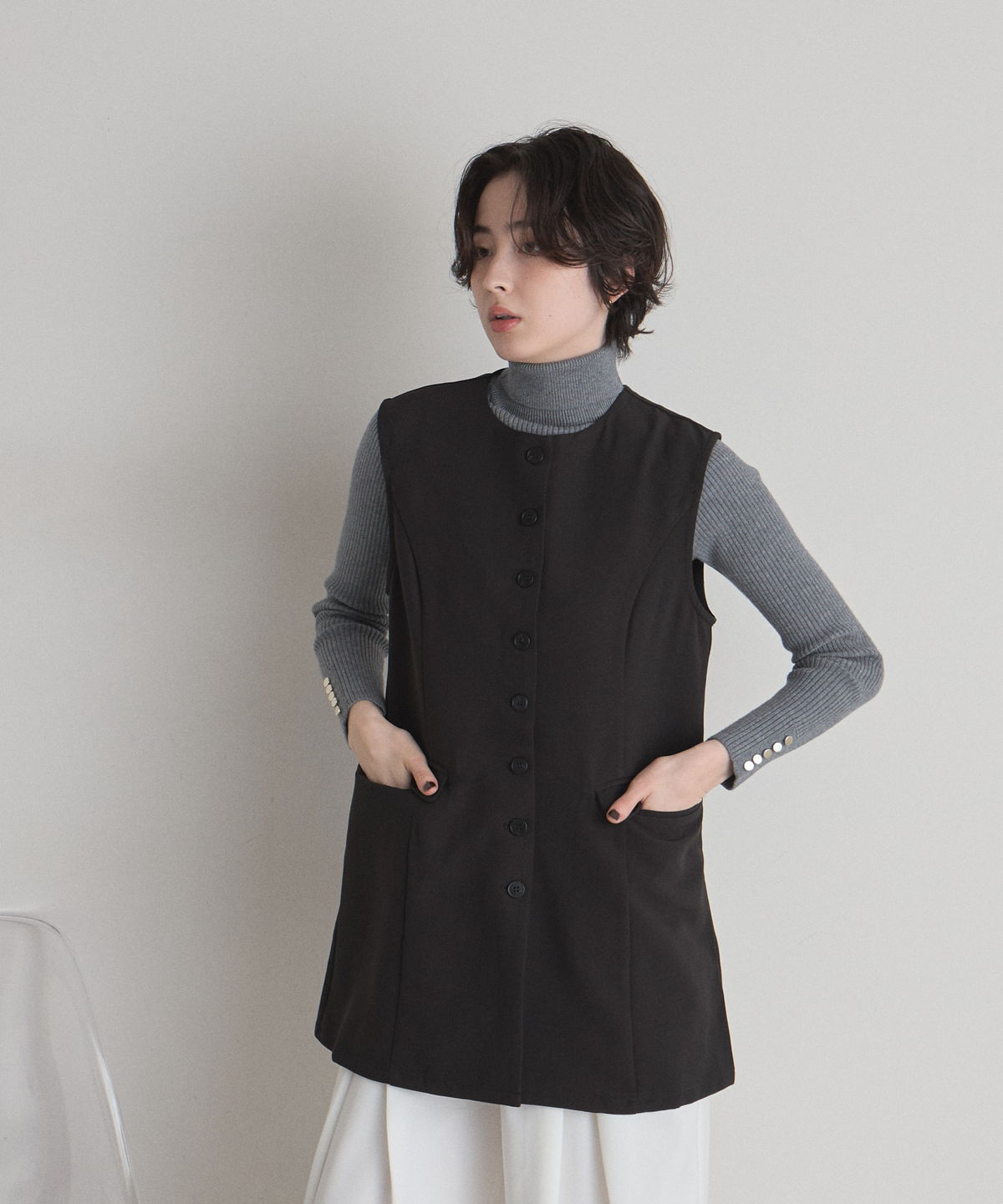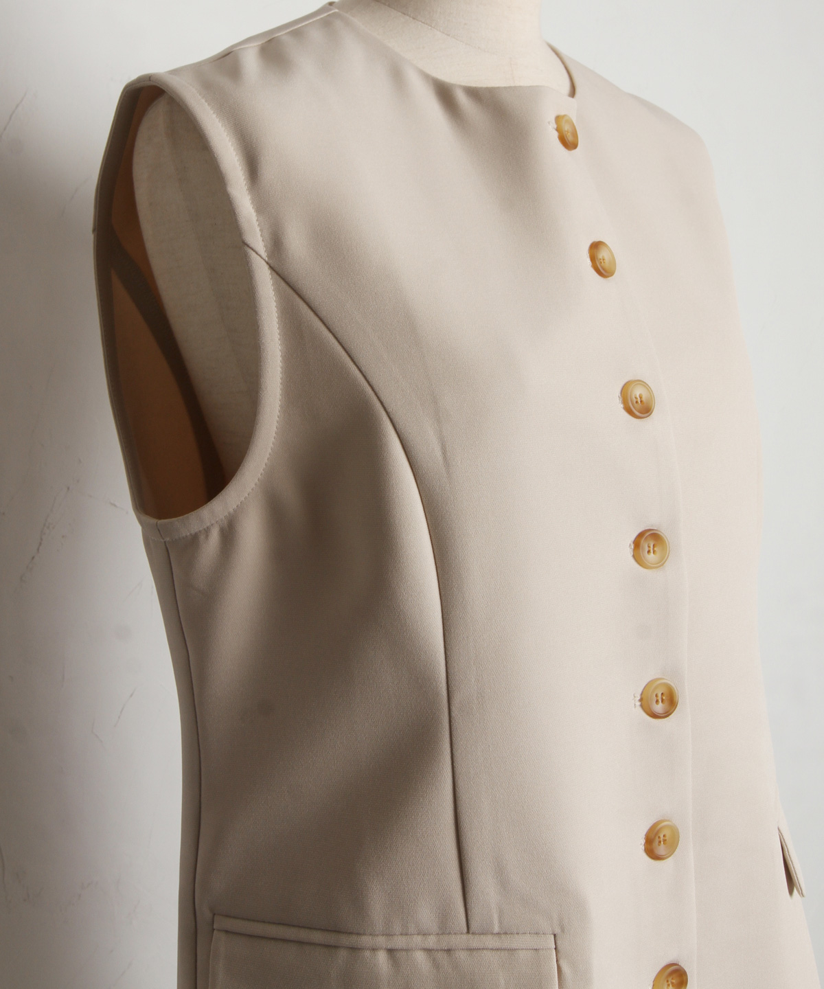 | 商品説明 | : | "ハレの日"も普段使いにも楽しめるクラシカルな印象のシンプルジレ ▼POINT ・裾に向かって流れるように広がるセミフレアの綺麗なシルエット ・大人可愛いノーカラーで上品な雰囲気も ・長めの着丈で体型カバーもしながらおしゃれに見えるジレ ・カジュアルからキレイめまで幅広く着られるアイテム |