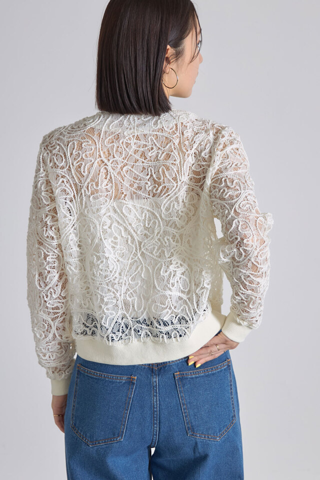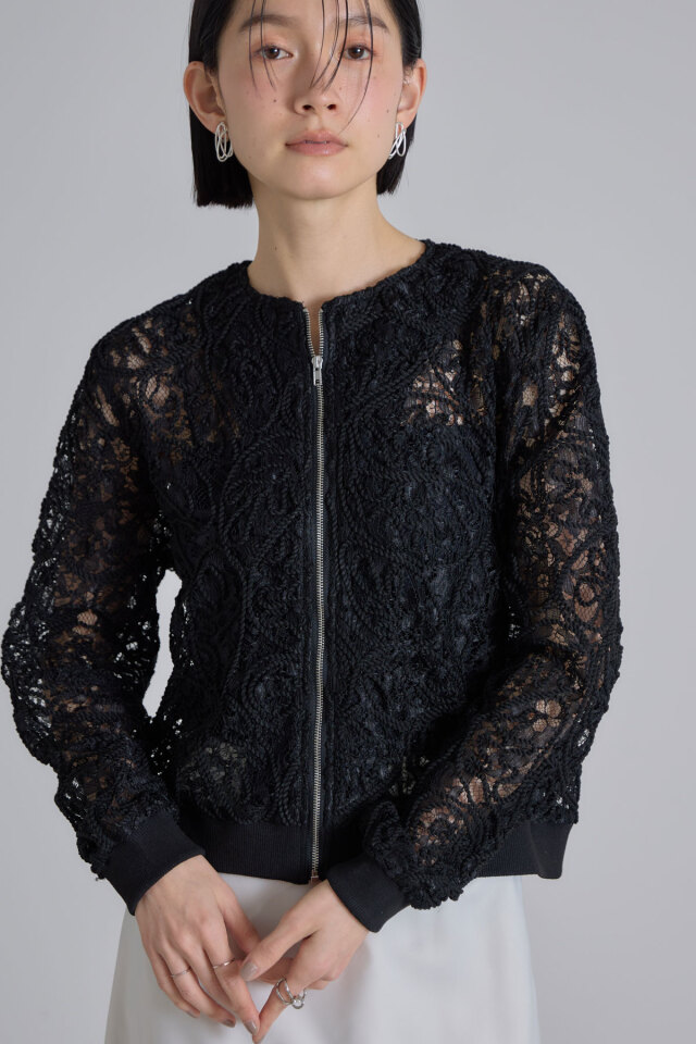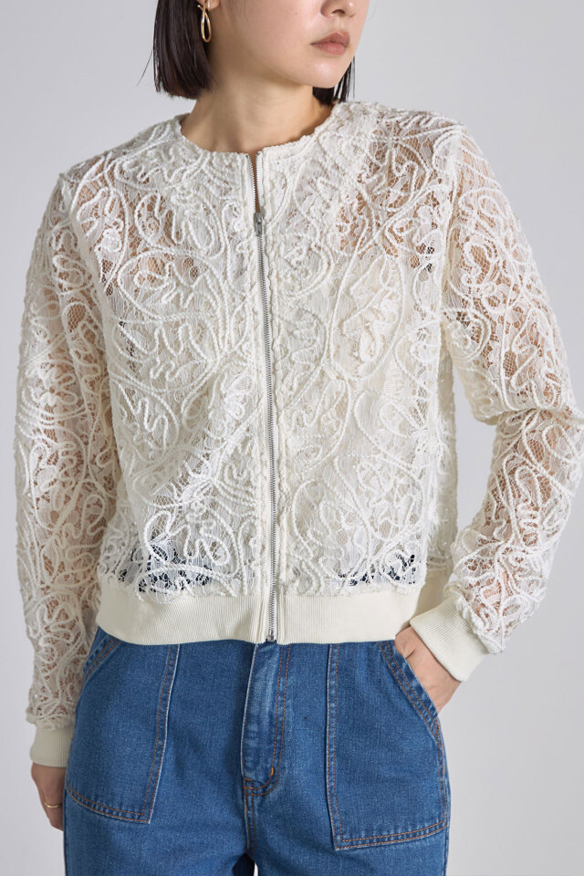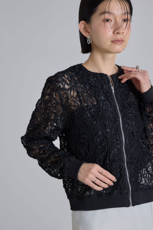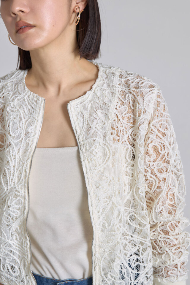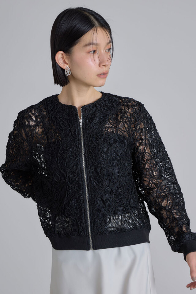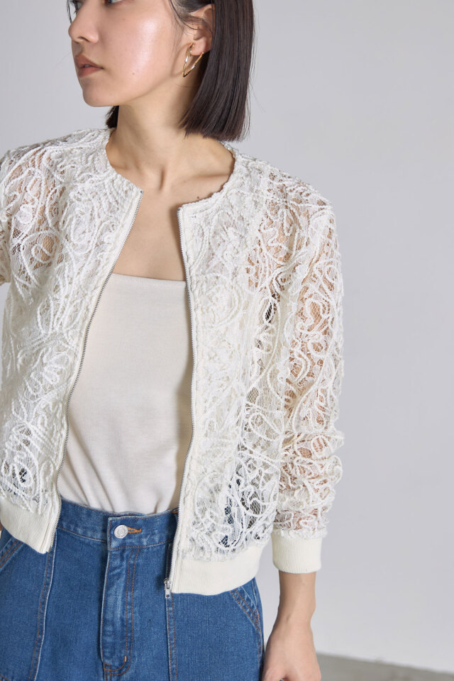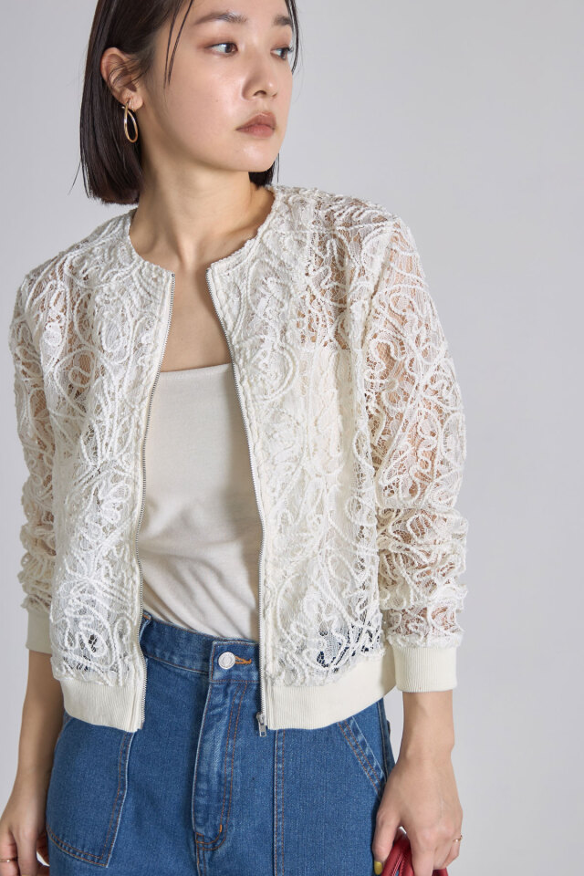 | 商品説明 | : | カジュアルなシルエットにロープレースの上品さをプラスし、女性らしく抜け感のあるブルゾン! 軽やかな素材感でさらっと羽織れるのが◎気になる部分を程よくカバーしながら、華奢見えを叶える1枚です! デニムやワイドパンツと合わせたカジュアルスタイルはもちろん、スカートやワンピースに羽織って甘辛ミックスコーデも◎ |