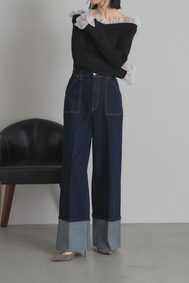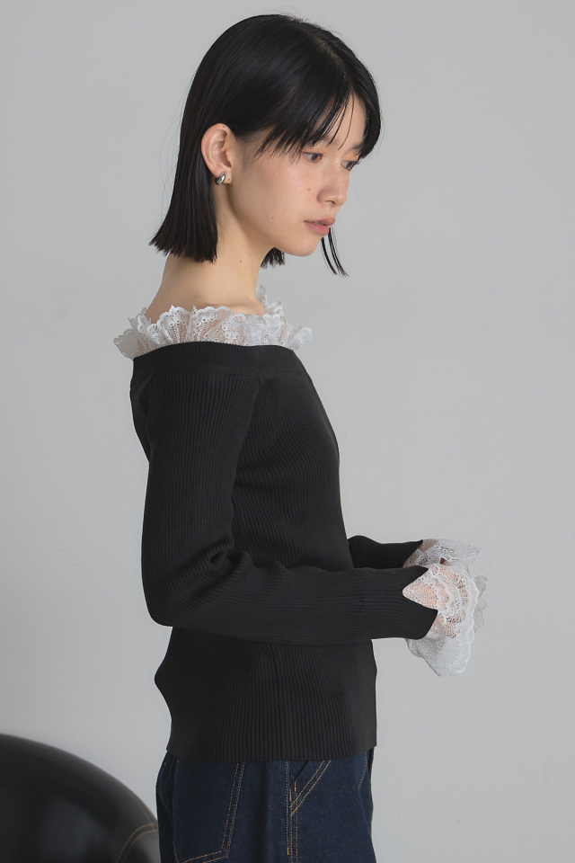 首元と袖口にあしらわれた繊細なレースが、シンプルなニットスタイルに華やかさをプラスします