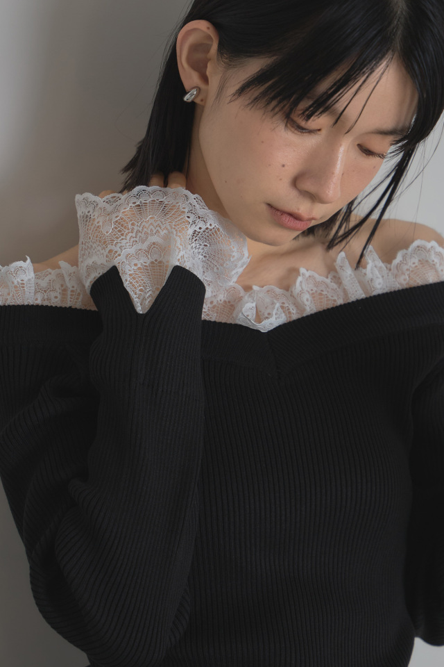 女性らしさを引き立てる、上品なレース付きオフショルニット