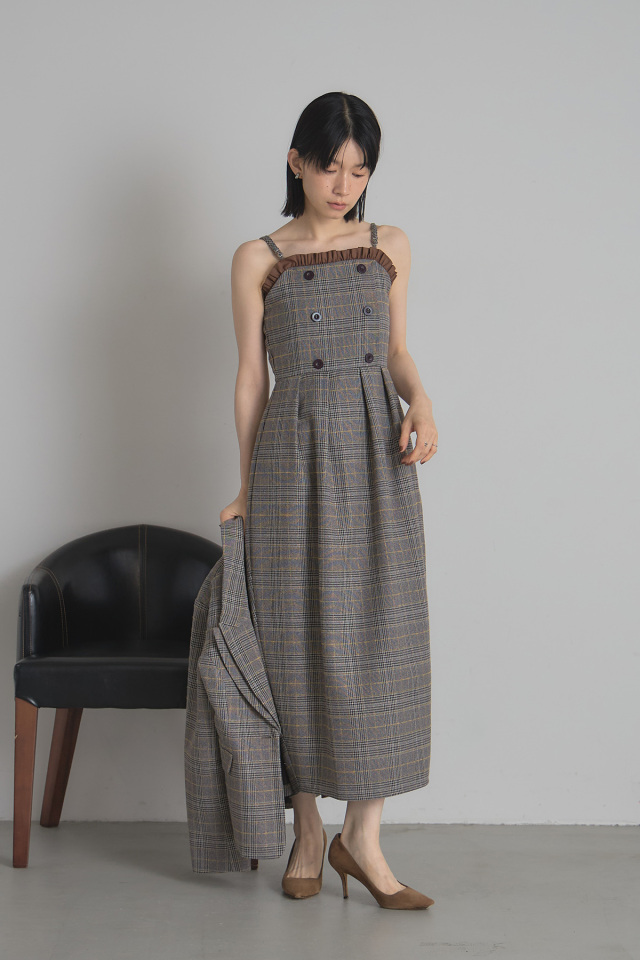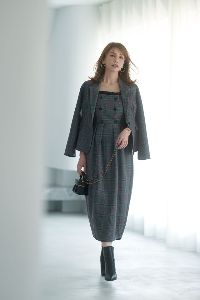 | 商品説明 | : | クラシカルなチェック柄と端正なシルエットが魅力のチェックベアワンピース フロントのダブルボタンデザインと胸元のフリルディテールが 女性らしさを引き立てつつ、きちんと感も演出してくれます 背中はシャーリング仕様でストレスフリーな着心地を叶えつつ、体に沿うすっきりとしたラインを演出 ストラップは調整可能で、インナーを合わせてレイヤードスタイルも楽しめます ニットやブラウス合わせた着こなしはもちろん、同素材のジャケット(10-198905)を羽織れば モードなセットアップスタイルに。 お仕事や特別なお出かけにも幅広いシーンに幅広く活躍する、大人の洗練さを感じさせてくれます |