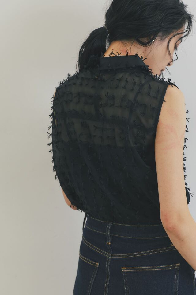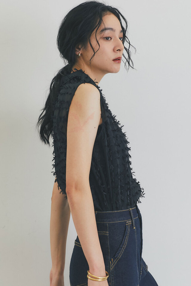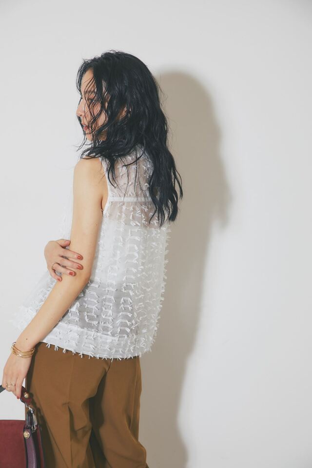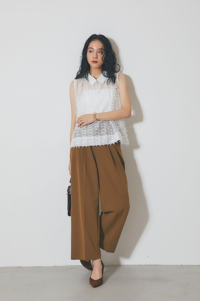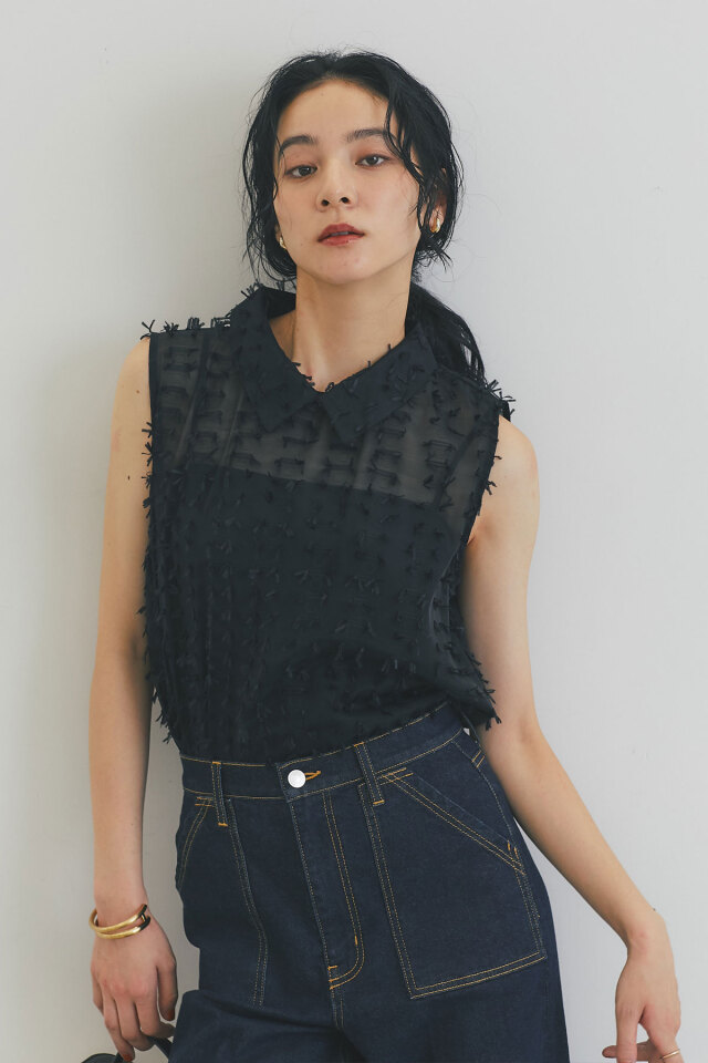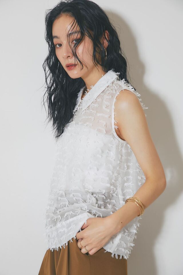 | 商品説明 | : | 繊細なフリンジとシアー素材が、涼やかで上品な印象を与えるフリンジジャガードノースリーブブラウス 1枚で着映えするデザインで、夏のコーディネートを華やかに彩ります 全体に施された立体的なフリンジが、動きに合わせて揺れ、表情豊かな着こなしを演出します きちんと感のある襟が、カジュアルになりすぎず、上品な雰囲気にまとめてくれます 清潔感があり、顔周りを明るく見せる定番カラーのホワイト シックで大人っぽい印象のブラックの2色展開。どちらのカラーもコーディネートしやすく着回し◎ ブラウンやベージュなど、暖色系のボトムスと合わせると、柔らかく優しい印象に。 デニムと合わせれば、爽やかなカジュアルスタイルが完成します |