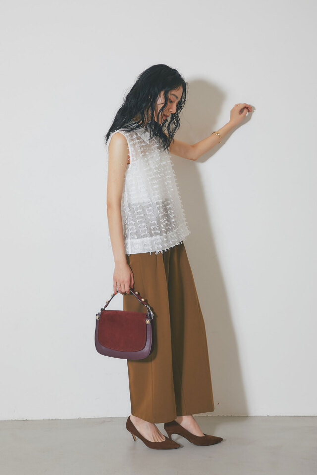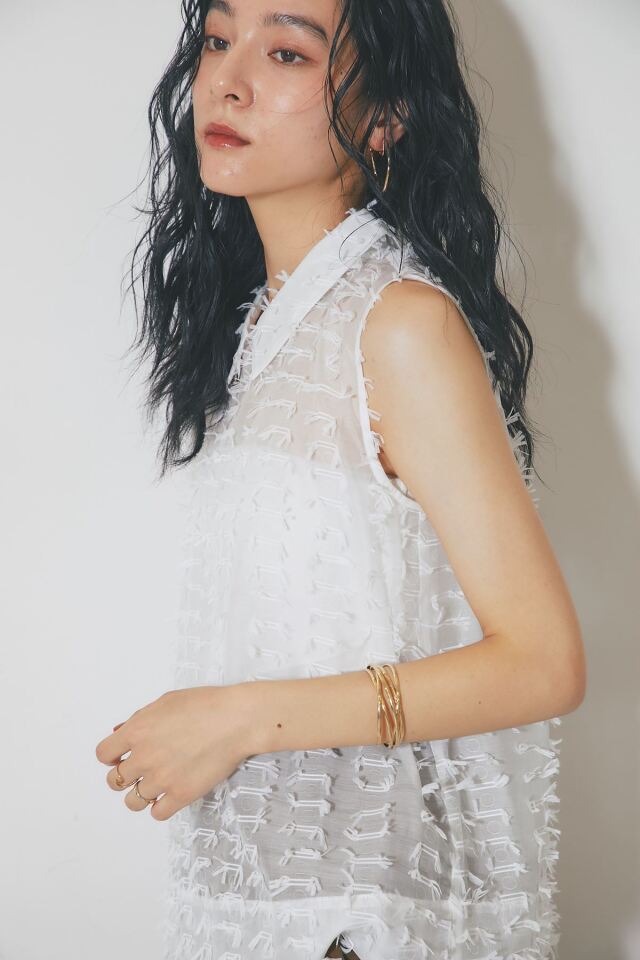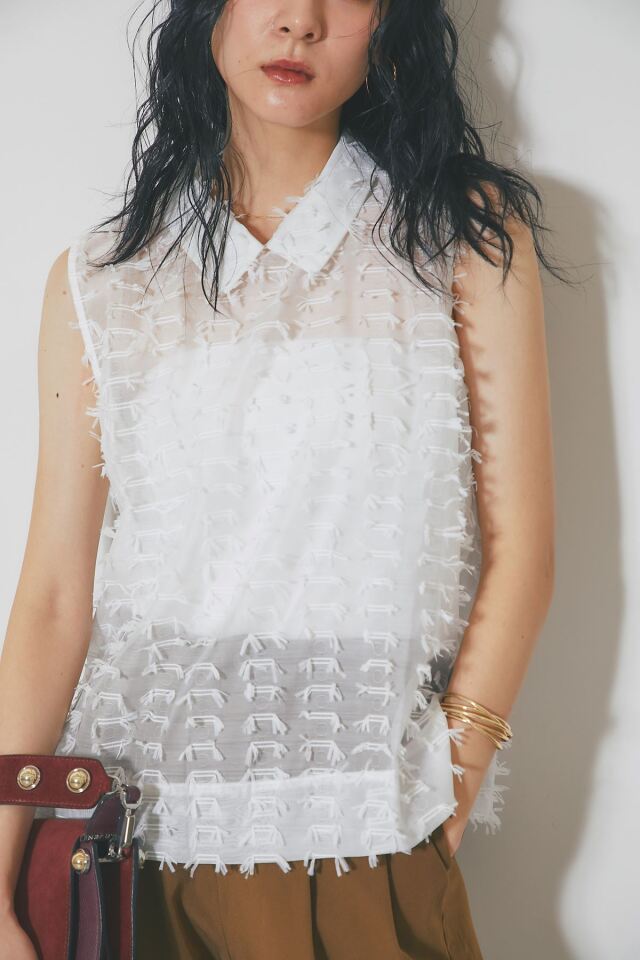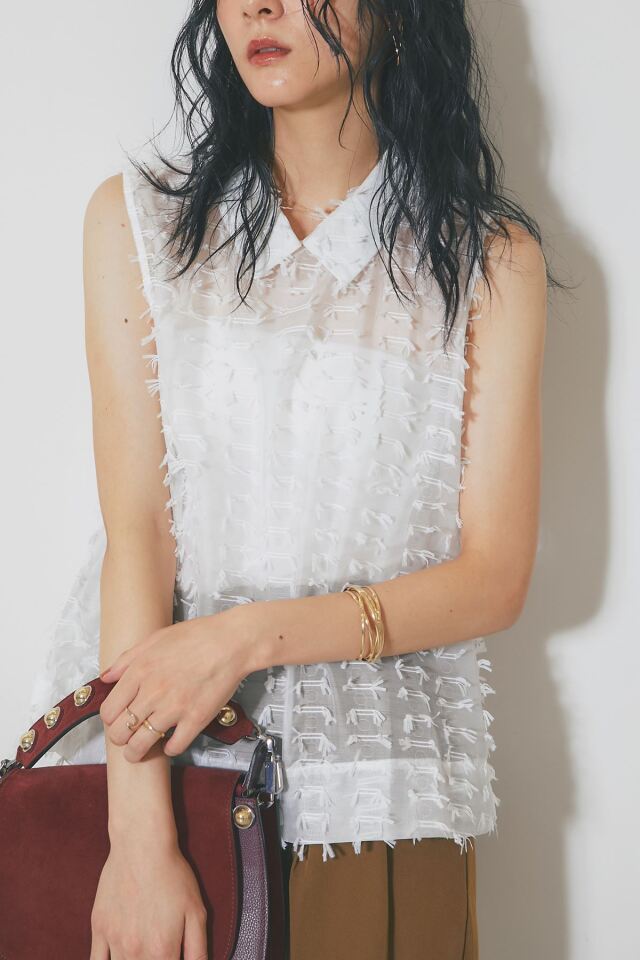 | 商品説明 | ≪ Attention:販売日、在庫状況はWEBと店舗と異なります。予めご了承くださいませ。≫ 繊細なフリンジとシアー素材が、涼やかで上品な印象を与えるフリンジジャガードノースリーブブラウス 1枚で着映えするデザインで、夏のコーディネートを華やかに彩ります 全体に施された立体的なフリンジが、動きに合わせて揺れ、表情豊かな着こなしを演出します きちんと感のある襟が、カジュアルになりすぎず、上品な雰囲気にまとめてくれます 清潔感があり、顔周りを明るく見せる定番カラーのホワイト シックで大人っぽい印象のブラックの2色展開。どちらのカラーもコーディネートしやすく着回し◎ ブラウンやベージュなど、暖色系のボトムスと合わせると、柔らかく優しい印象に。 デニムと合わせれば、爽やかなカジュアルスタイルが完成します |