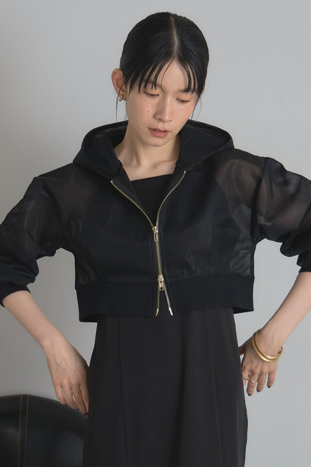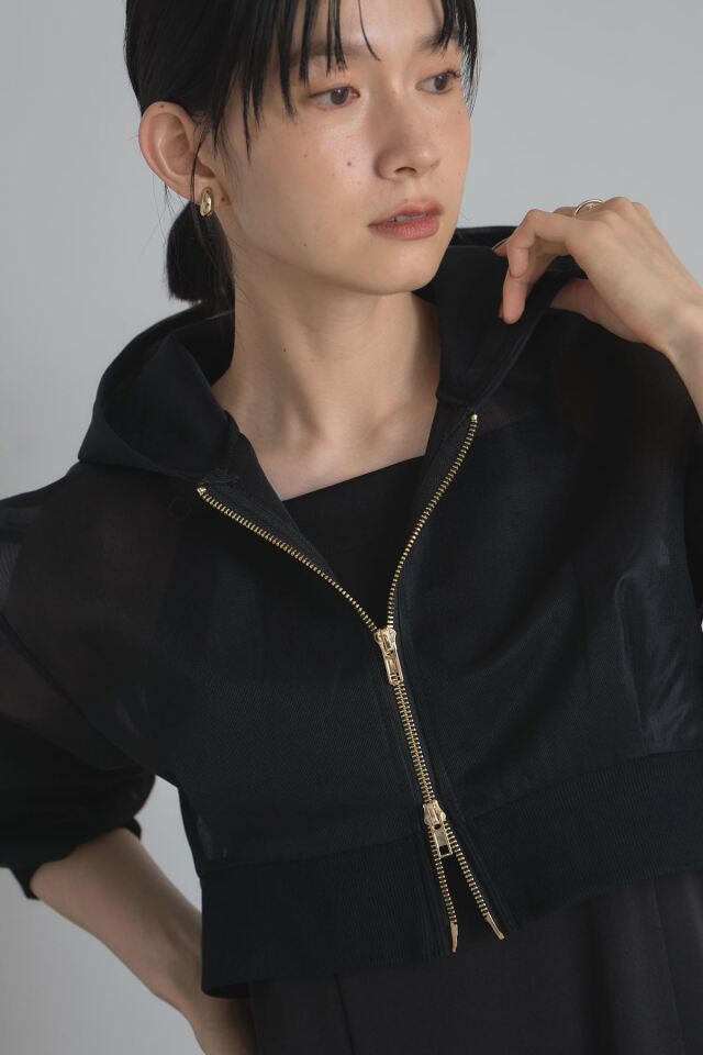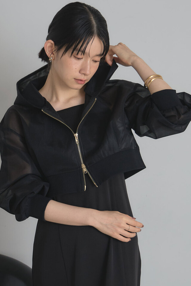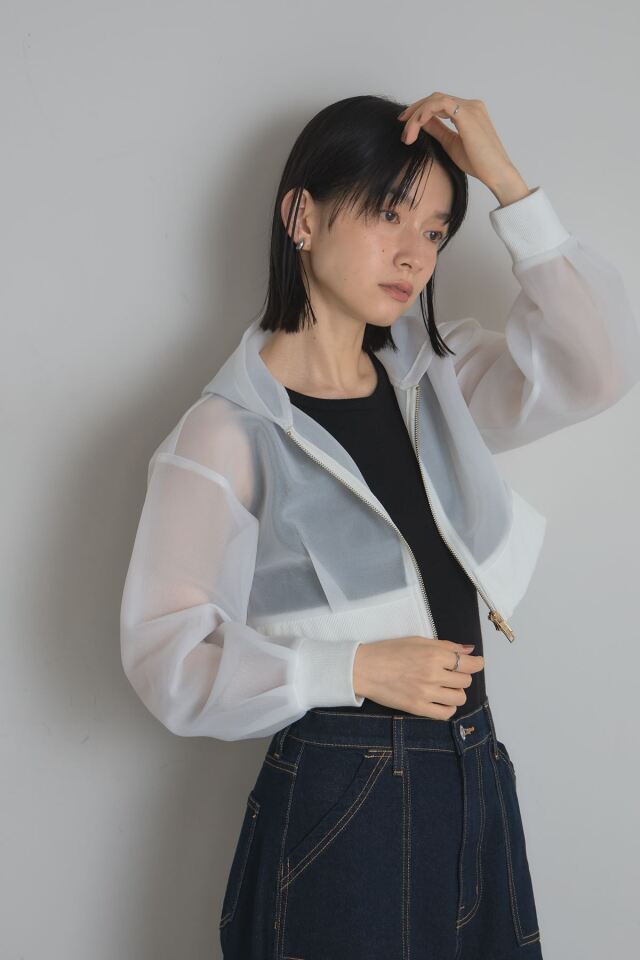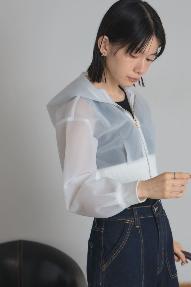 トレンドのシアー素材ととクロップド丈を組み合わせた、軽やかなパーカー