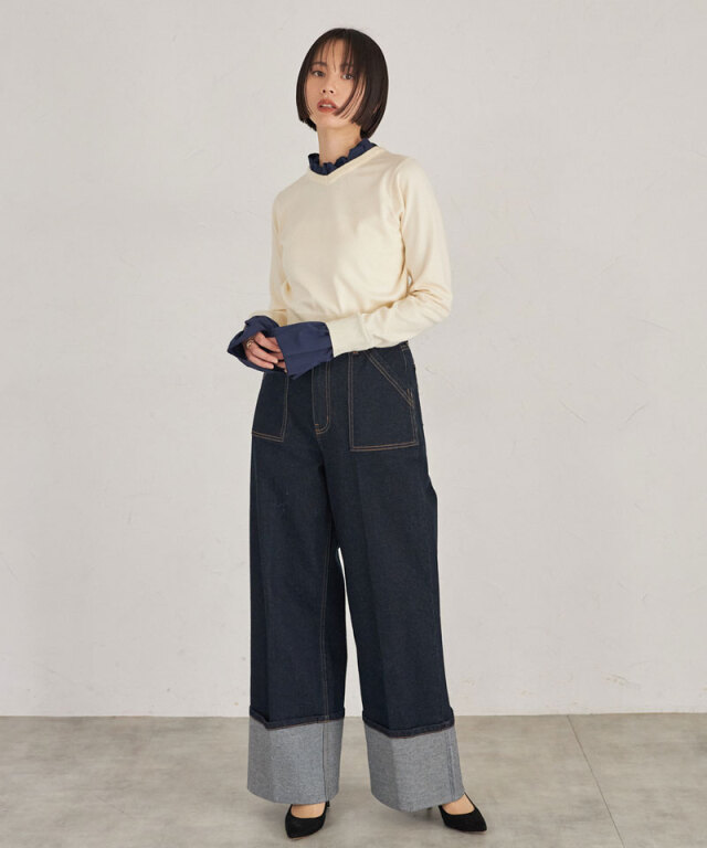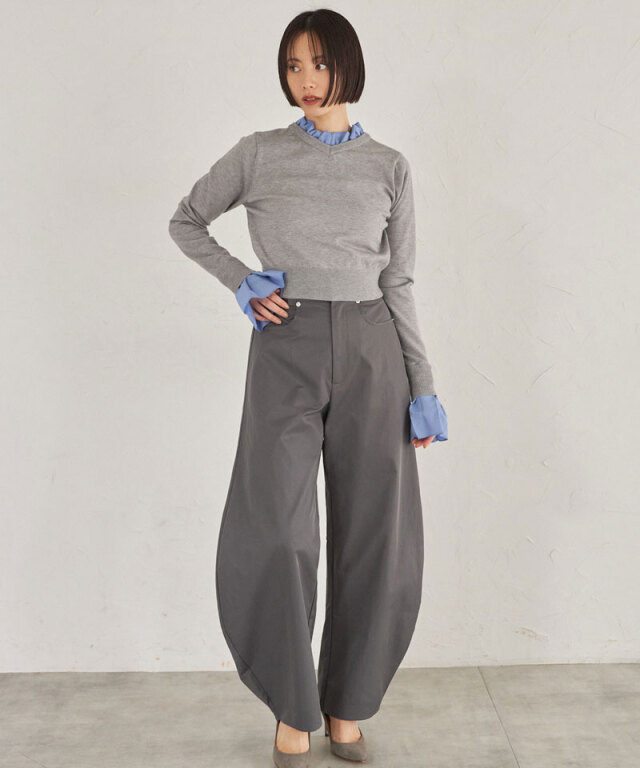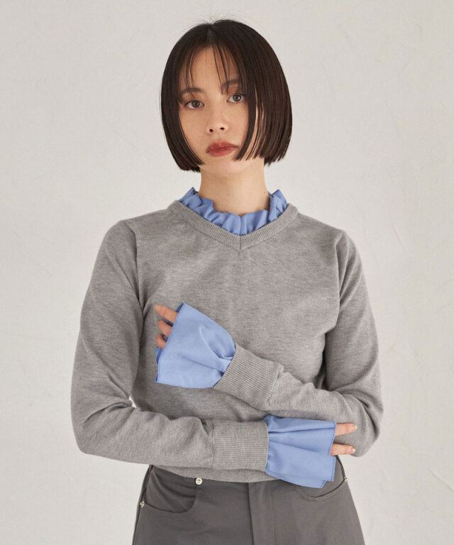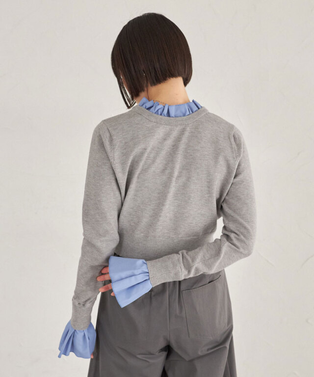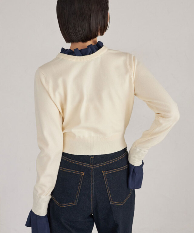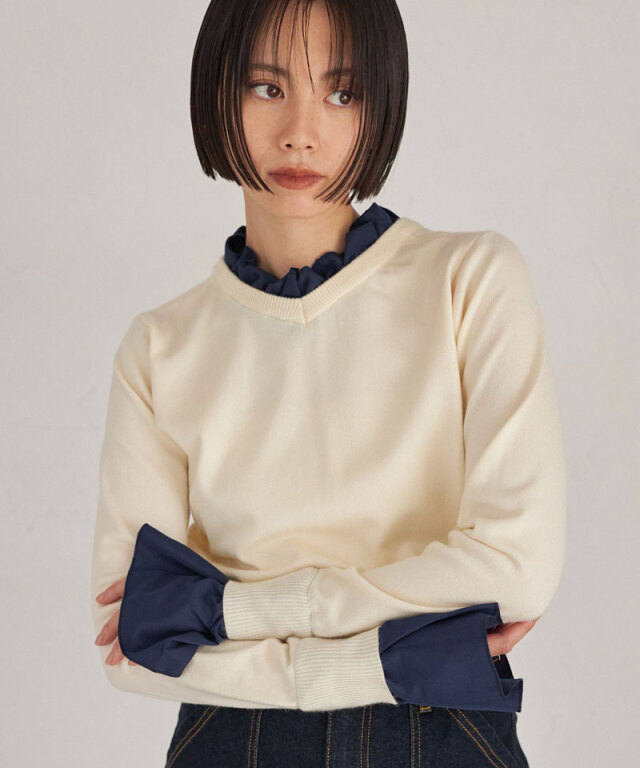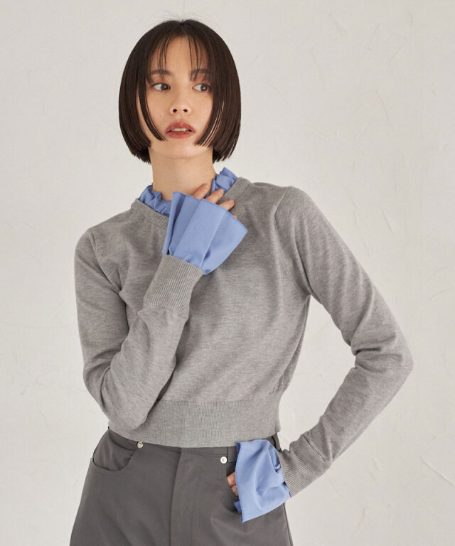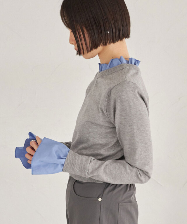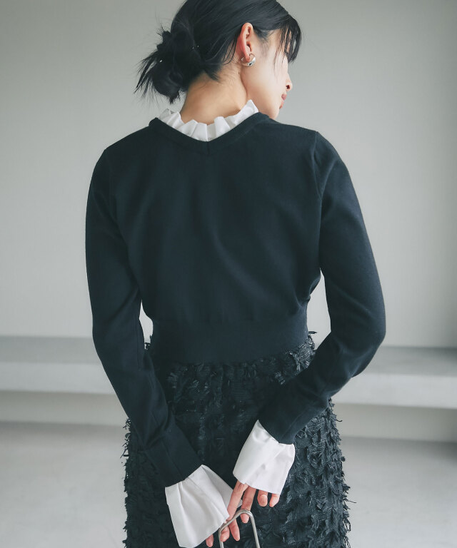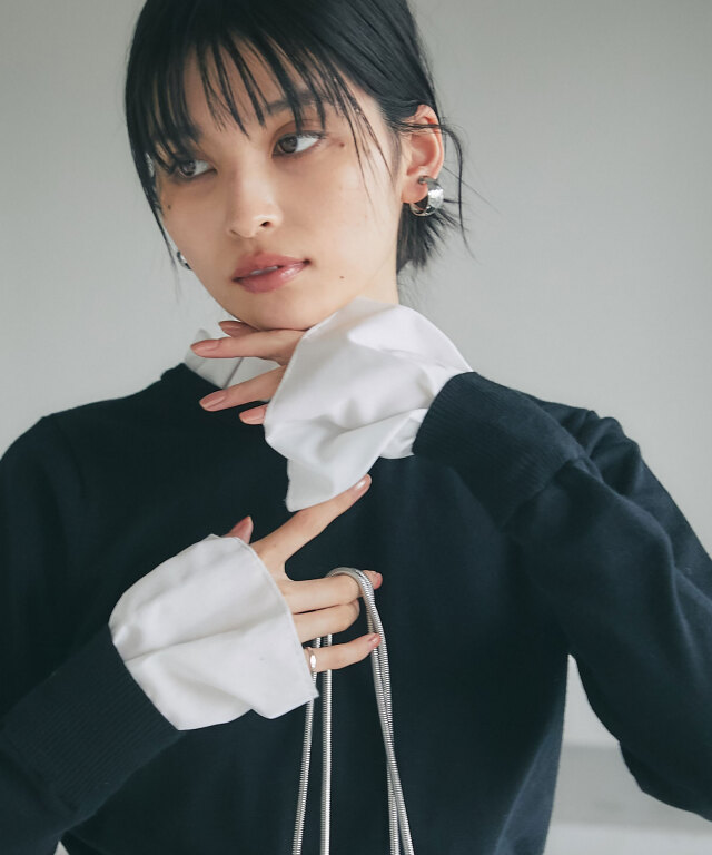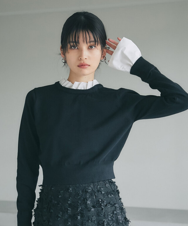 | 商品説明 | : | フリルで華やぐ、上品ドッキングニット。 ハイネックフリルをシャツ感覚でドッキングしたニットトップス。 首元と袖口の白フリルが顔周りを華やかに演出し、 シンプルなニット部分とのコントラストで大人の可愛らしさをプラス。 ショート丈のリブニットでメリハリあるシルエットに仕上げており、 スカートやパンツに合わせやすく、デイリーからきれいめスタイルまで幅広く活躍します。 |