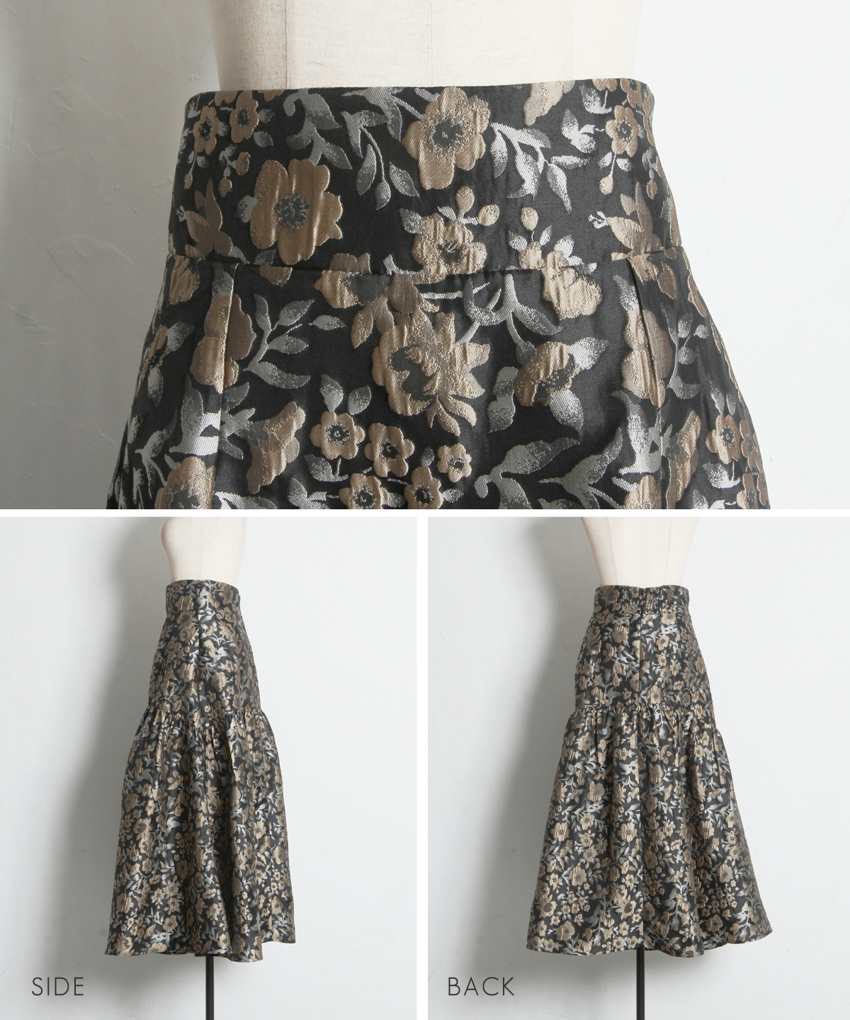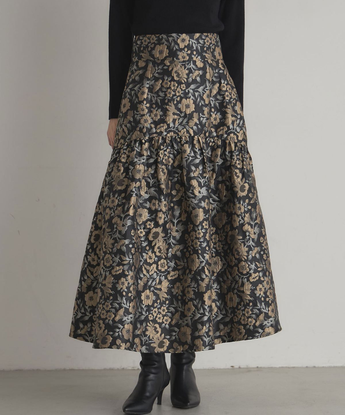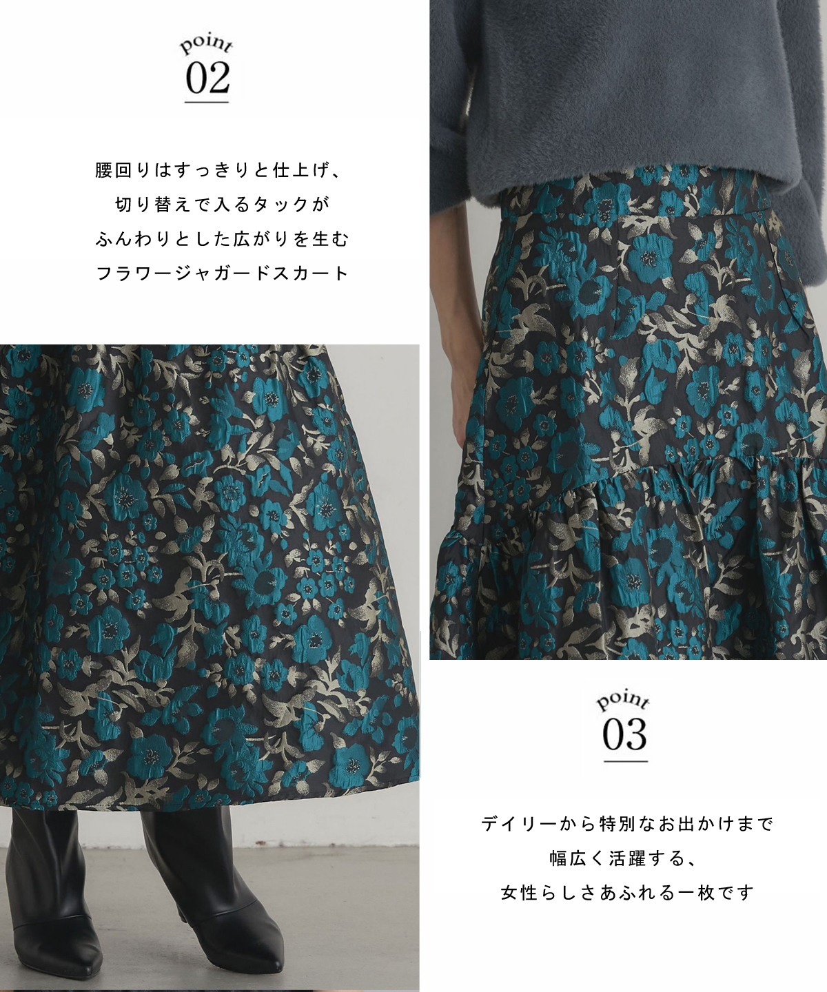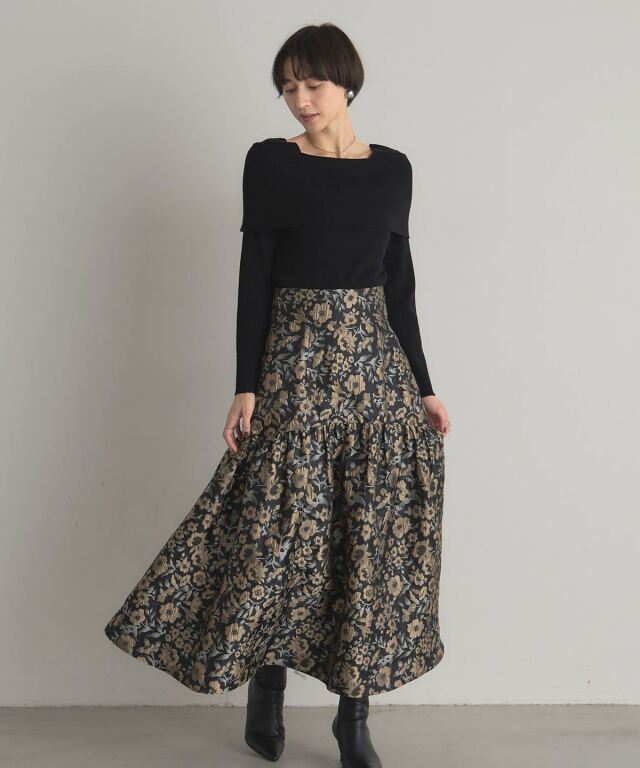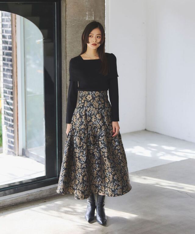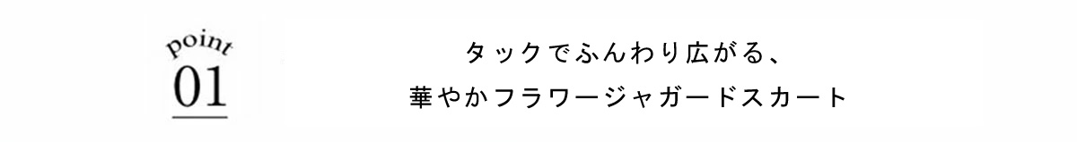 | 商品説明 | : | タックでふんわり広がる、華やかフラワージャガードスカート。 腰回りはすっきりと仕上げ、切り替えで入るタックがふんわりとした広がりを生むフラワージャガードスカート。 立体感のある花柄ジャガードが上品な華やかさを演出し、 シンプルなトップスと合わせるだけでコーディネートを格上げ。 デイリーから特別なお出かけまで幅広く活躍する、女性らしさあふれる一枚です。 |