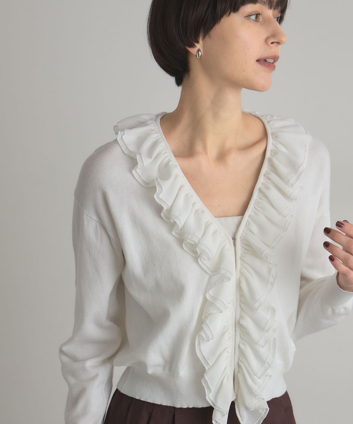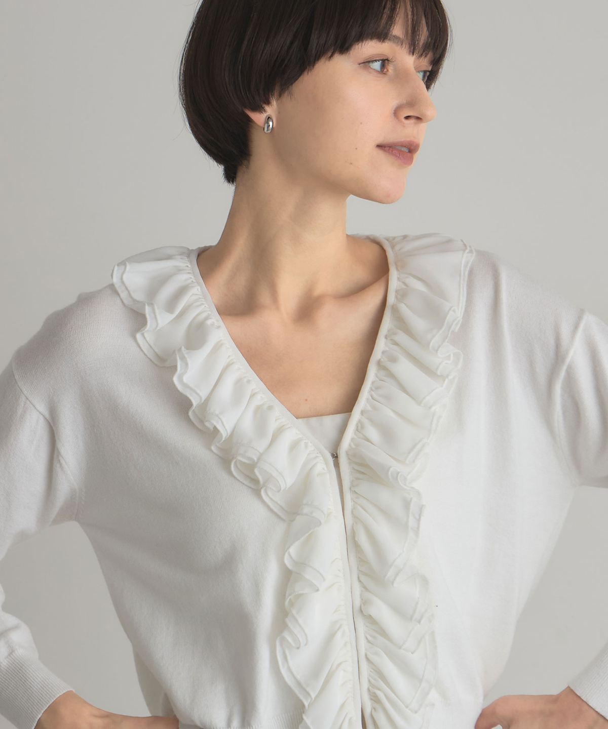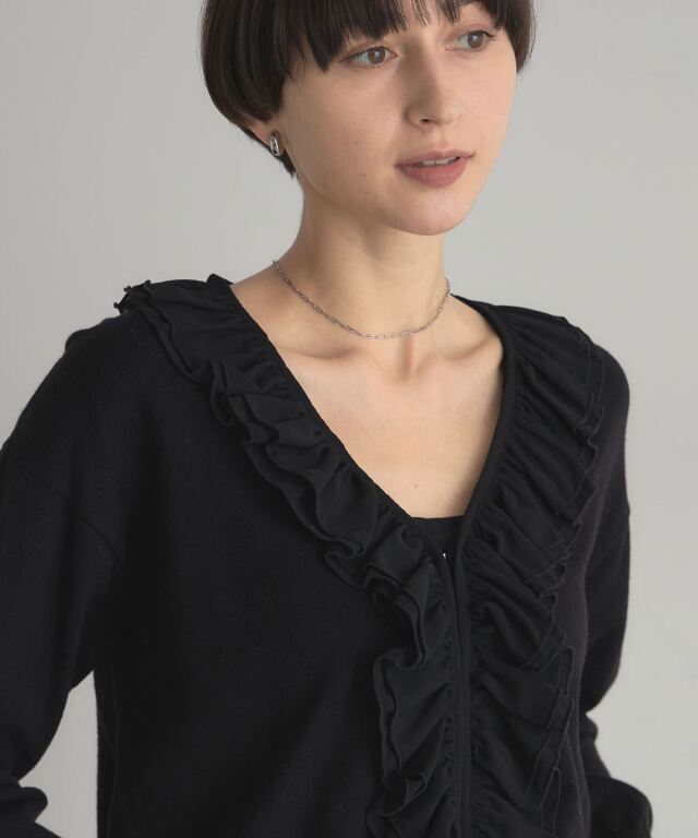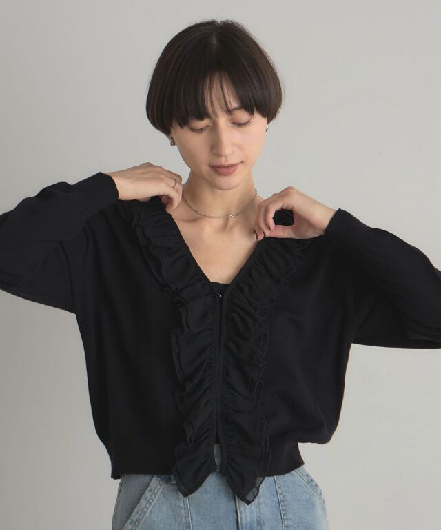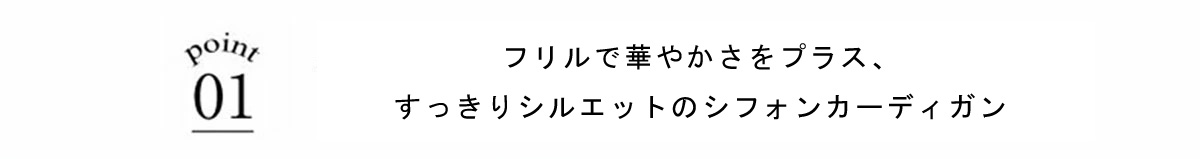| 商品説明 | : | フリルで華やかさをプラス、すっきりシルエットのシフォンカーディガン。 Vネックの開きに沿って、シフォンフリルをあしらったフェミニンなカーディガン。 すっきりとした丈感でボトムスとのバランスも取りやすく、 ソフトな質感がコーディネートを彩ります。 1枚で着るだけでも上品な印象に仕上がり、デイリーからちょっとしたお出かけまで幅広く活躍する一枚です。 |