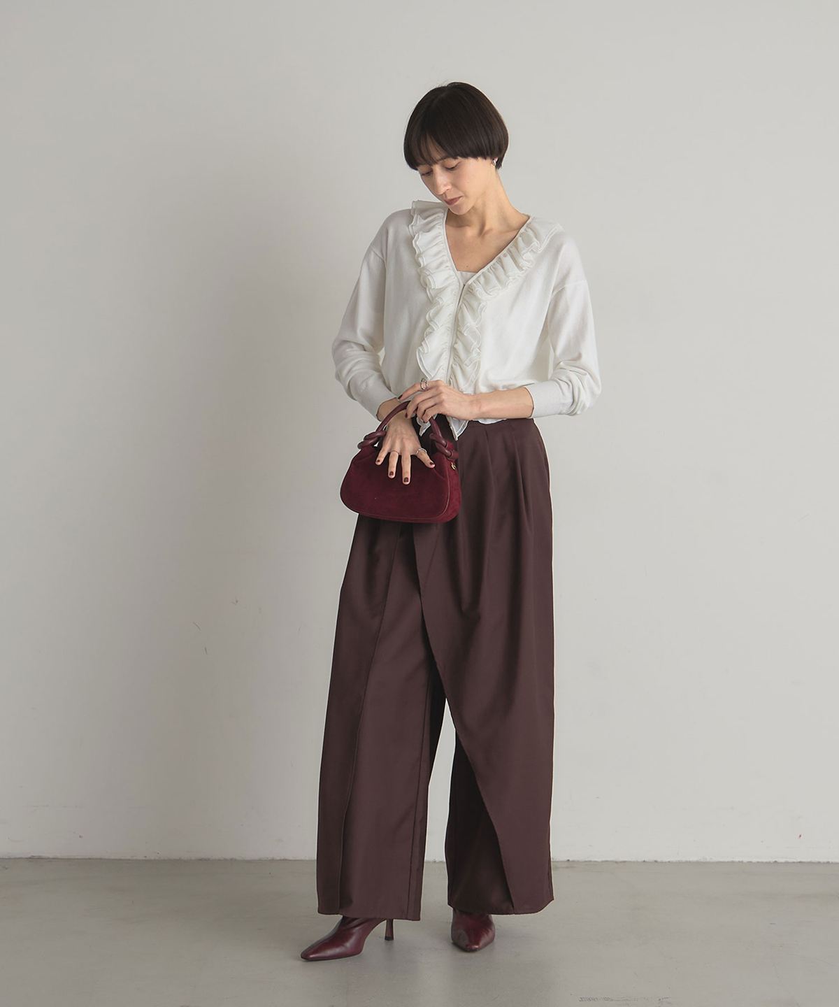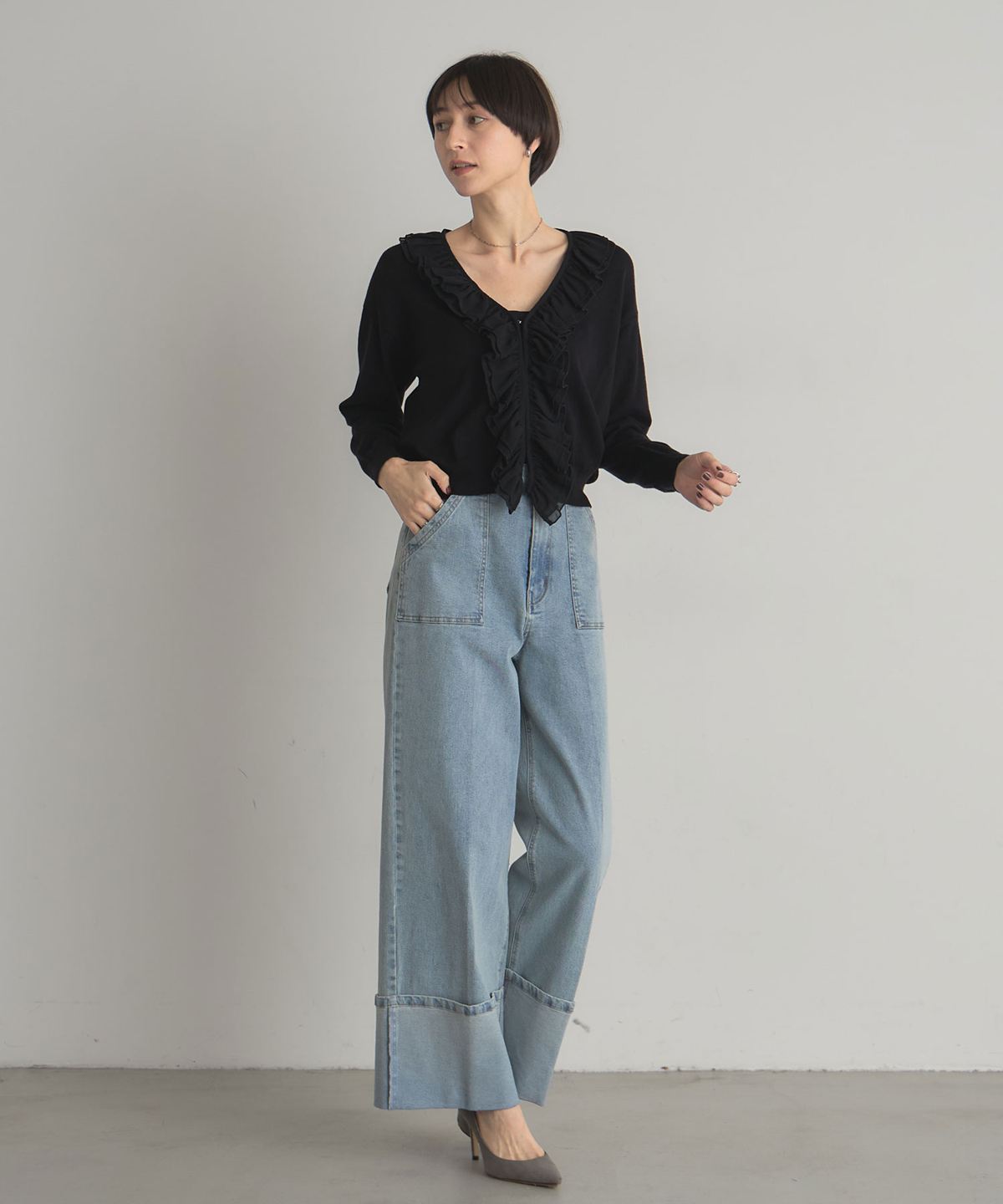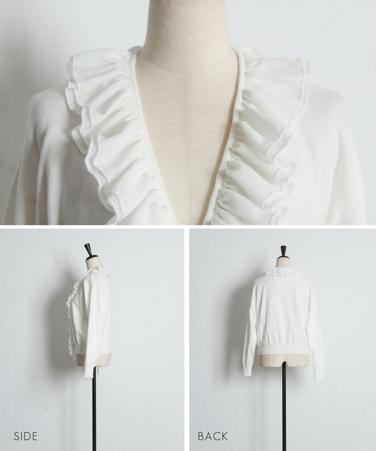 | 商品説明 | : | フリルで華やかさをプラス、すっきりシルエットのシフォンカーディガン。 Vネックの開きに沿って、シフォンフリルをあしらったフェミニンなカーディガン。 すっきりとした丈感でボトムスとのバランスも取りやすく、 ソフトな質感がコーディネートを彩ります。 1枚で着るだけでも上品な印象に仕上がり、デイリーからちょっとしたお出かけまで幅広く活躍する一枚です。 |