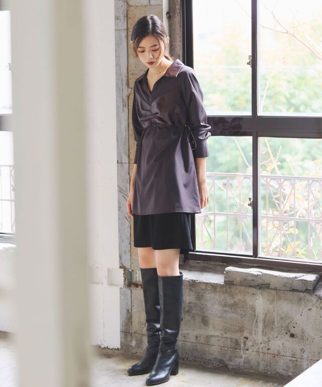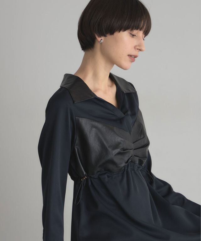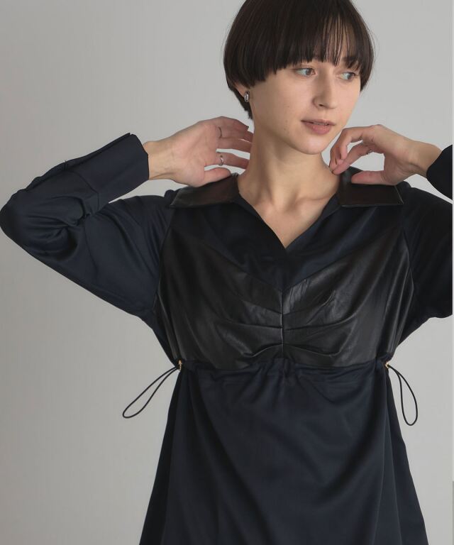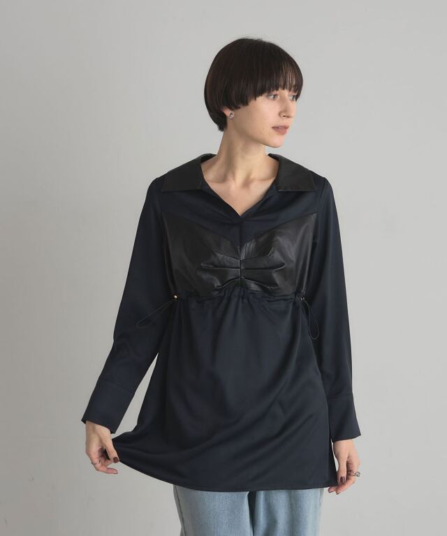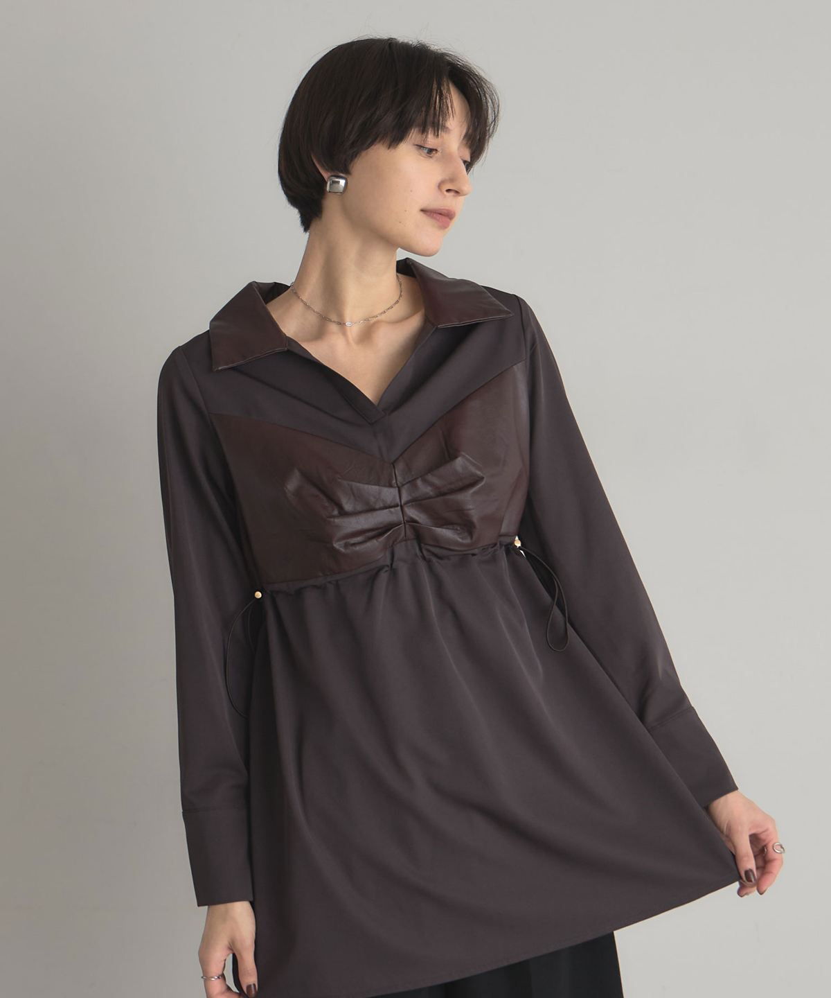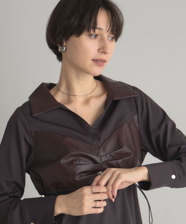 | 商品説明 | : | 都会的なエッジを添える、レザー×シャツの新感覚ドッキングデザイン。 胸元のレザー切替が印象的なドッキングシャツ。 柔らかな布帛素材とレザーの異素材コンビで、カジュアルながらも上品な雰囲気を演出します。 ウエスト部分はギャザーで自然に広がり、体型カバーも◎。 長めの丈感でミニスカートやパンツとのレイヤードも楽しめる、シーズンレスで活躍する一枚です。 |