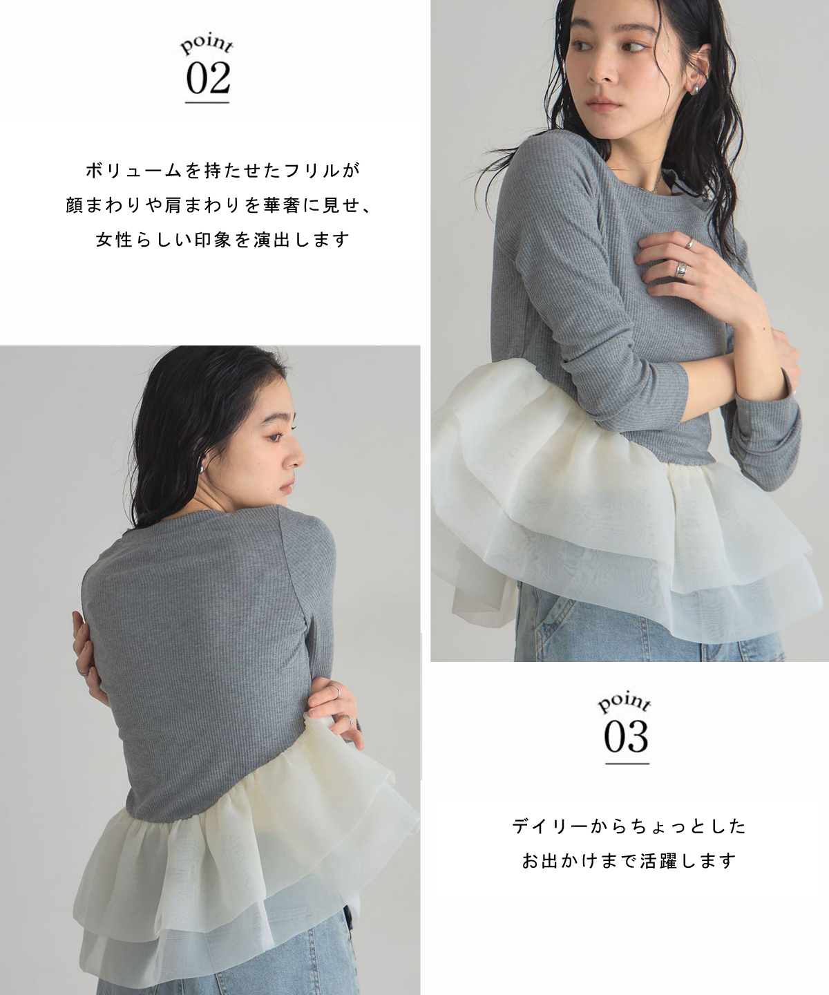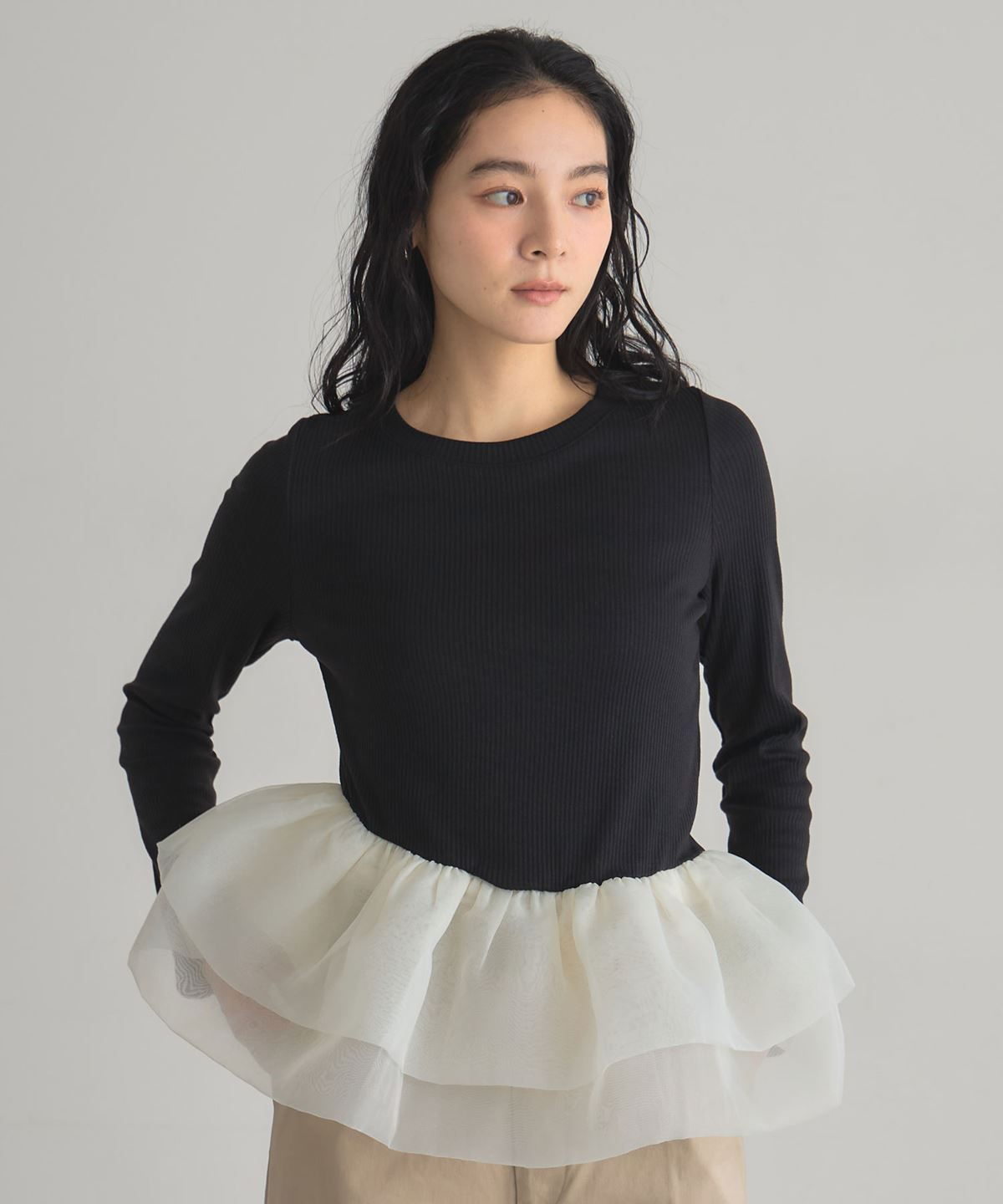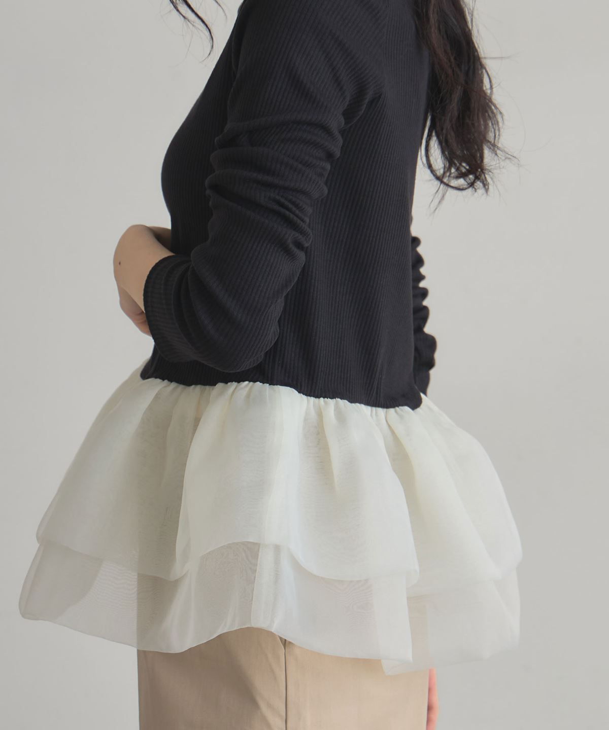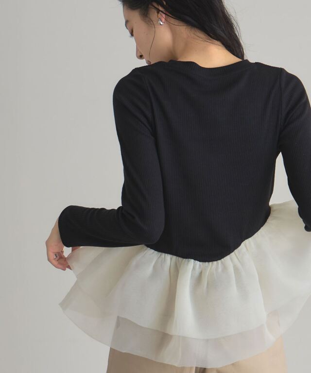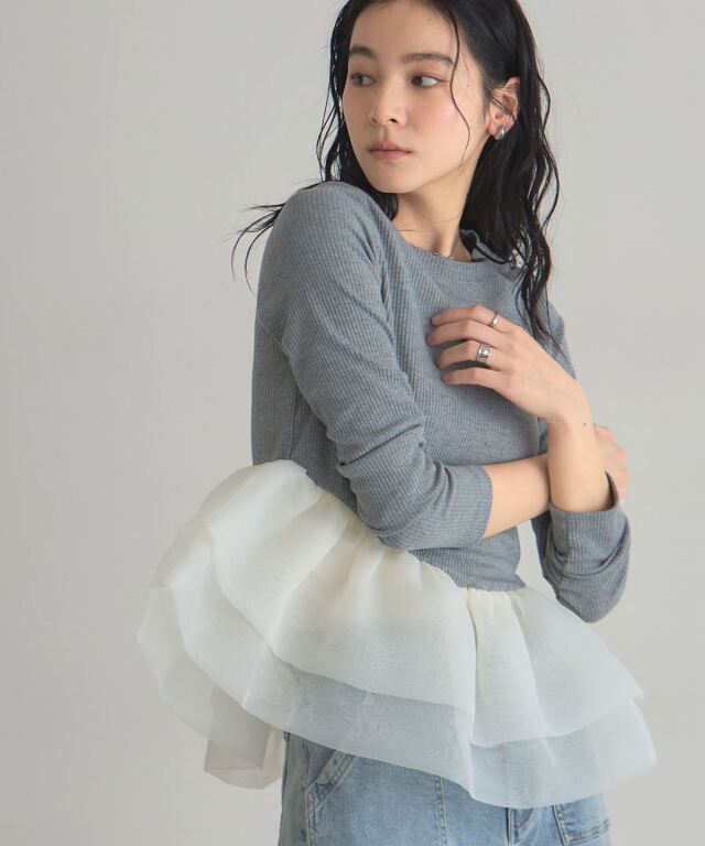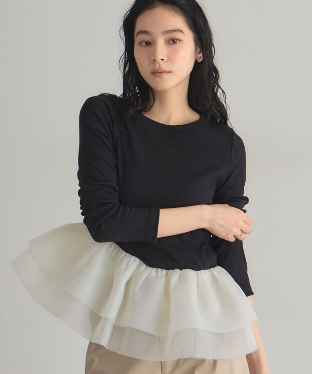 | 商品説明 | : | 一枚で華やぐ、ドラマティックなフリルトップス。 立体的に重ねたボリュームフリルが、360度どこから見ても印象的なスタイルを叶えるカットソー。 トップは伸縮性のあるリブ素材で着心地は軽やか、 ウエスト切り替えから広がるチュールフリルが女性らしいメリハリをつくります。 1枚で主役になる存在感ながら、パンツにもスカートにも合わせやすくデイリーにも特別な日にも活躍。 シンプル×華やかの絶妙バランスで、大人の可愛さを品よく引き立てるアイテムです。 |