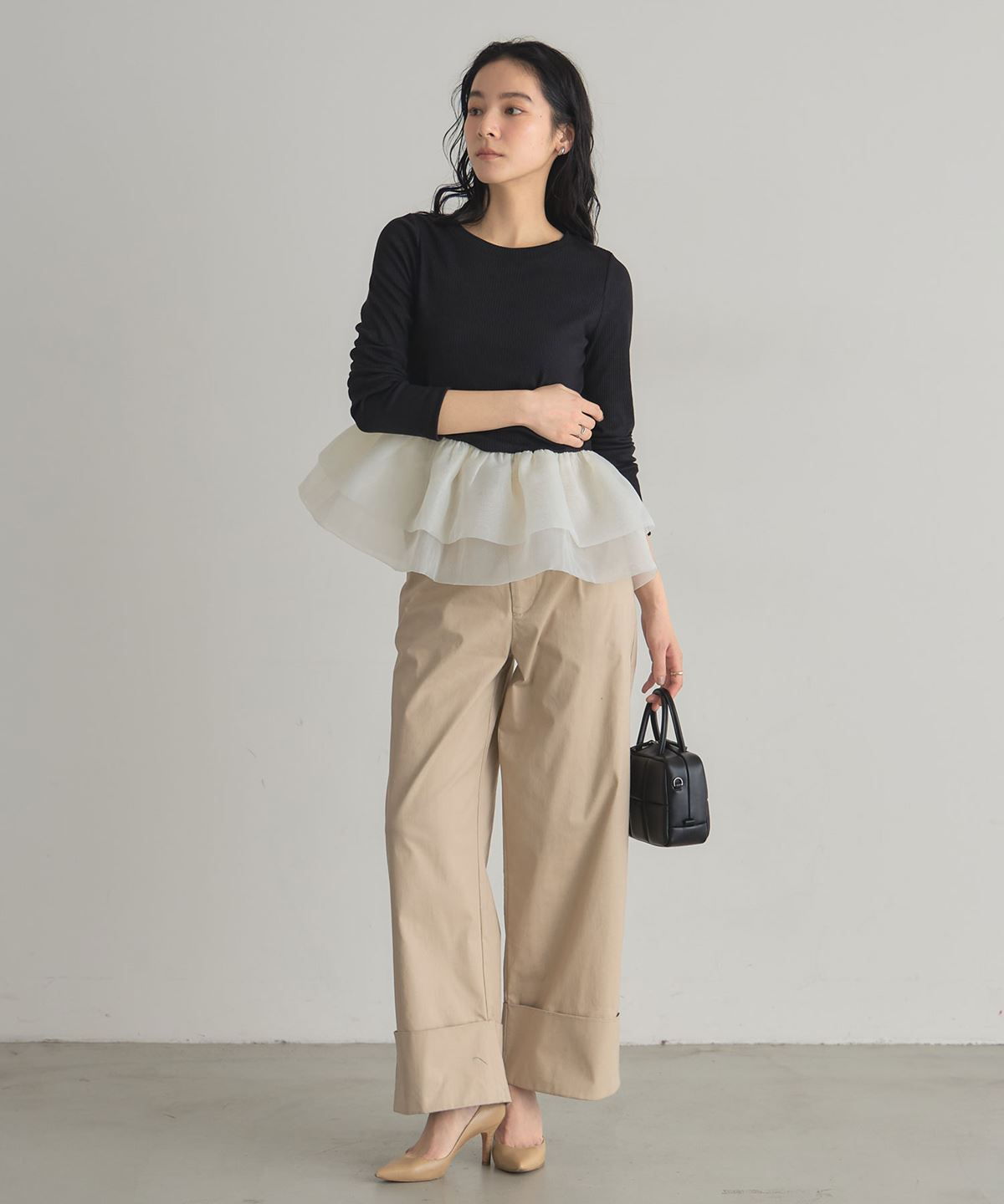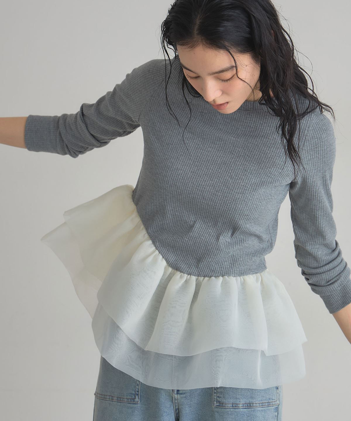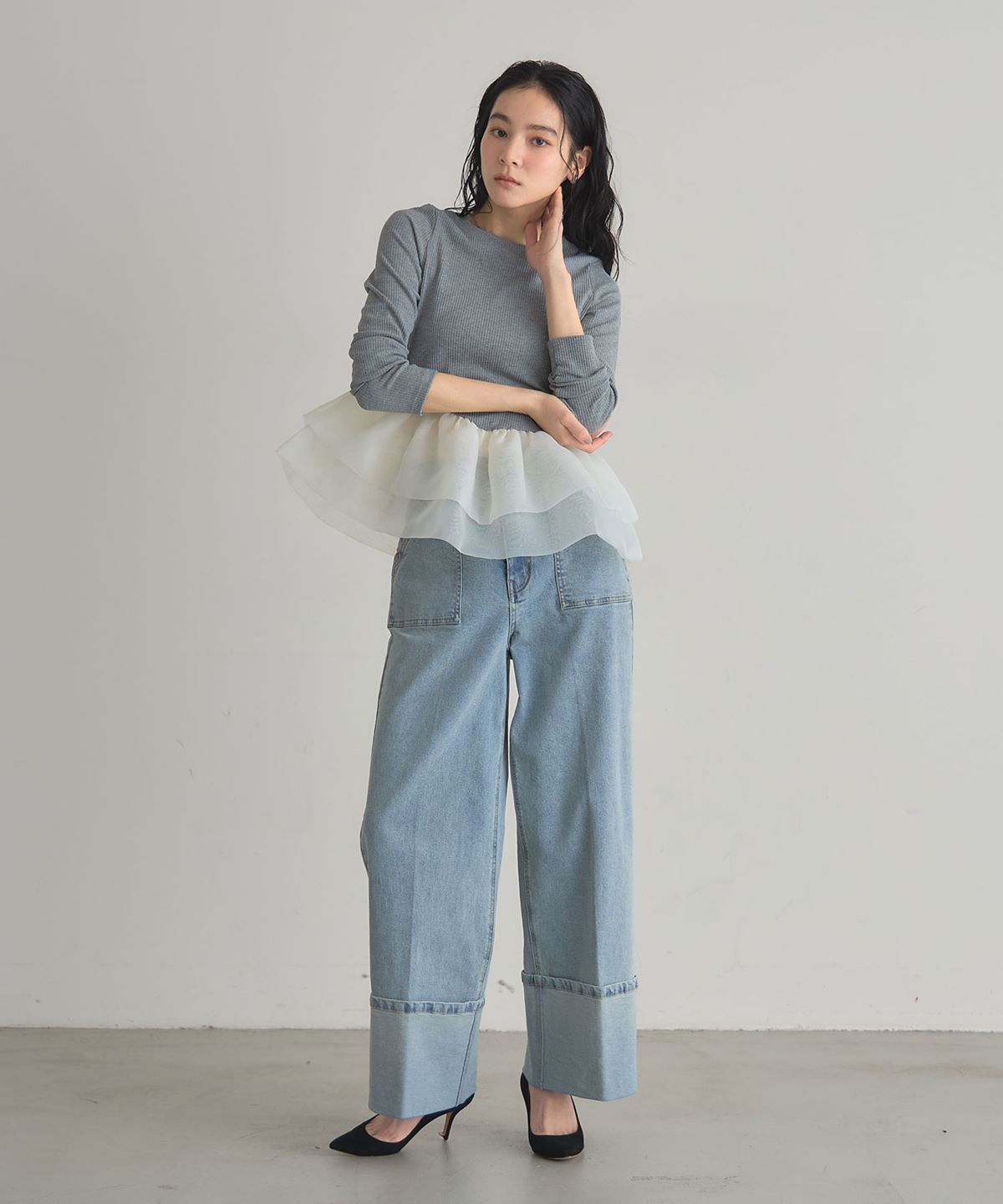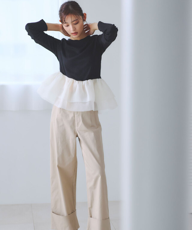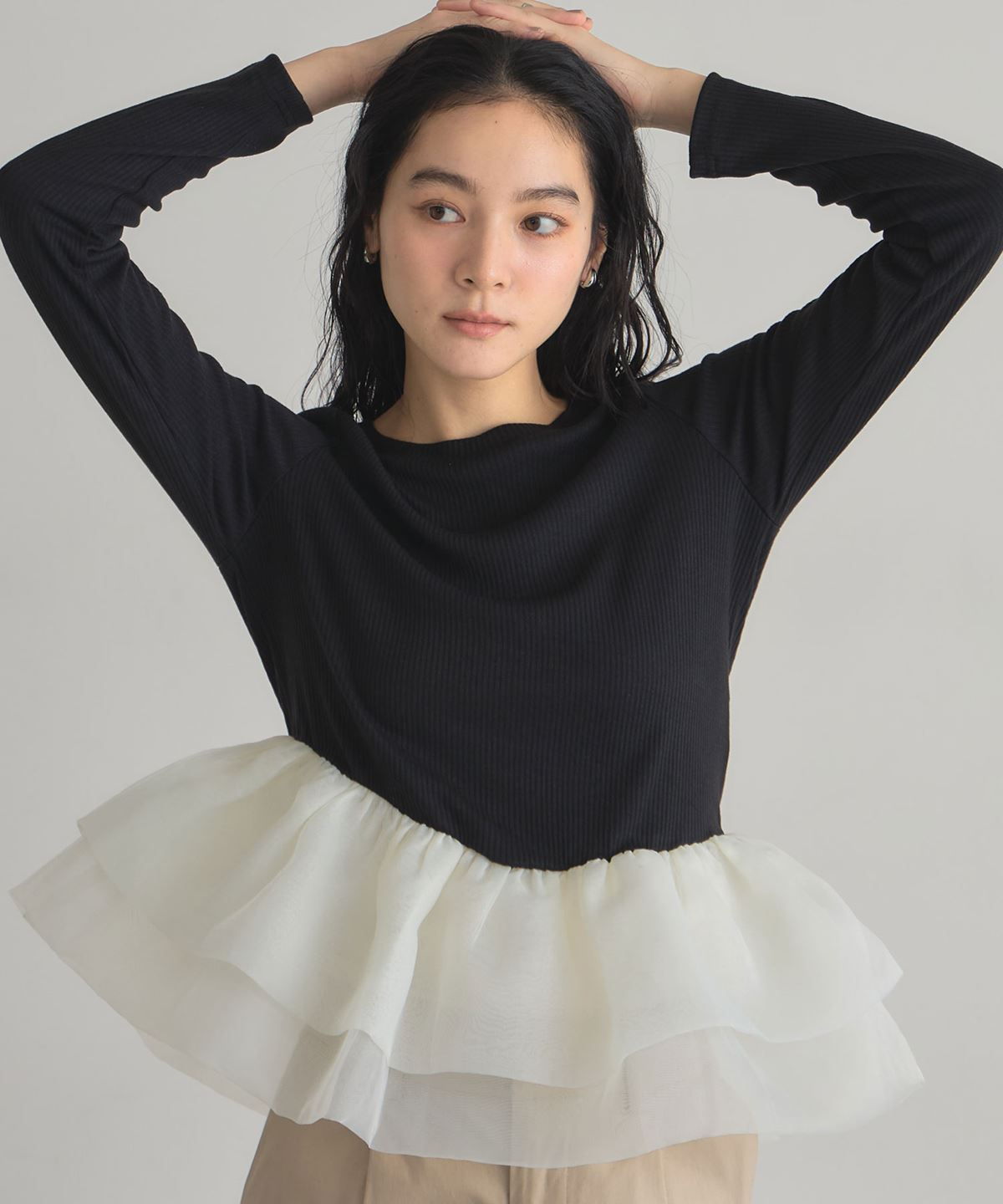 | 商品説明 | : | 一枚で華やぐ、ドラマティックなフリルトップス。 立体的に重ねたボリュームフリルが、360度どこから見ても印象的なスタイルを叶えるカットソー。 トップは伸縮性のあるリブ素材で着心地は軽やか、 ウエスト切り替えから広がるチュールフリルが女性らしいメリハリをつくります。 1枚で主役になる存在感ながら、パンツにもスカートにも合わせやすくデイリーにも特別な日にも活躍。 シンプル×華やかの絶妙バランスで、大人の可愛さを品よく引き立てるアイテムです。 |