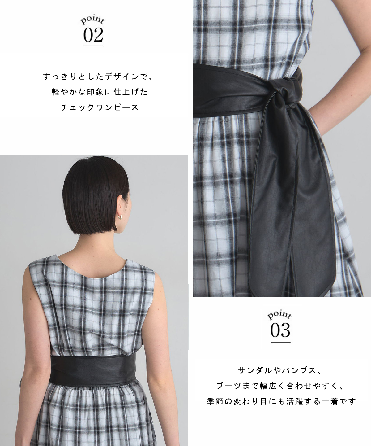 | 商品説明 | : | 爽やかなVネックにチェック柄が映える、レザーベルト付きワンピース。 すっきりとしたデザインで、軽やかな印象に仕上げたチェックワンピース。 ウエストにはレザーベルトをあしらい、コーディネート全体を引き締めつつ女性らしいメリハリを演出します。 一枚で着映えするデザインながら、落ち着いたチェック柄できちんと感もプラス。 サンダルやパンプス、ブーツまで幅広く合わせやすく、季節の変わり目にも活躍する一着です。 |