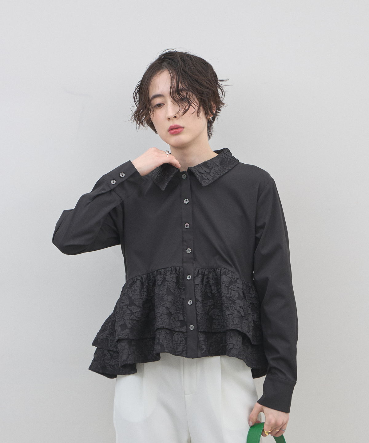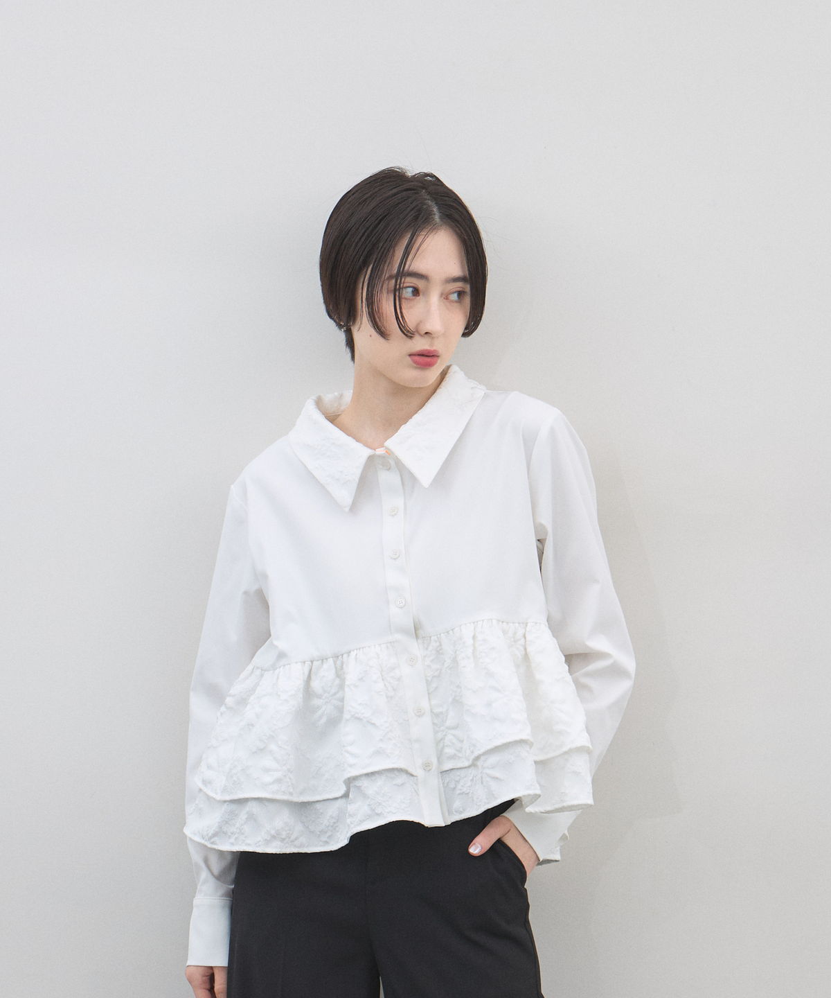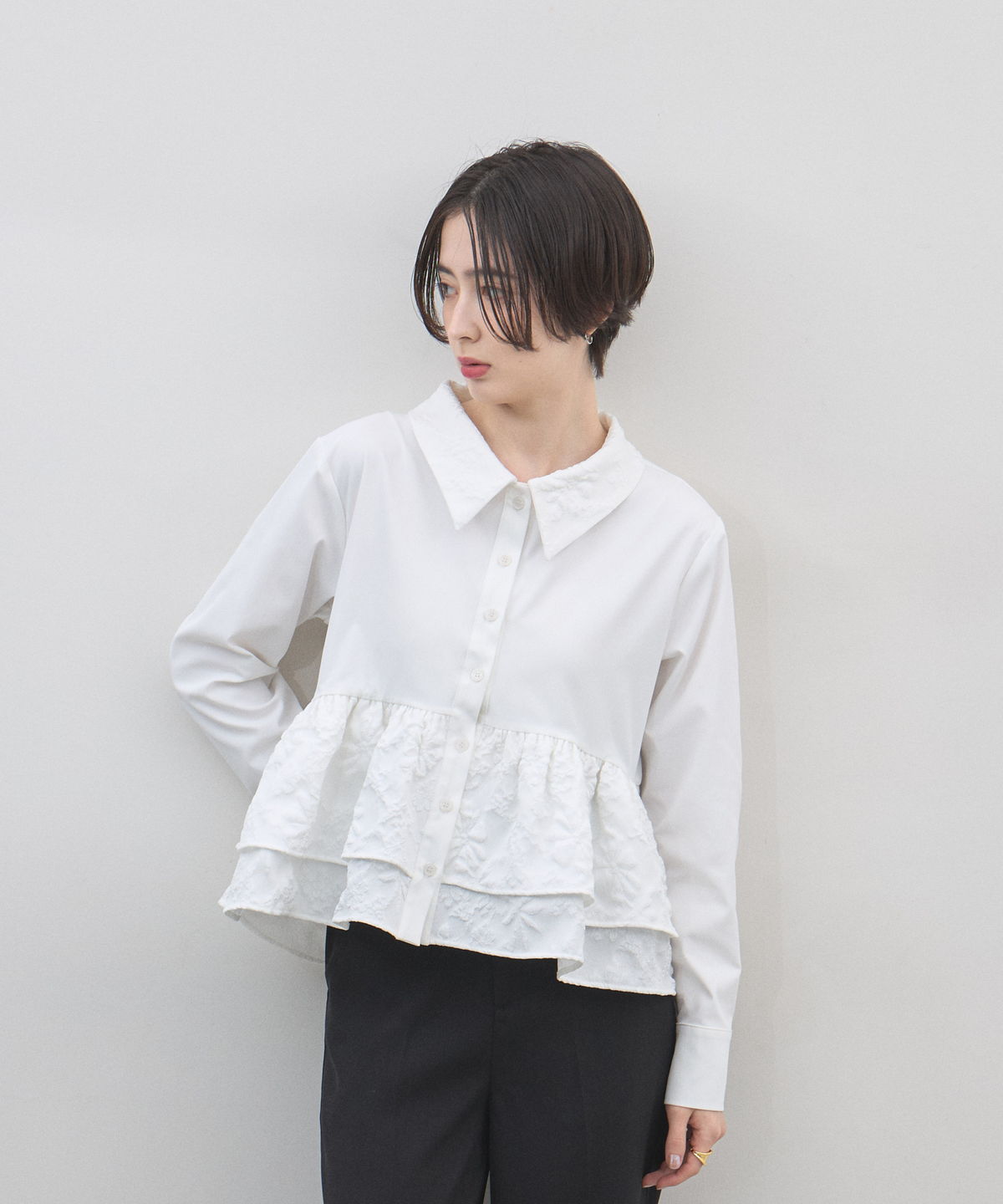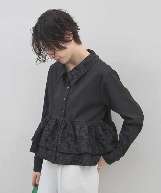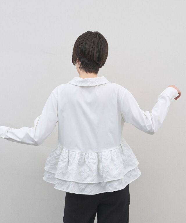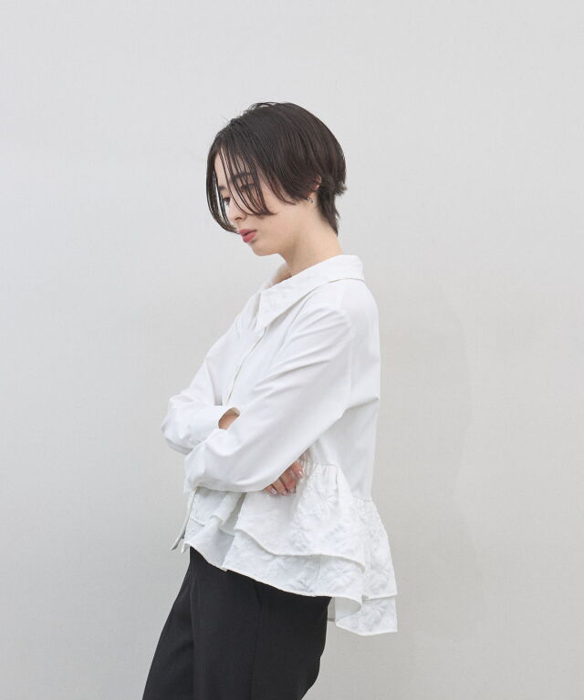 | 商品説明 | : | 光を纏う繊細な刺繍。360度どこから見てもドラマティックな、大人のティアードブラウス。 クリーンなシャツ地に、可憐なフラワー刺繍を施したフリルを贅沢にあしらったデザインブラウス。 計算されたティアードのボリュームが、 歩くたびにふんわりと軽やかな躍動感を生み出し、スタイリングに華やかな奥行きをプラスします。 きちんと感のある襟元と、ふんわりとした裾のコントラストが、女性らしさを最大限に引き立てるポイント。 ブラックのパンツで引き締めれば、甘さを抑えた都会的なモードスタイルの完成です。 アウトスタイルが決まりやすい丈感で、 どんなボトムスともバランス良く着こなせる、ワードローブの主役になる一枚です。 |