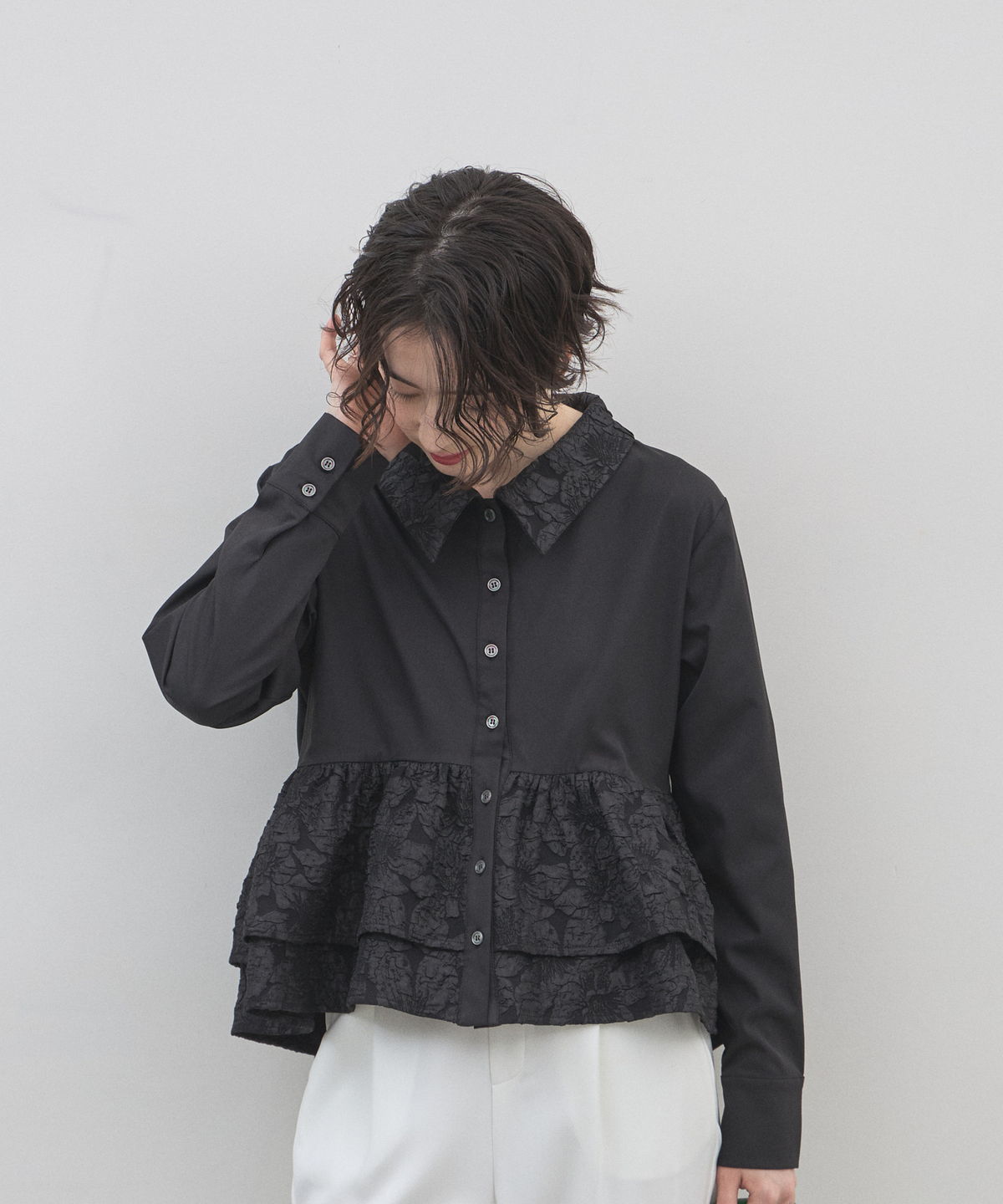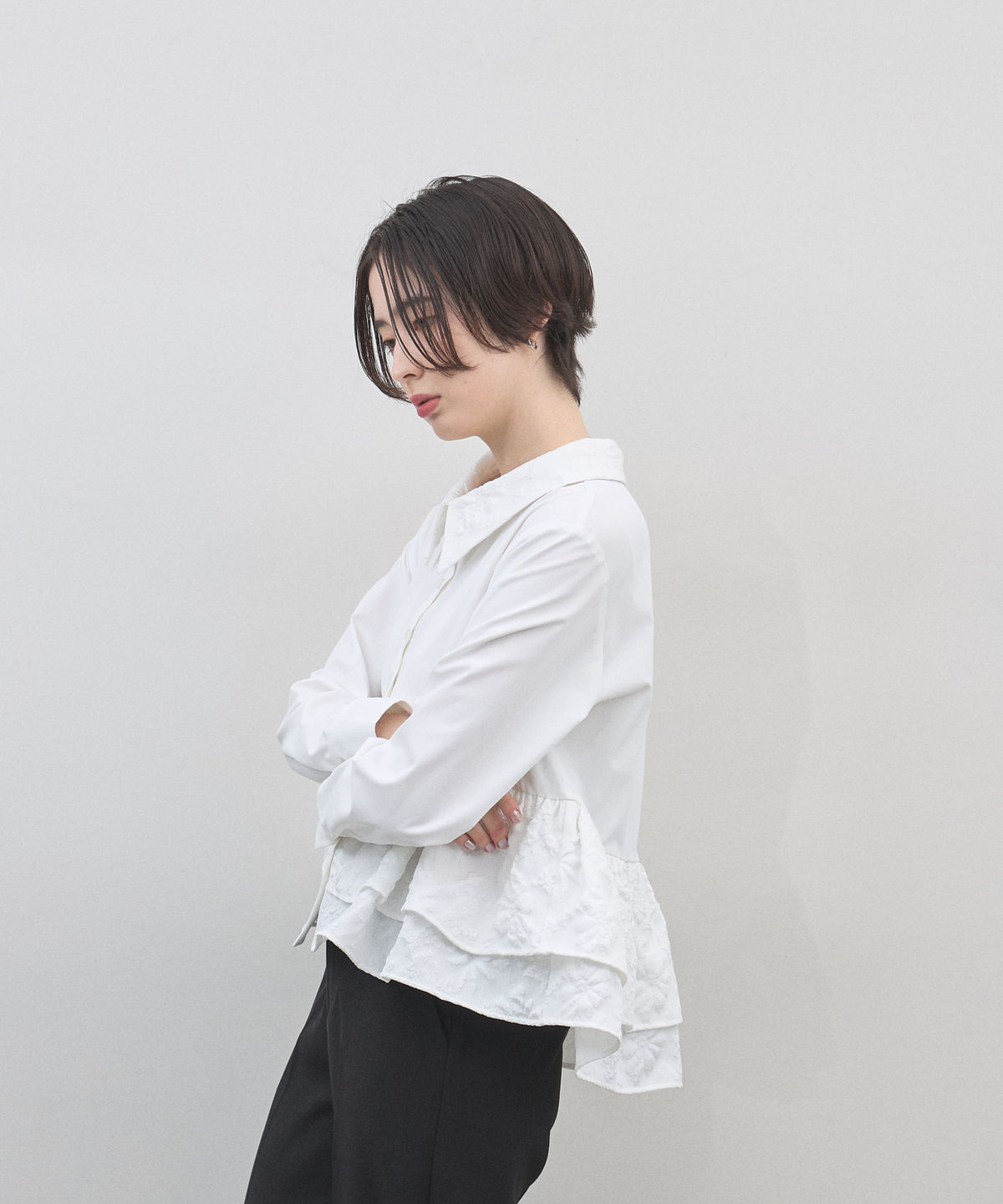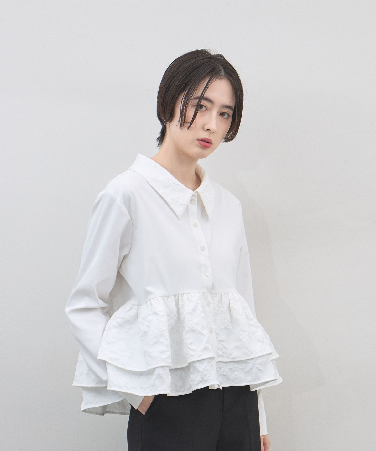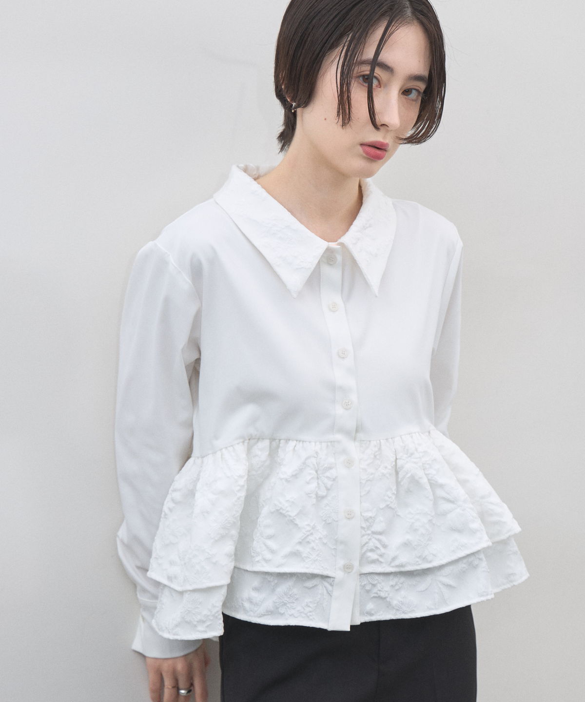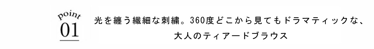 | 商品説明 | : | 光を纏う繊細な刺繍。360度どこから見てもドラマティックな、大人のティアードブラウス。 クリーンなシャツ地に、可憐なフラワー刺繍を施したフリルを贅沢にあしらったデザインブラウス。 計算されたティアードのボリュームが、 歩くたびにふんわりと軽やかな躍動感を生み出し、スタイリングに華やかな奥行きをプラスします。 きちんと感のある襟元と、ふんわりとした裾のコントラストが、女性らしさを最大限に引き立てるポイント。 ブラックのパンツで引き締めれば、甘さを抑えた都会的なモードスタイルの完成です。 アウトスタイルが決まりやすい丈感で、 どんなボトムスともバランス良く着こなせる、ワードローブの主役になる一枚です。 |