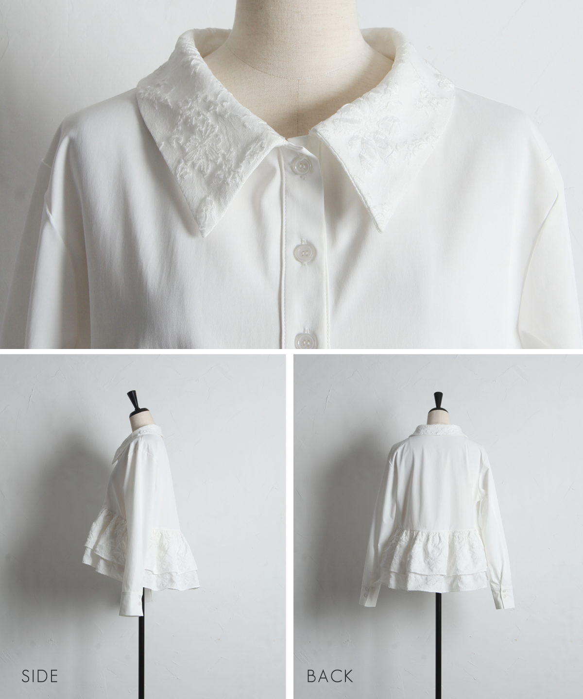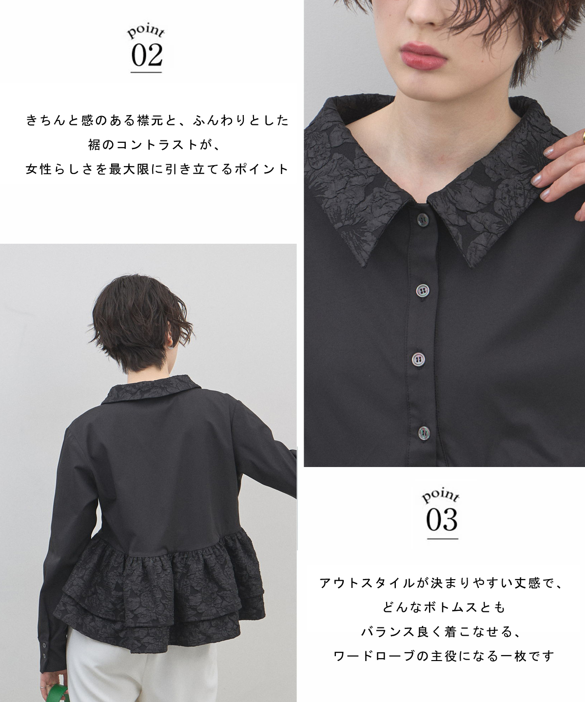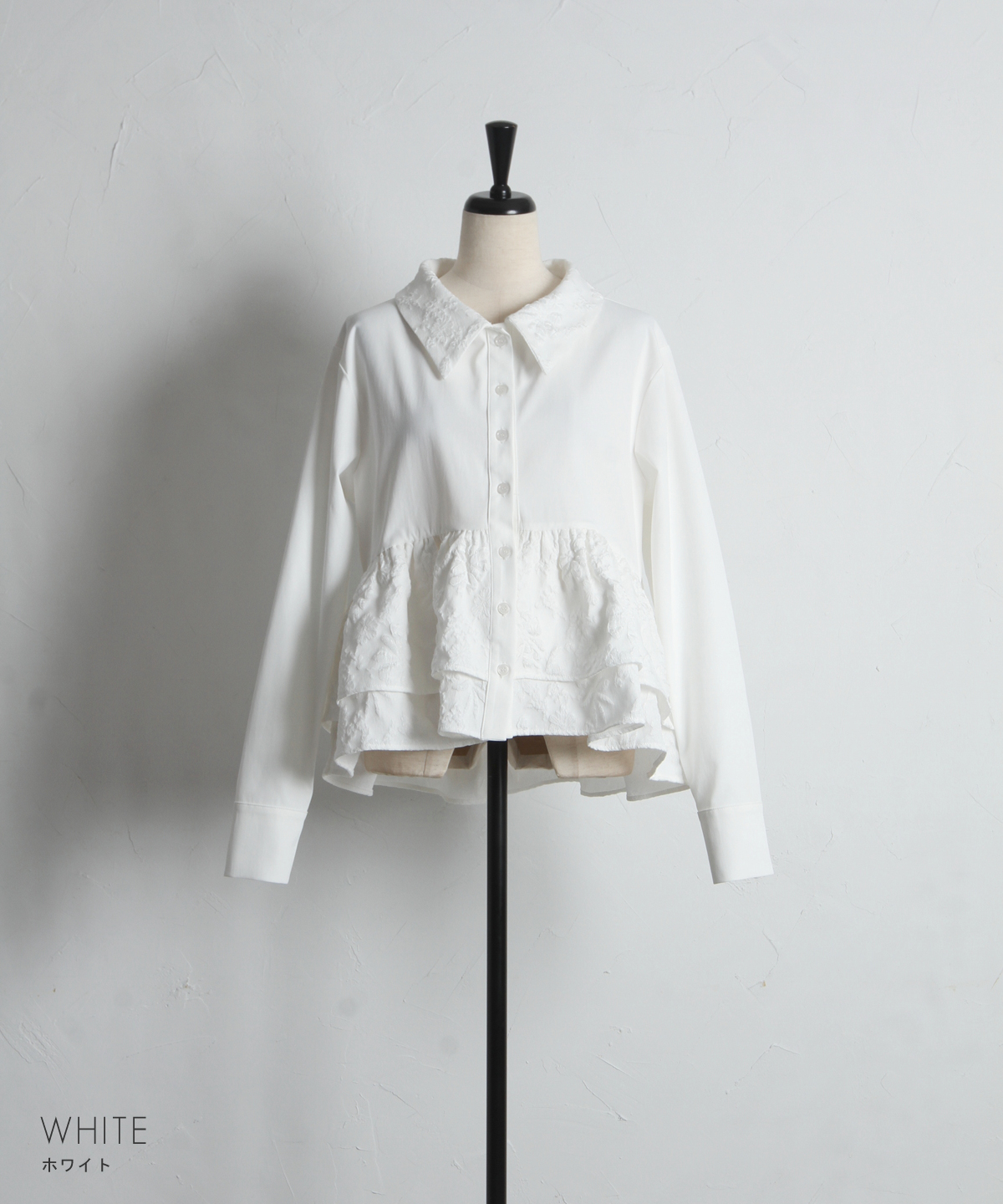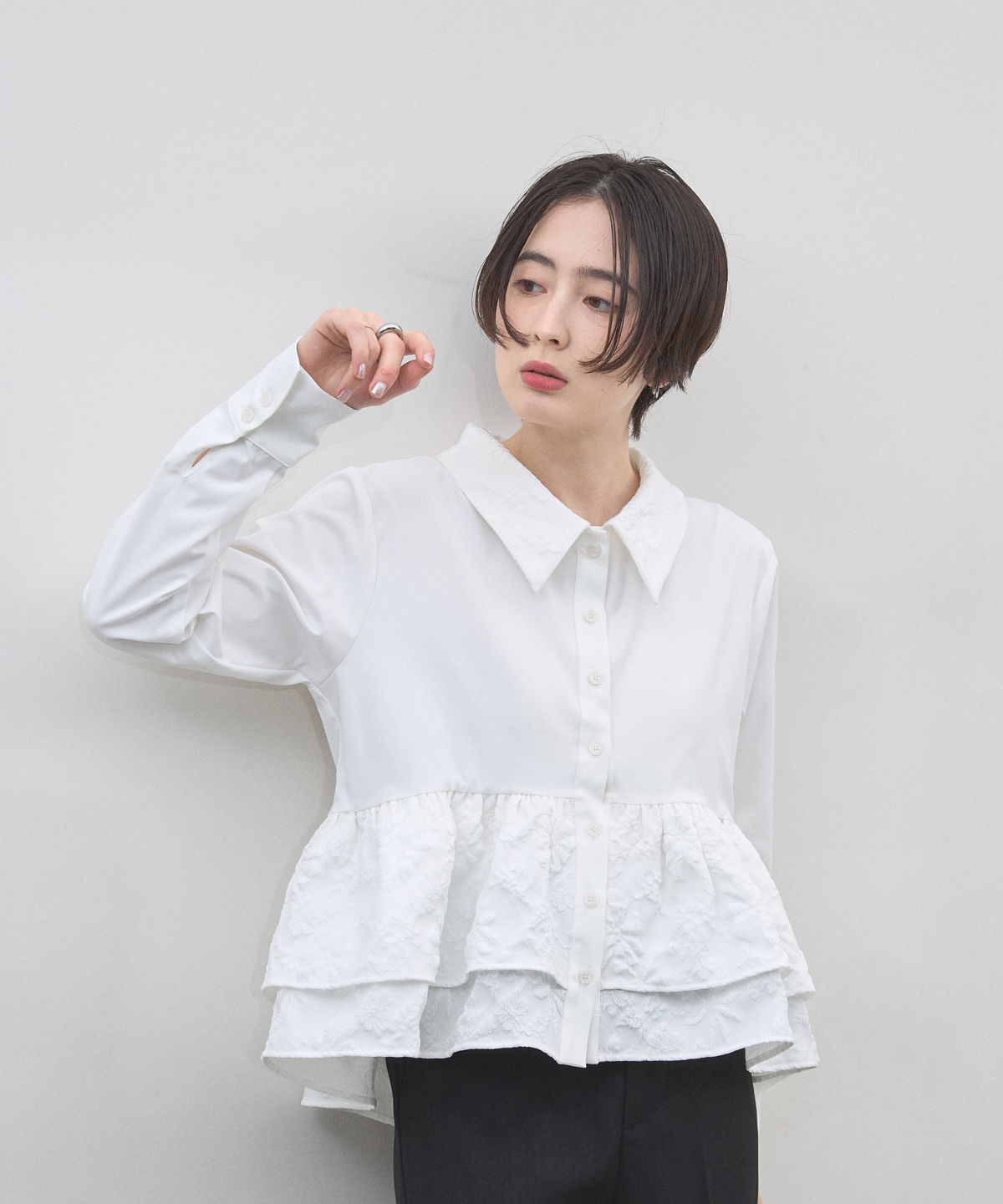 | 商品説明 | : | 光を纏う繊細な刺繍。360度どこから見てもドラマティックな、大人のティアードブラウス。 クリーンなシャツ地に、可憐なフラワー刺繍を施したフリルを贅沢にあしらったデザインブラウス。 計算されたティアードのボリュームが、 歩くたびにふんわりと軽やかな躍動感を生み出し、スタイリングに華やかな奥行きをプラスします。 きちんと感のある襟元と、ふんわりとした裾のコントラストが、女性らしさを最大限に引き立てるポイント。 ブラックのパンツで引き締めれば、甘さを抑えた都会的なモードスタイルの完成です。 アウトスタイルが決まりやすい丈感で、 どんなボトムスともバランス良く着こなせる、ワードローブの主役になる一枚です。 |