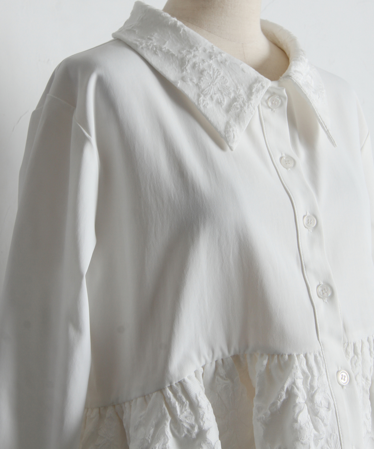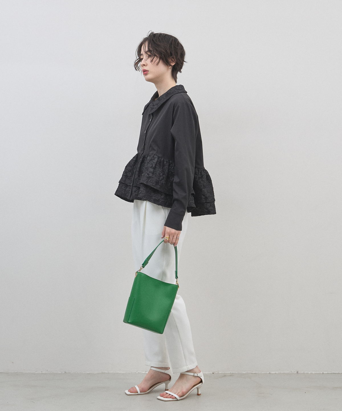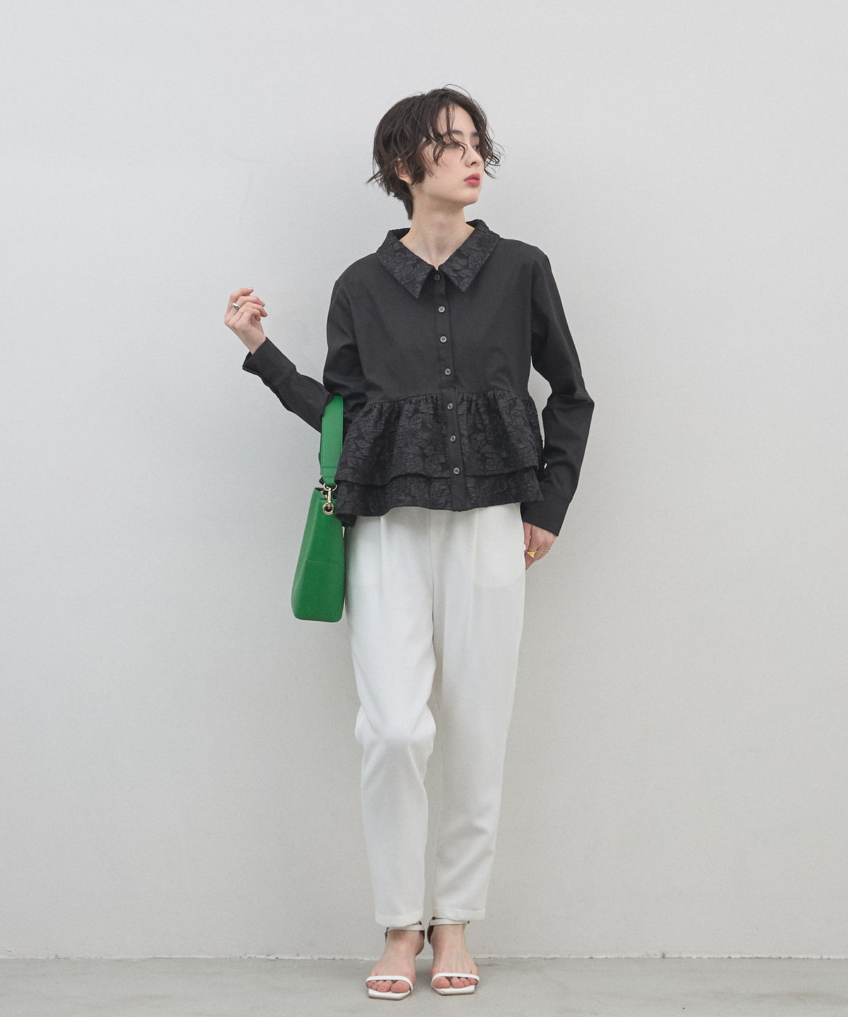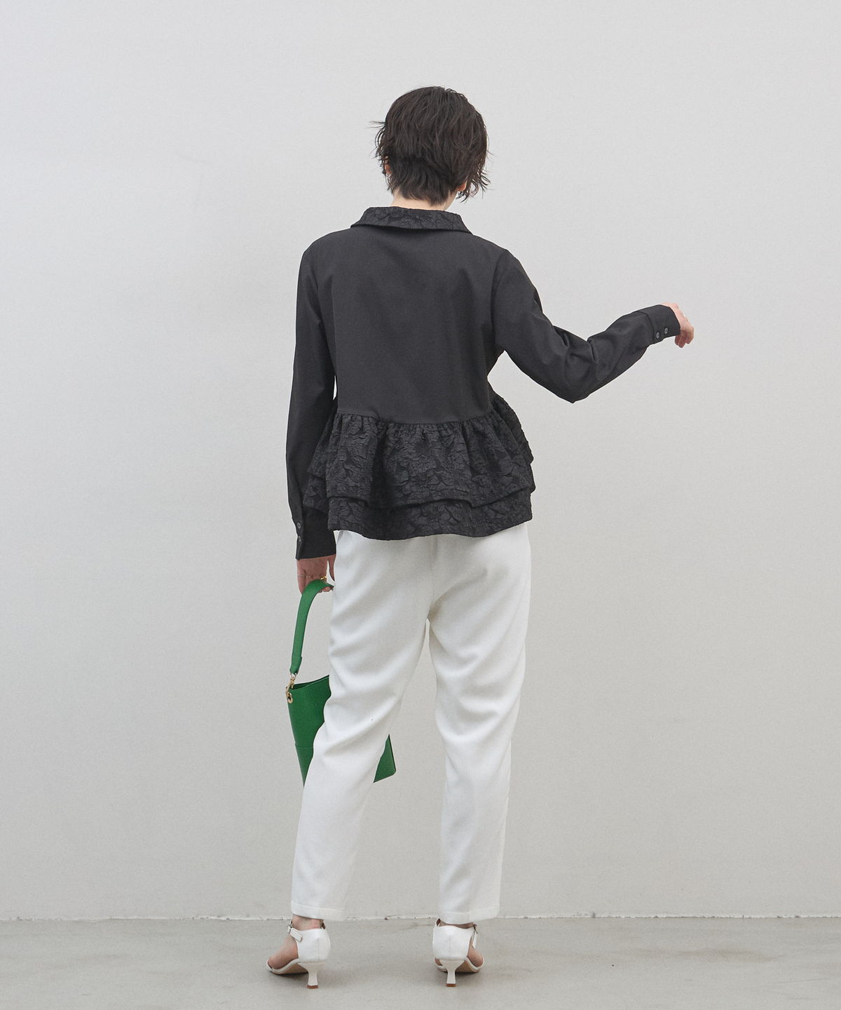 | 商品説明 | : | 光を纏う繊細な刺繍。360度どこから見てもドラマティックな、大人のティアードブラウス。 クリーンなシャツ地に、可憐なフラワー刺繍を施したフリルを贅沢にあしらったデザインブラウス。 計算されたティアードのボリュームが、 歩くたびにふんわりと軽やかな躍動感を生み出し、スタイリングに華やかな奥行きをプラスします。 きちんと感のある襟元と、ふんわりとした裾のコントラストが、女性らしさを最大限に引き立てるポイント。 ブラックのパンツで引き締めれば、甘さを抑えた都会的なモードスタイルの完成です。 アウトスタイルが決まりやすい丈感で、 どんなボトムスともバランス良く着こなせる、ワードローブの主役になる一枚です。 |