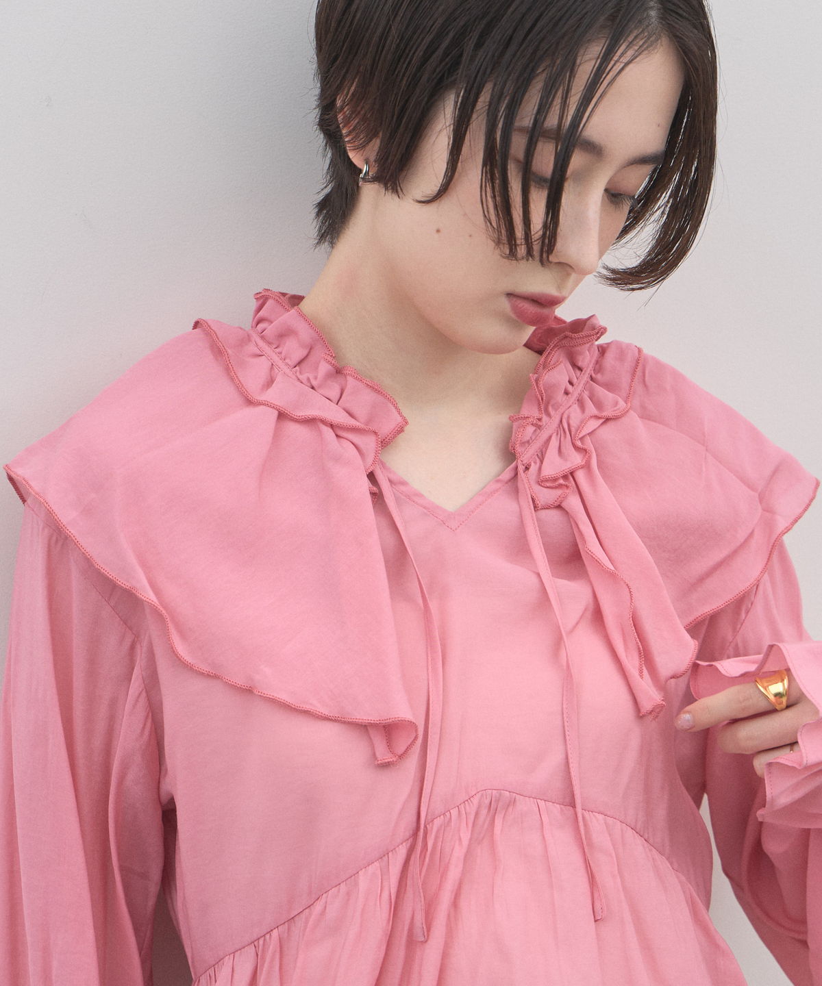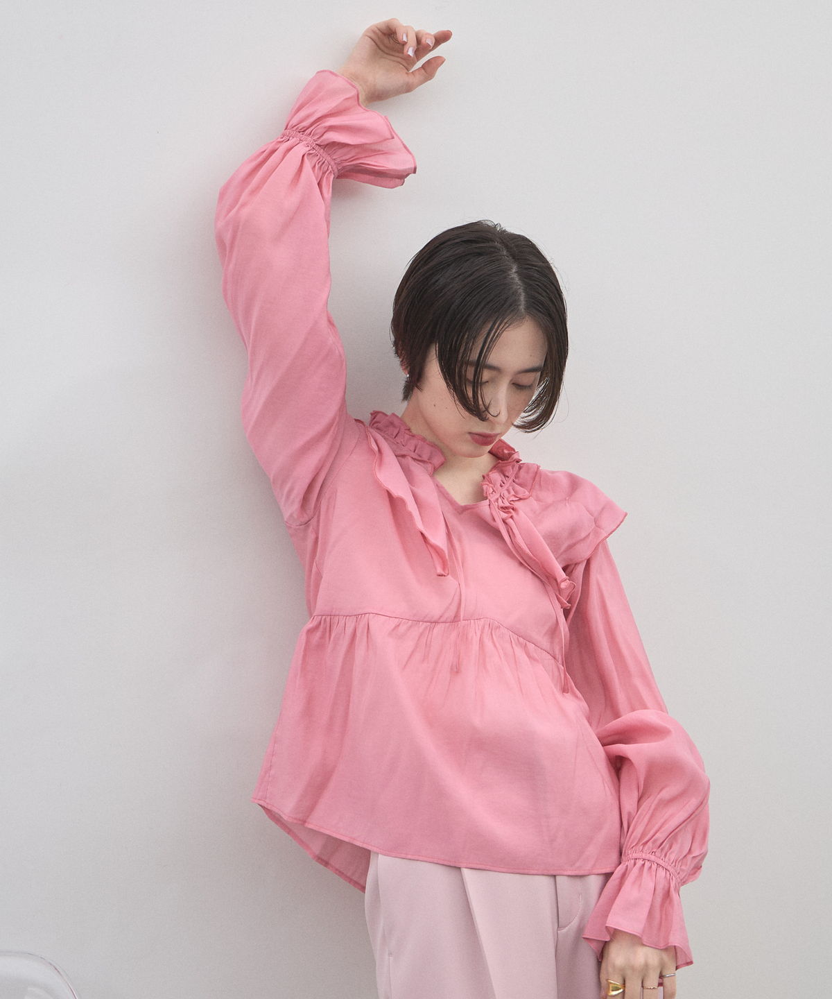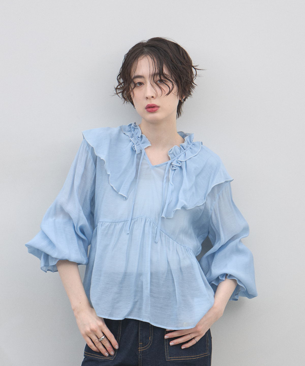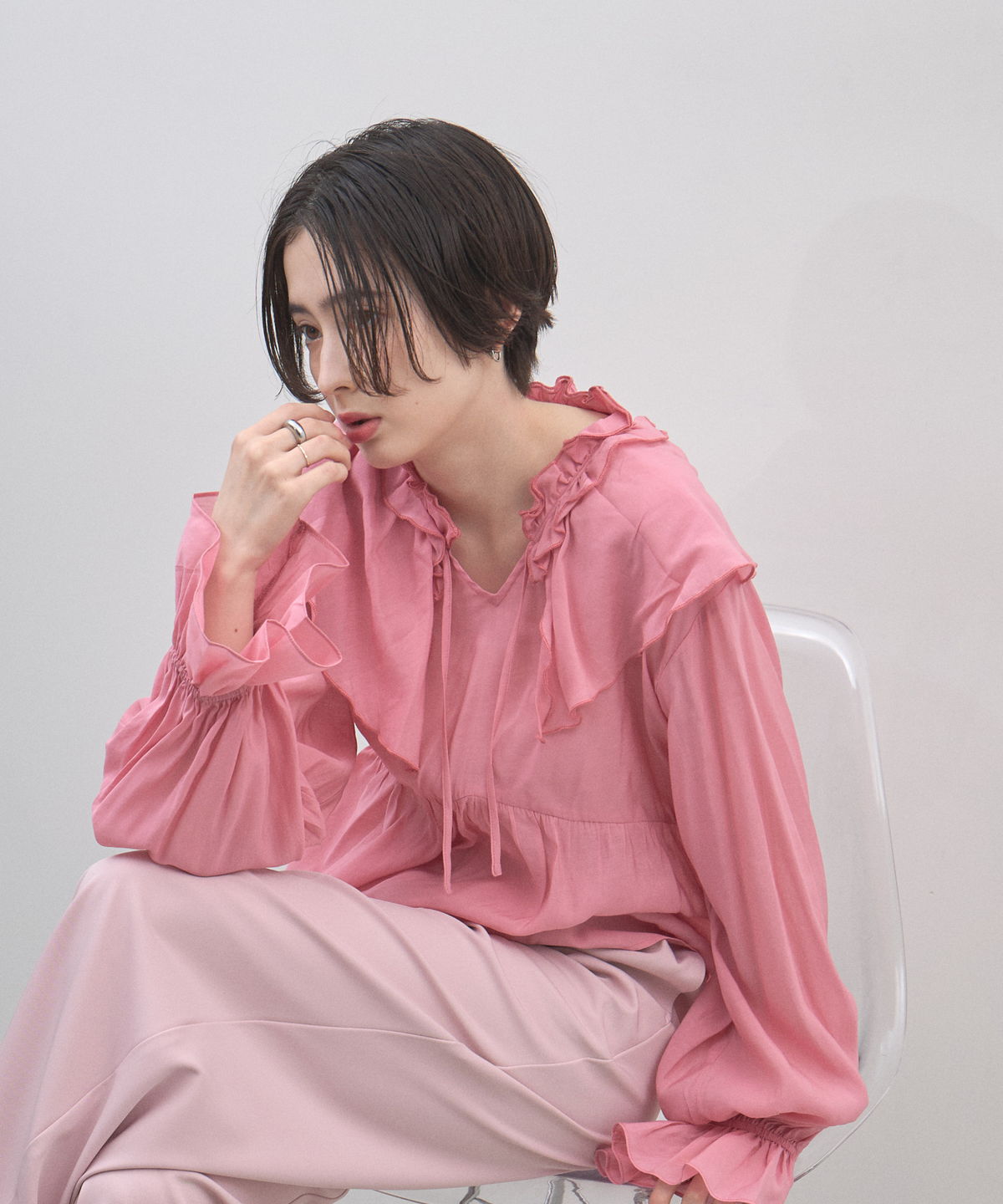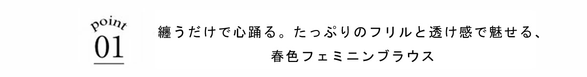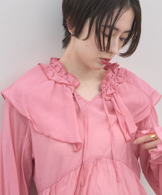 | 商品説明 | : | 纏うだけで心踊る。たっぷりのフリルと透け感で魅せる、春色フェミニンブラウス。 視線を惹きつける鮮やかなカラーが、表情まで明るく彩る主役級トップス。襟元から肩にかけて大胆にあしらわれたフリルと、袖口のシャーリングデザインが、動くたびにドラマティックな躍動感を生み出します。 程よいシアー感のある軽やかな素材を採用し、ボリュームのあるデザインながらも軽やかな印象に。Vネックのラインがデコルテをすっきりと見せ、甘さの中に大人の抜け感をプラスしてくれます。同系色のボトムスと合わせたワントーンコーデはもちろん、デニムでラフに着崩すスタイルもおすすめ。いつもの日常に華やかな彩りを添えてくれる一着です。 |