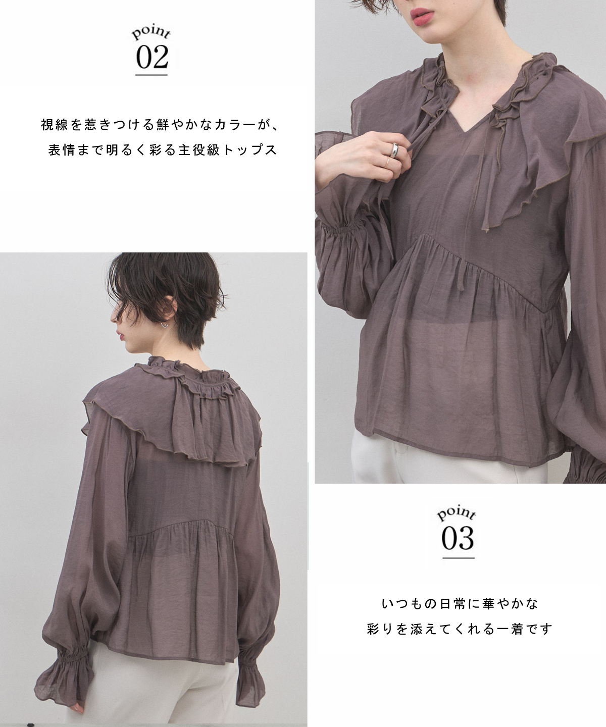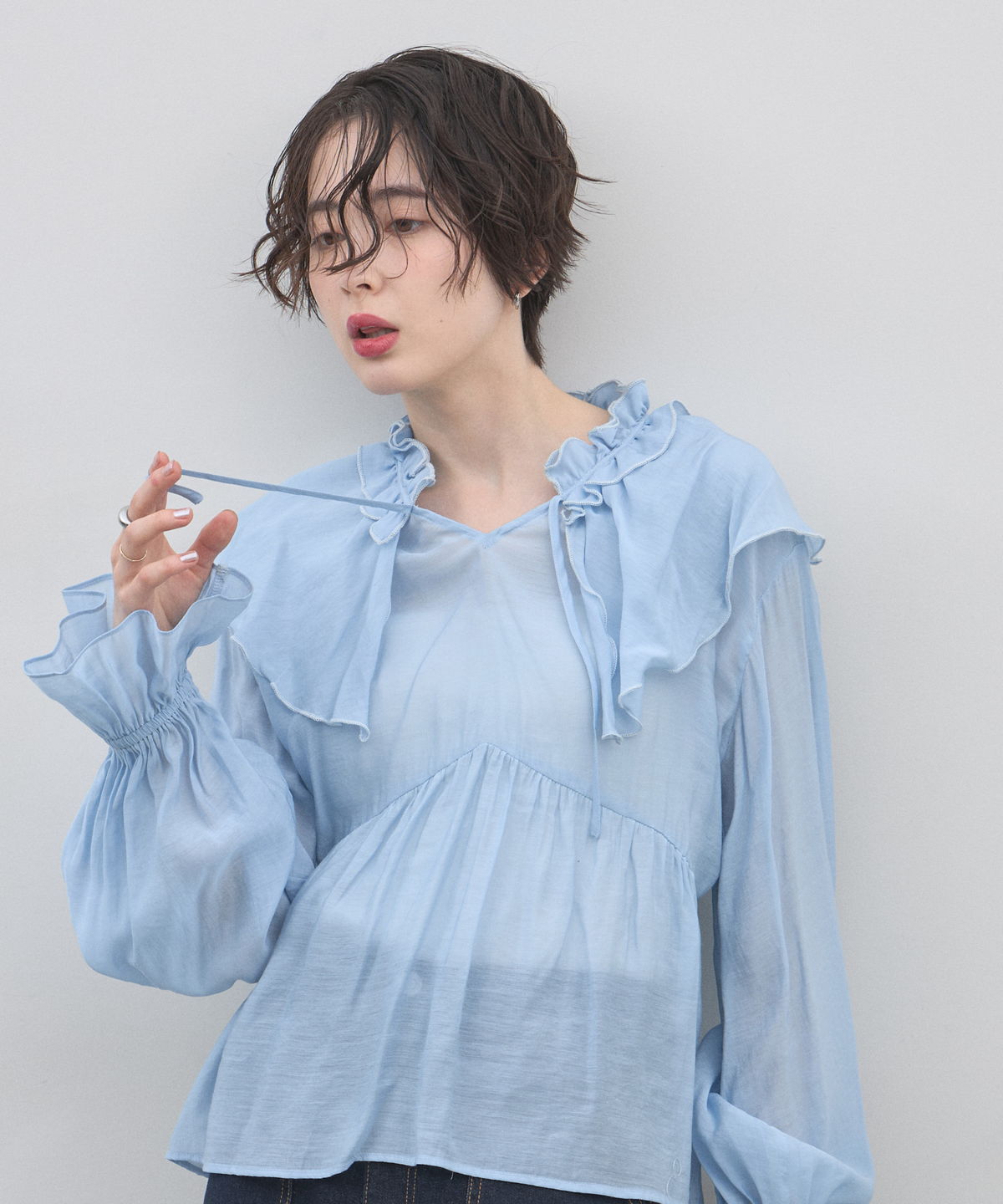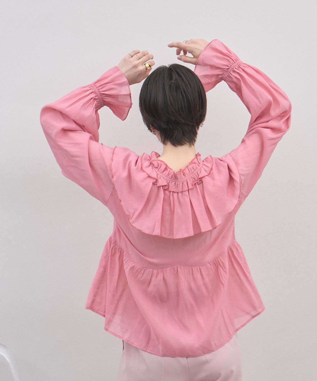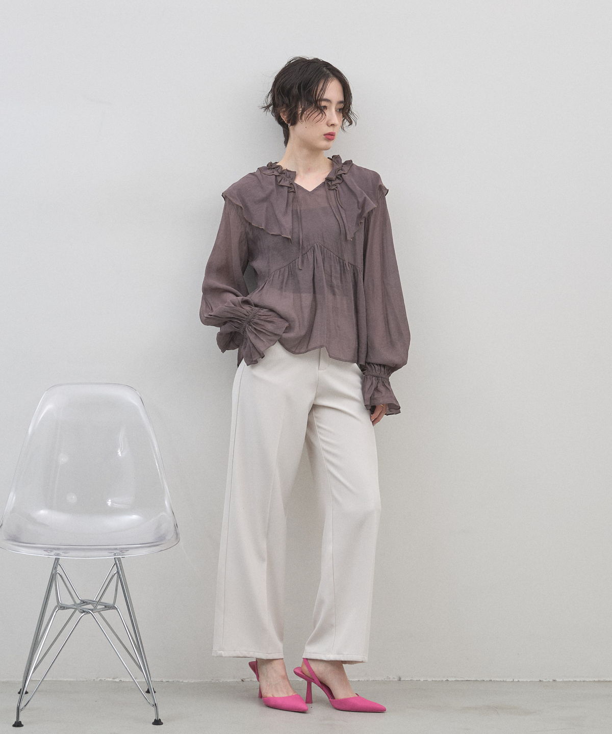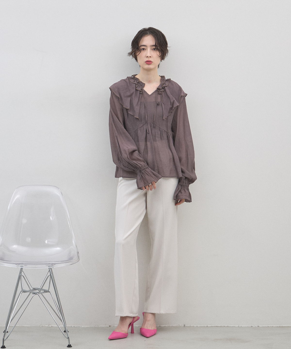 | 商品説明 | : | 纏うだけで心踊る。たっぷりのフリルと透け感で魅せる、春色フェミニンブラウス。 視線を惹きつける鮮やかなカラーが、表情まで明るく彩る主役級トップス。襟元から肩にかけて大胆にあしらわれたフリルと、袖口のシャーリングデザインが、動くたびにドラマティックな躍動感を生み出します。 程よいシアー感のある軽やかな素材を採用し、ボリュームのあるデザインながらも軽やかな印象に。Vネックのラインがデコルテをすっきりと見せ、甘さの中に大人の抜け感をプラスしてくれます。同系色のボトムスと合わせたワントーンコーデはもちろん、デニムでラフに着崩すスタイルもおすすめ。いつもの日常に華やかな彩りを添えてくれる一着です。 |