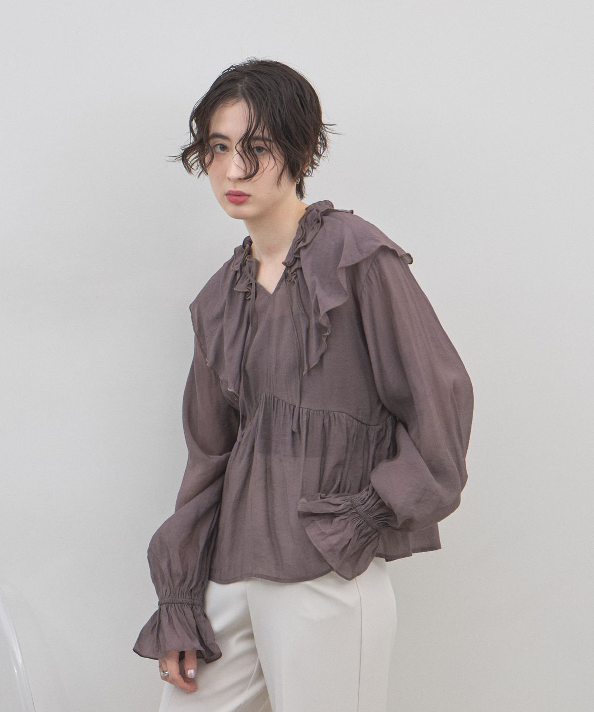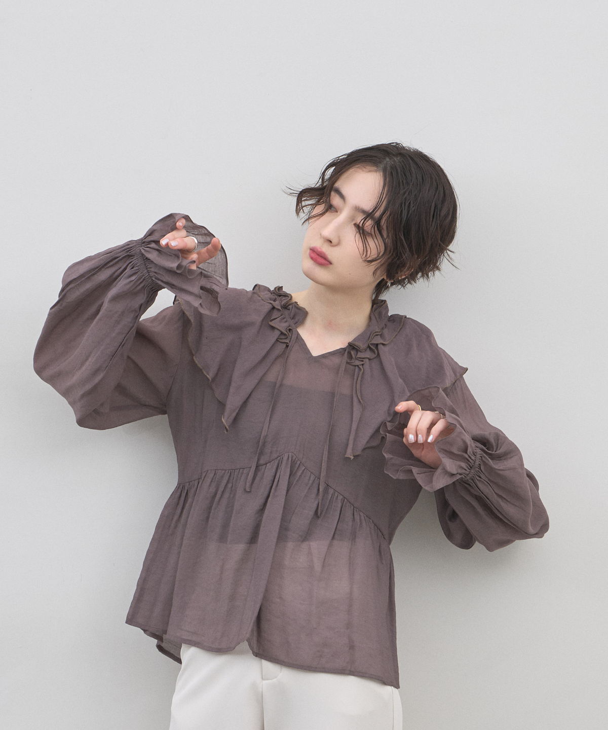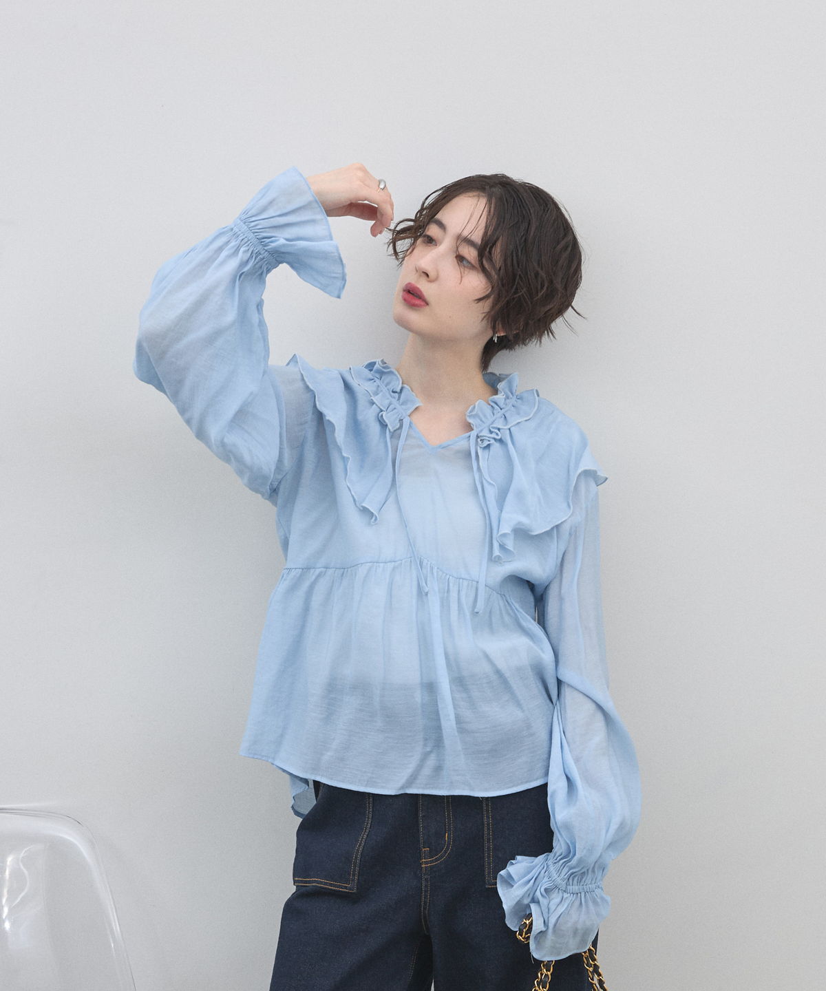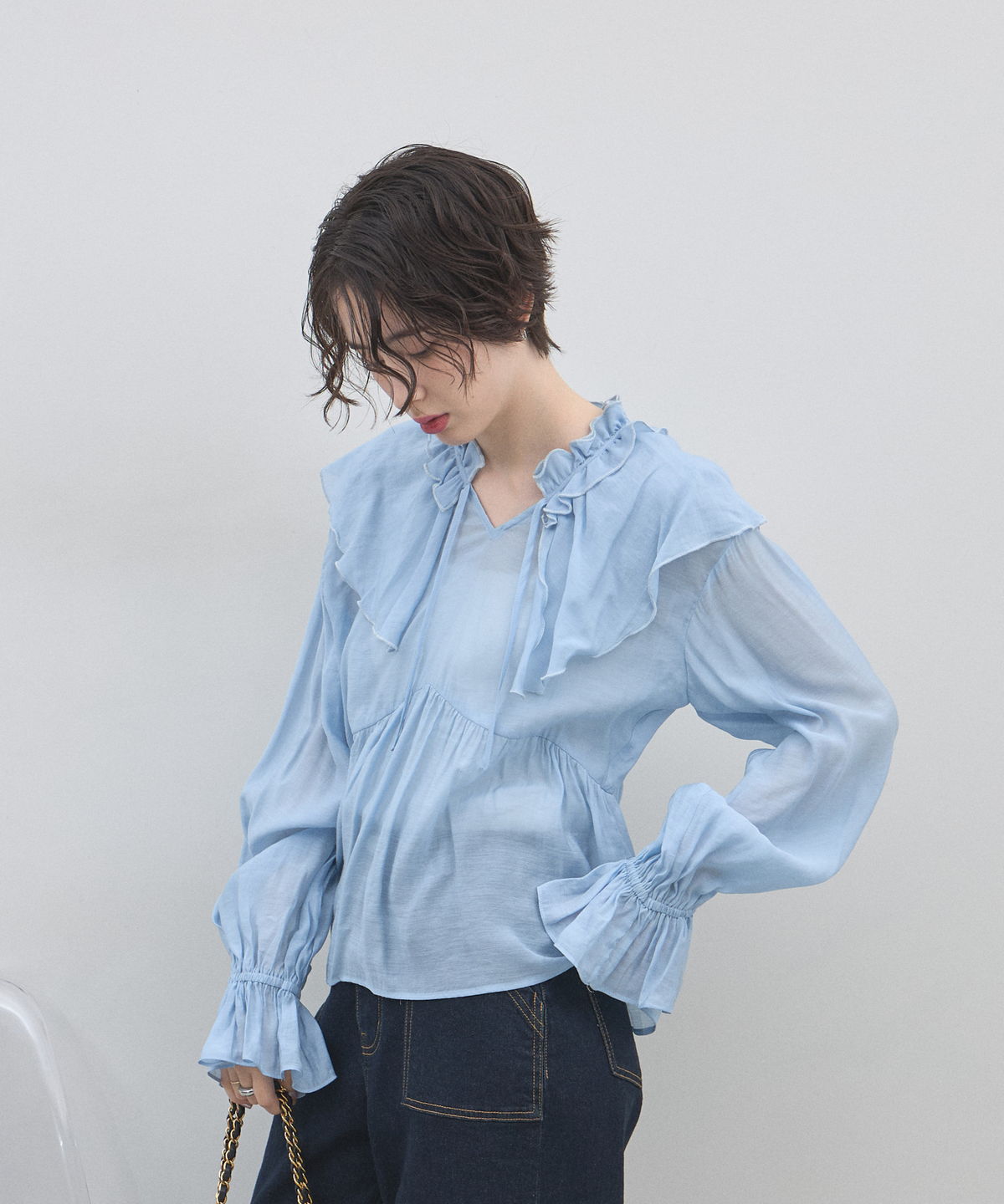 | 商品説明 | : | 纏うだけで心踊る。たっぷりのフリルと透け感で魅せる、春色フェミニンブラウス。 視線を惹きつける鮮やかなカラーが、表情まで明るく彩る主役級トップス。襟元から肩にかけて大胆にあしらわれたフリルと、袖口のシャーリングデザインが、動くたびにドラマティックな躍動感を生み出します。 程よいシアー感のある軽やかな素材を採用し、ボリュームのあるデザインながらも軽やかな印象に。Vネックのラインがデコルテをすっきりと見せ、甘さの中に大人の抜け感をプラスしてくれます。同系色のボトムスと合わせたワントーンコーデはもちろん、デニムでラフに着崩すスタイルもおすすめ。いつもの日常に華やかな彩りを添えてくれる一着です。 |
