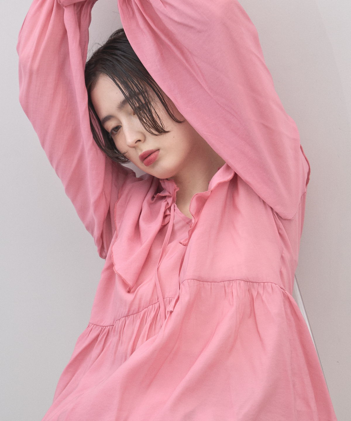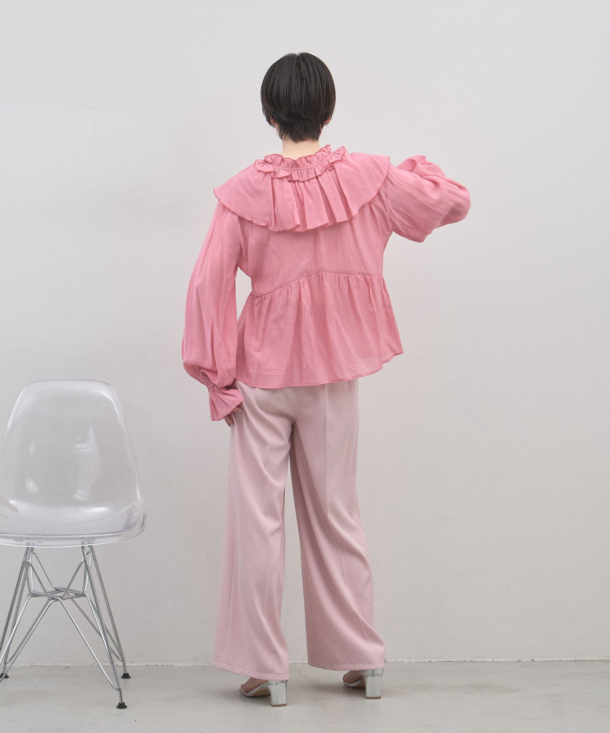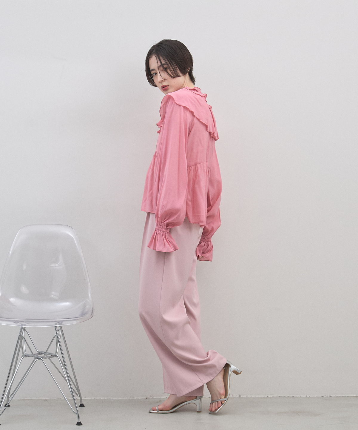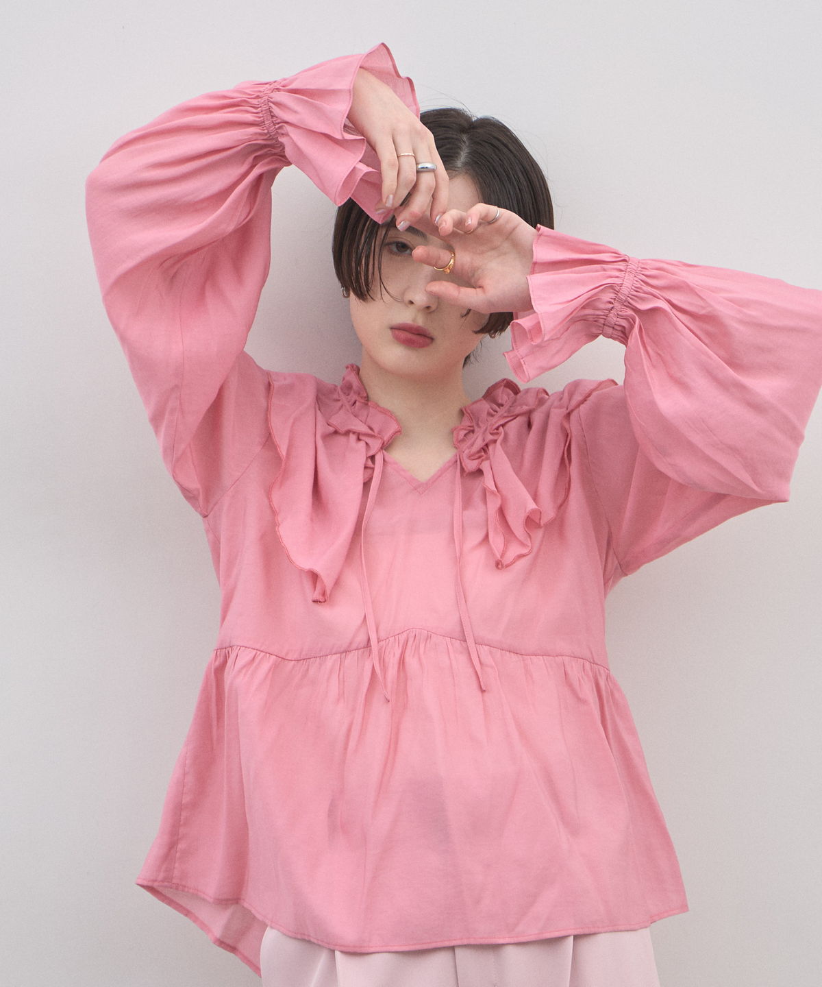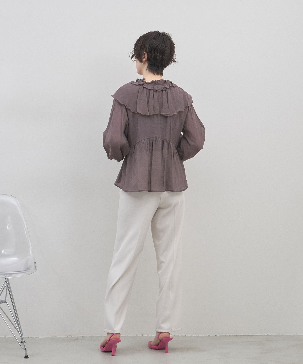 | 商品説明 | : | 纏うだけで心踊る。たっぷりのフリルと透け感で魅せる、春色フェミニンブラウス。 視線を惹きつける鮮やかなカラーが、表情まで明るく彩る主役級トップス。襟元から肩にかけて大胆にあしらわれたフリルと、袖口のシャーリングデザインが、動くたびにドラマティックな躍動感を生み出します。 程よいシアー感のある軽やかな素材を採用し、ボリュームのあるデザインながらも軽やかな印象に。Vネックのラインがデコルテをすっきりと見せ、甘さの中に大人の抜け感をプラスしてくれます。同系色のボトムスと合わせたワントーンコーデはもちろん、デニムでラフに着崩すスタイルもおすすめ。いつもの日常に華やかな彩りを添えてくれる一着です。 |