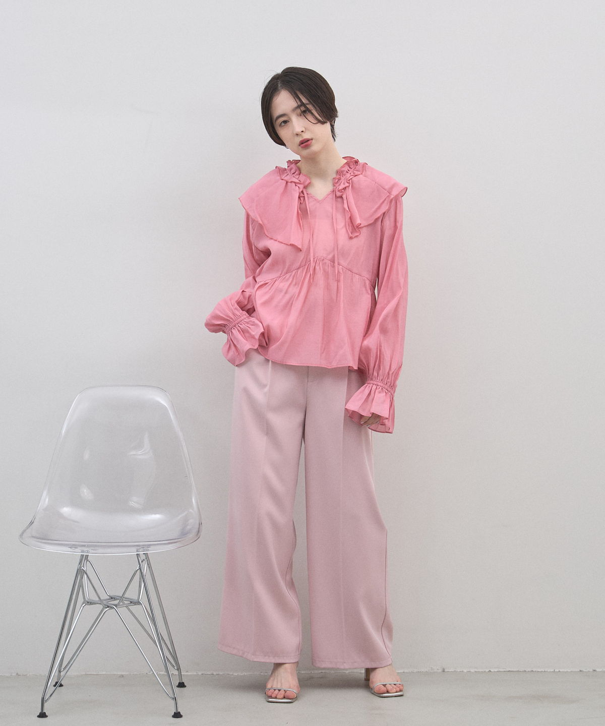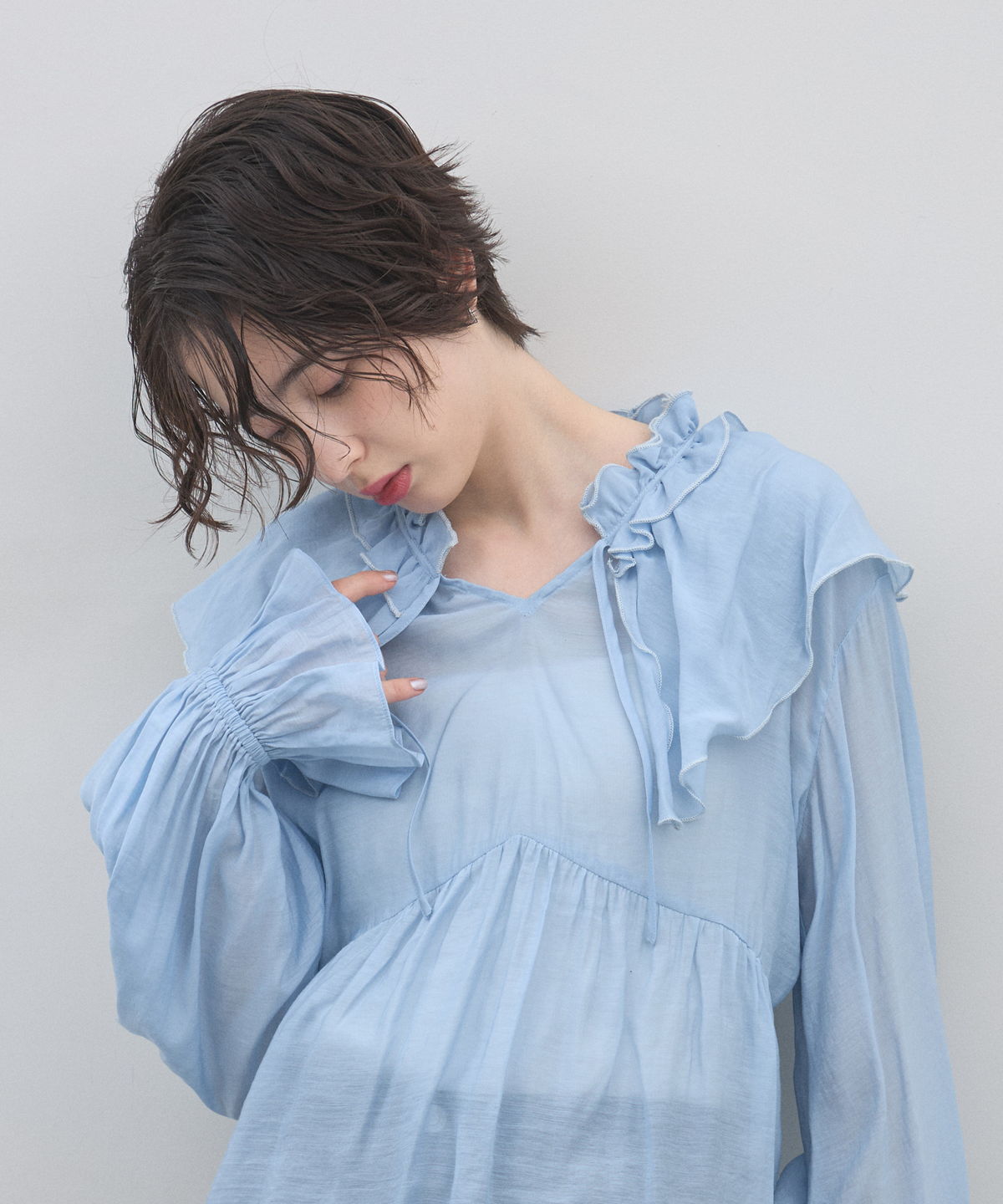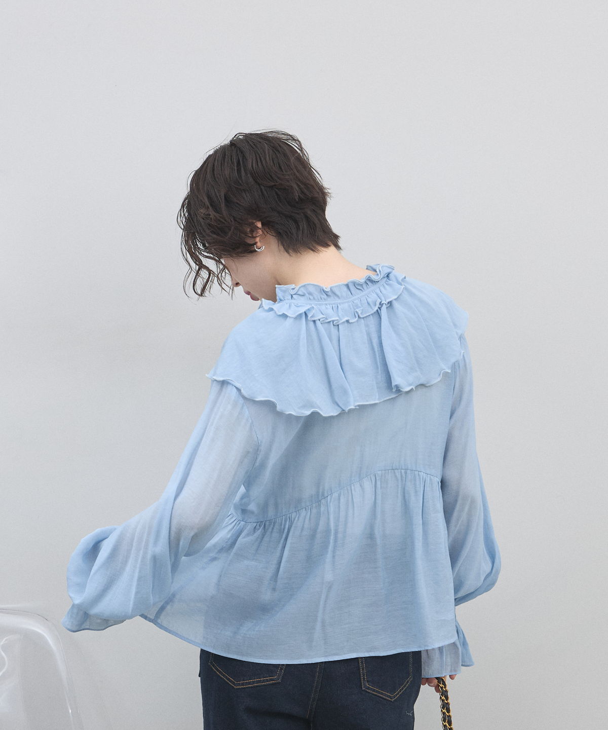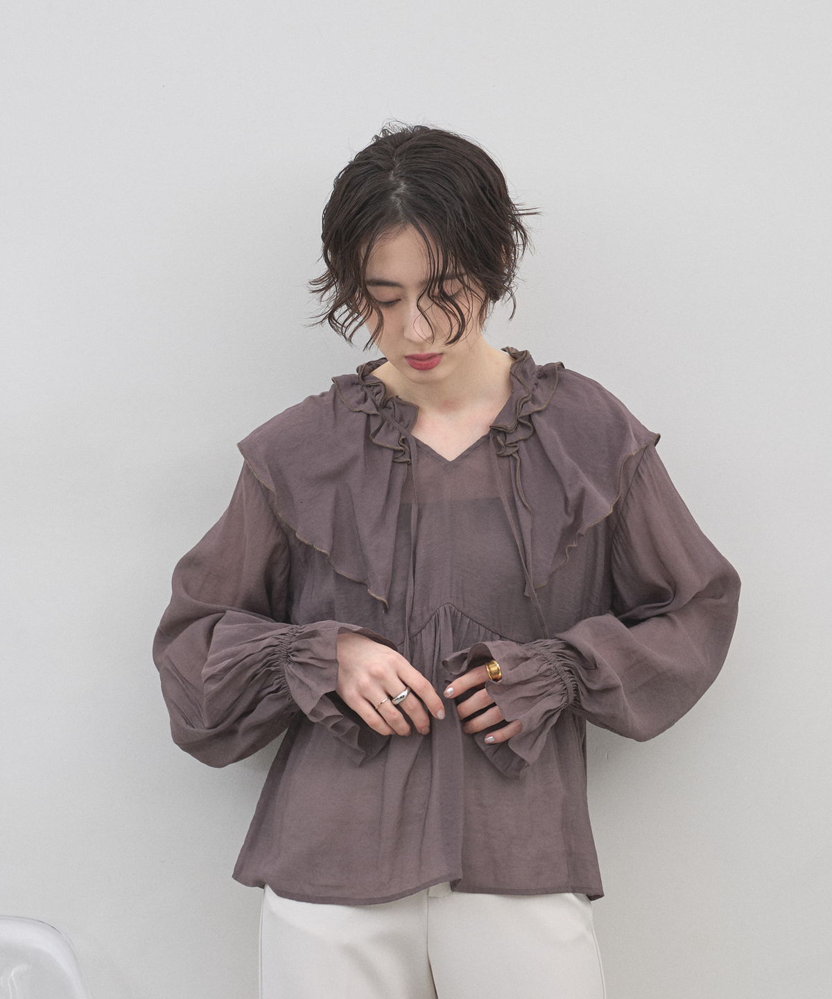 | 商品説明 | : | 纏うだけで心踊る。たっぷりのフリルと透け感で魅せる、春色フェミニンブラウス。 視線を惹きつける鮮やかなカラーが、表情まで明るく彩る主役級トップス。襟元から肩にかけて大胆にあしらわれたフリルと、袖口のシャーリングデザインが、動くたびにドラマティックな躍動感を生み出します。 程よいシアー感のある軽やかな素材を採用し、ボリュームのあるデザインながらも軽やかな印象に。Vネックのラインがデコルテをすっきりと見せ、甘さの中に大人の抜け感をプラスしてくれます。同系色のボトムスと合わせたワントーンコーデはもちろん、デニムでラフに着崩すスタイルもおすすめ。いつもの日常に華やかな彩りを添えてくれる一着です。 |