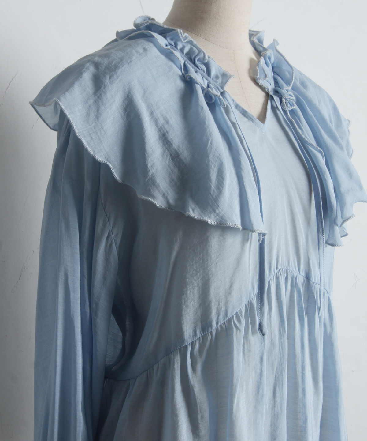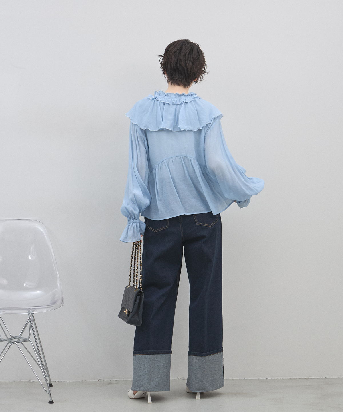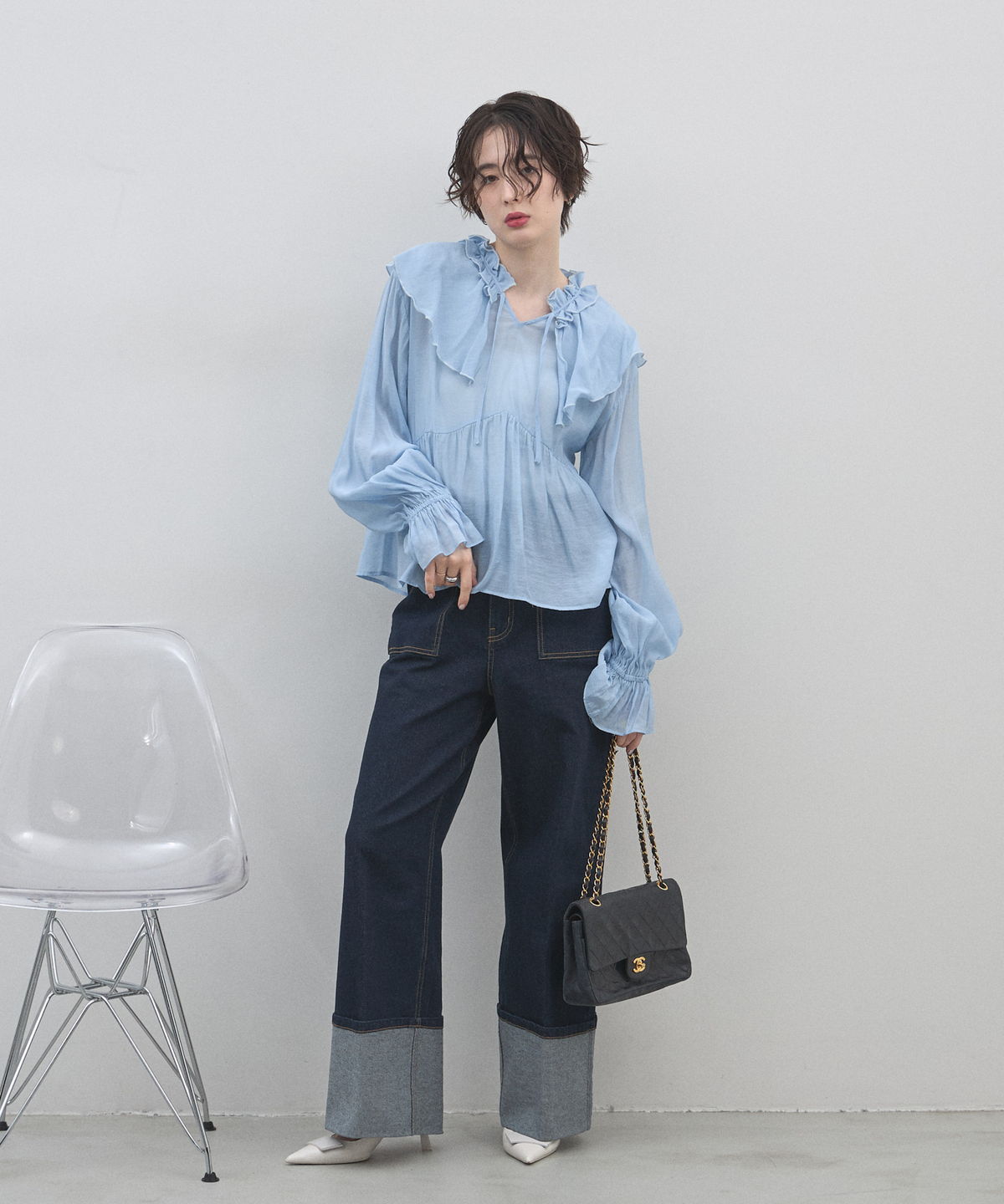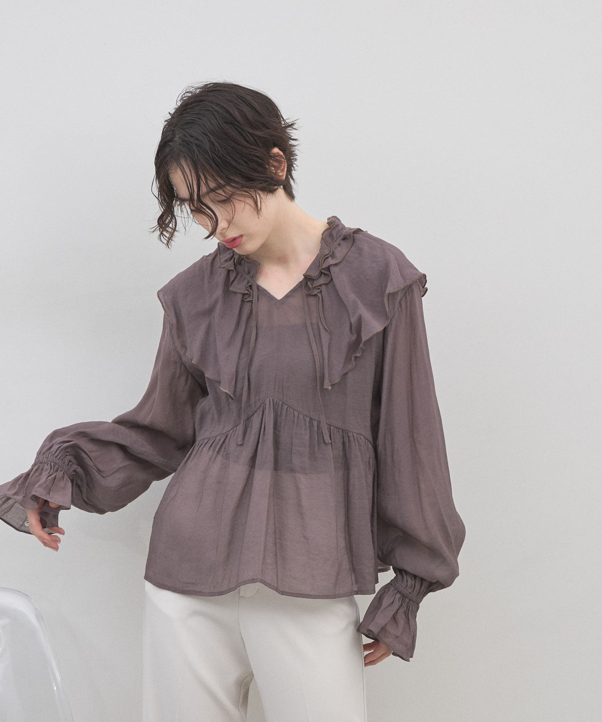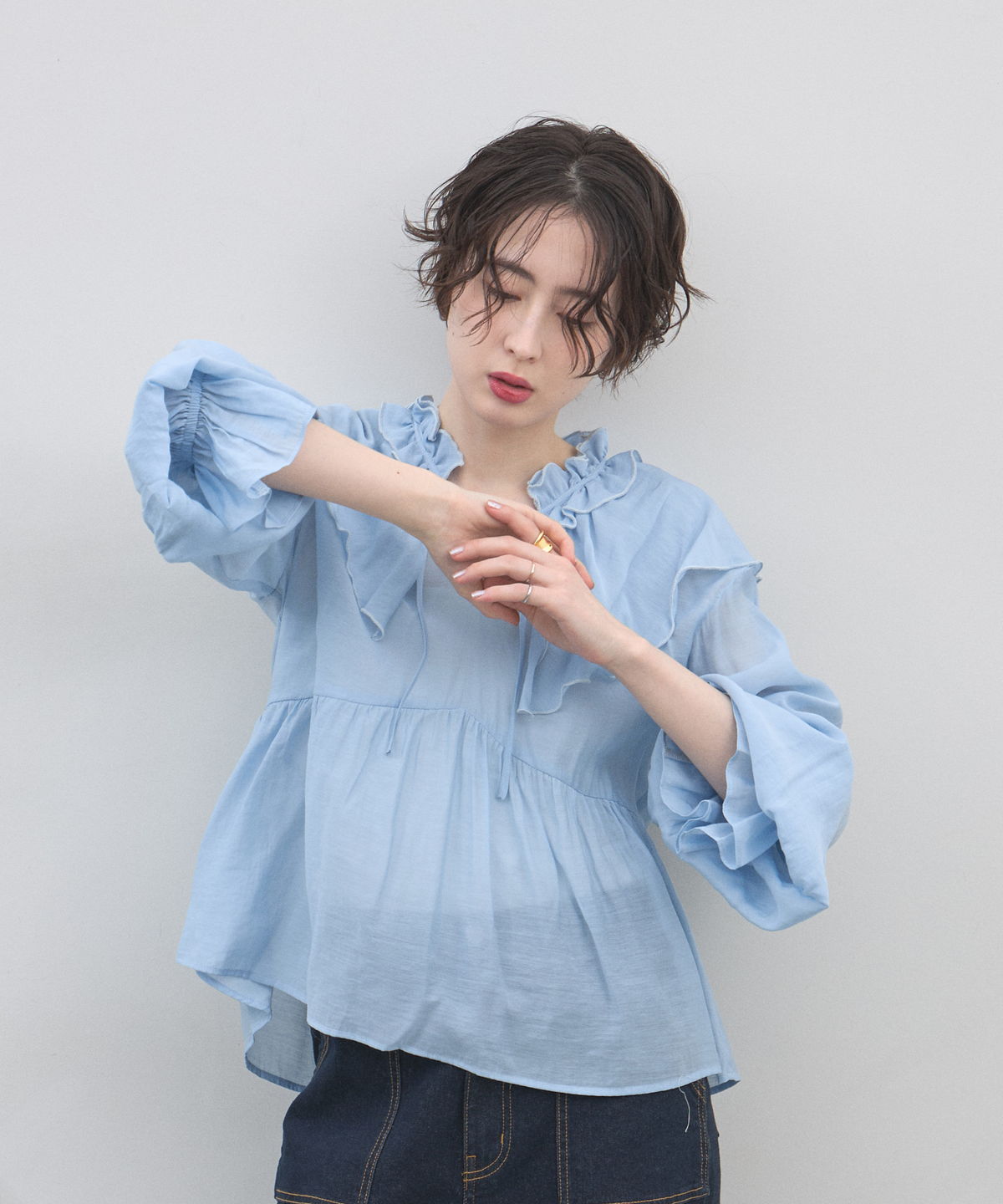 | 商品説明 | : | 纏うだけで心踊る。たっぷりのフリルと透け感で魅せる、春色フェミニンブラウス。 視線を惹きつける鮮やかなカラーが、表情まで明るく彩る主役級トップス。襟元から肩にかけて大胆にあしらわれたフリルと、袖口のシャーリングデザインが、動くたびにドラマティックな躍動感を生み出します。 程よいシアー感のある軽やかな素材を採用し、ボリュームのあるデザインながらも軽やかな印象に。Vネックのラインがデコルテをすっきりと見せ、甘さの中に大人の抜け感をプラスしてくれます。同系色のボトムスと合わせたワントーンコーデはもちろん、デニムでラフに着崩すスタイルもおすすめ。いつもの日常に華やかな彩りを添えてくれる一着です。 |