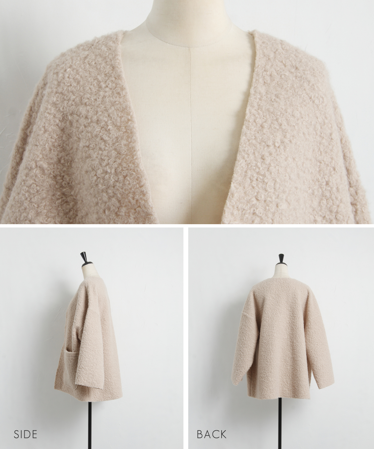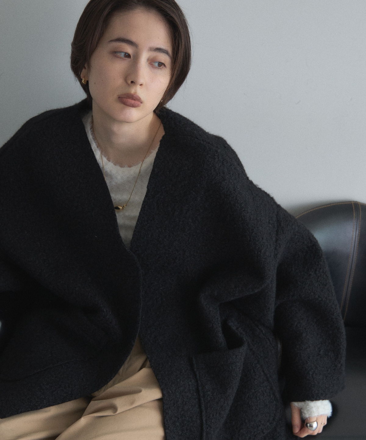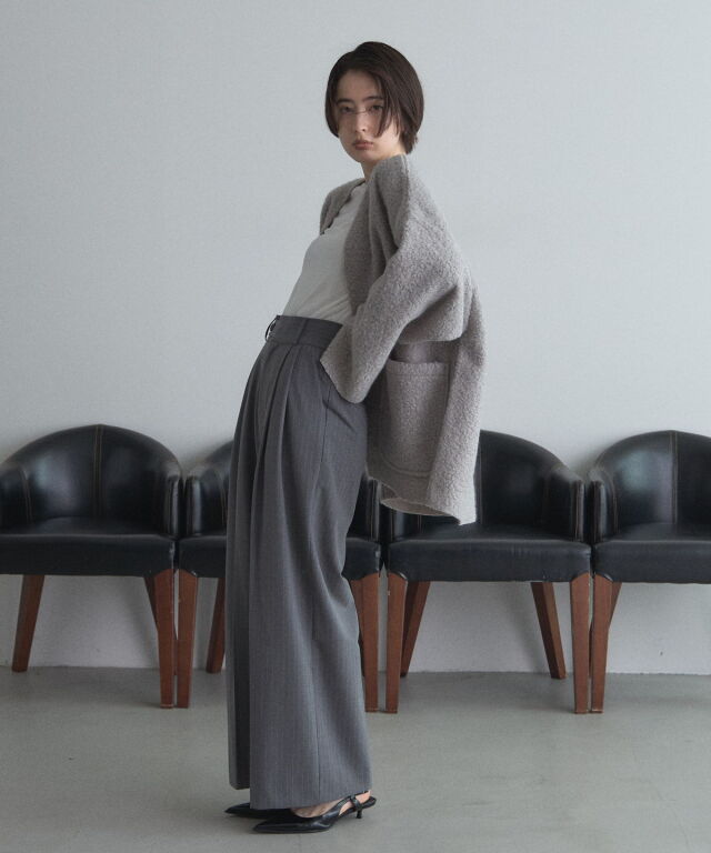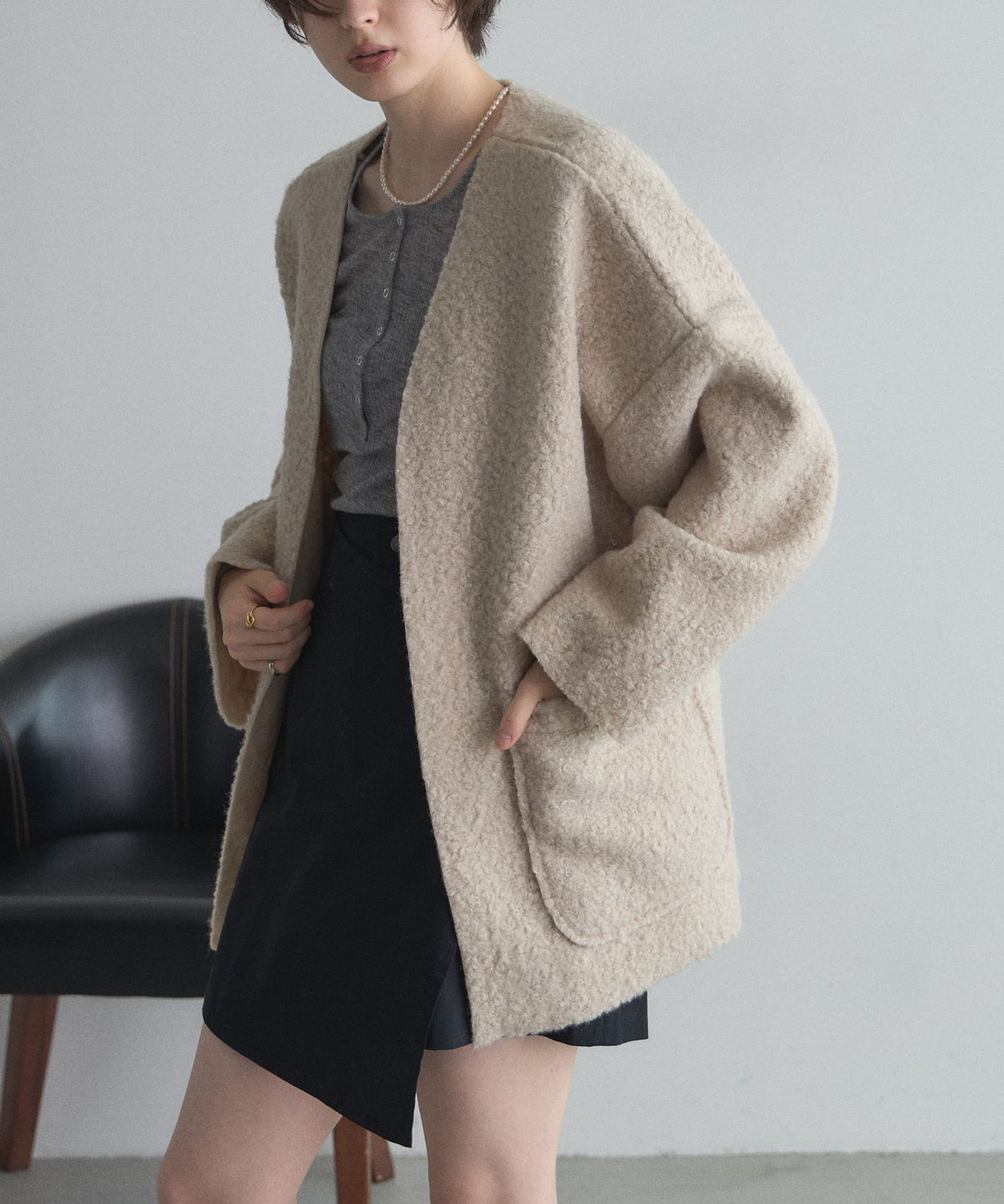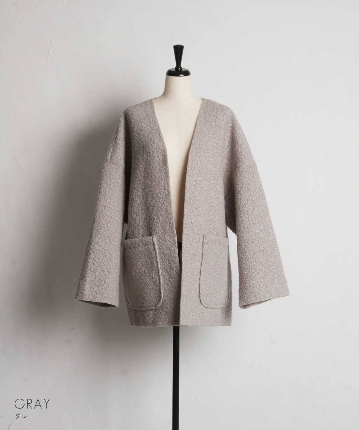 | 商品説明 | ≪ Attention:販売日、在庫状況はWEBと店舗と異なります。予めご了承くださいませ。≫ 軽く羽織れておしゃれ見え◎控えめもこもこ素材のコスパ抜群アウター ウールライクな素材が特徴的なガウンジャケット。 控えめなもこもこ感で上品な印象にしました。 大きなパッチポケットでトレンド感も機能性も◎ ゆとりを持たせたオーバーサイズで大人の抜け感コーデに仕上げてくれます。 軽やかな素材とボタンレスデザインで、さっと気軽に羽織っていただけます。 |