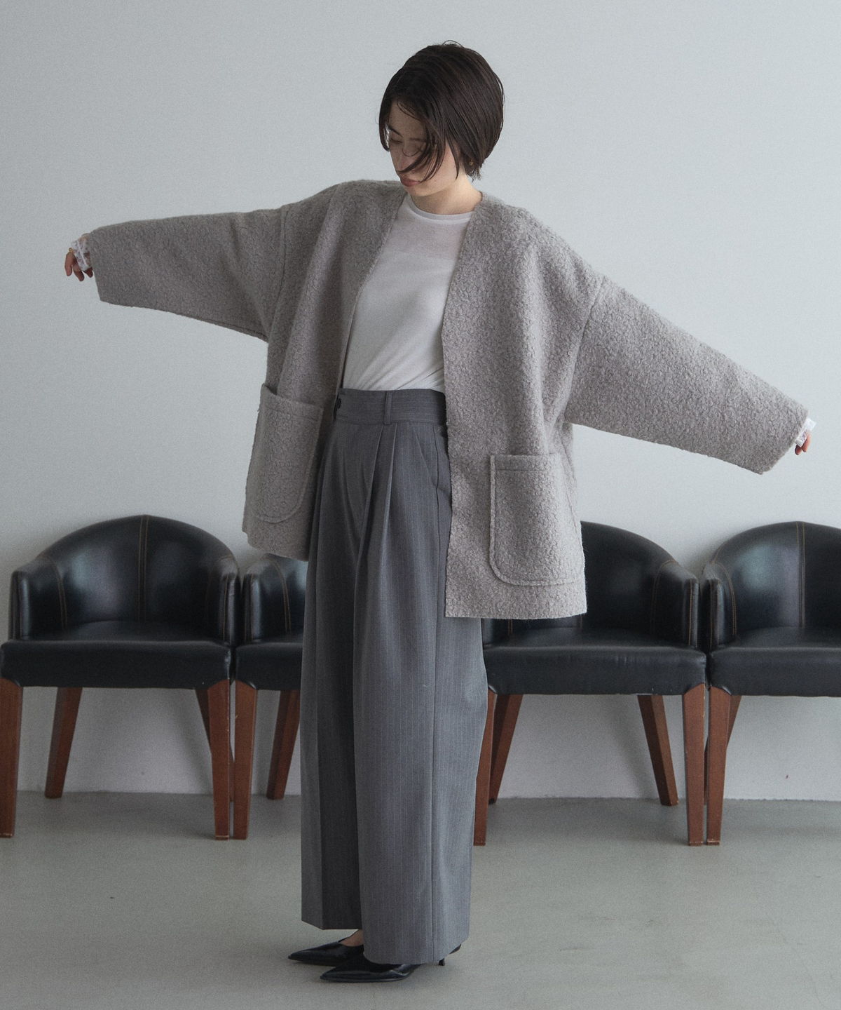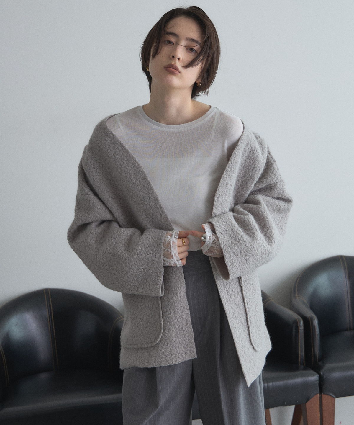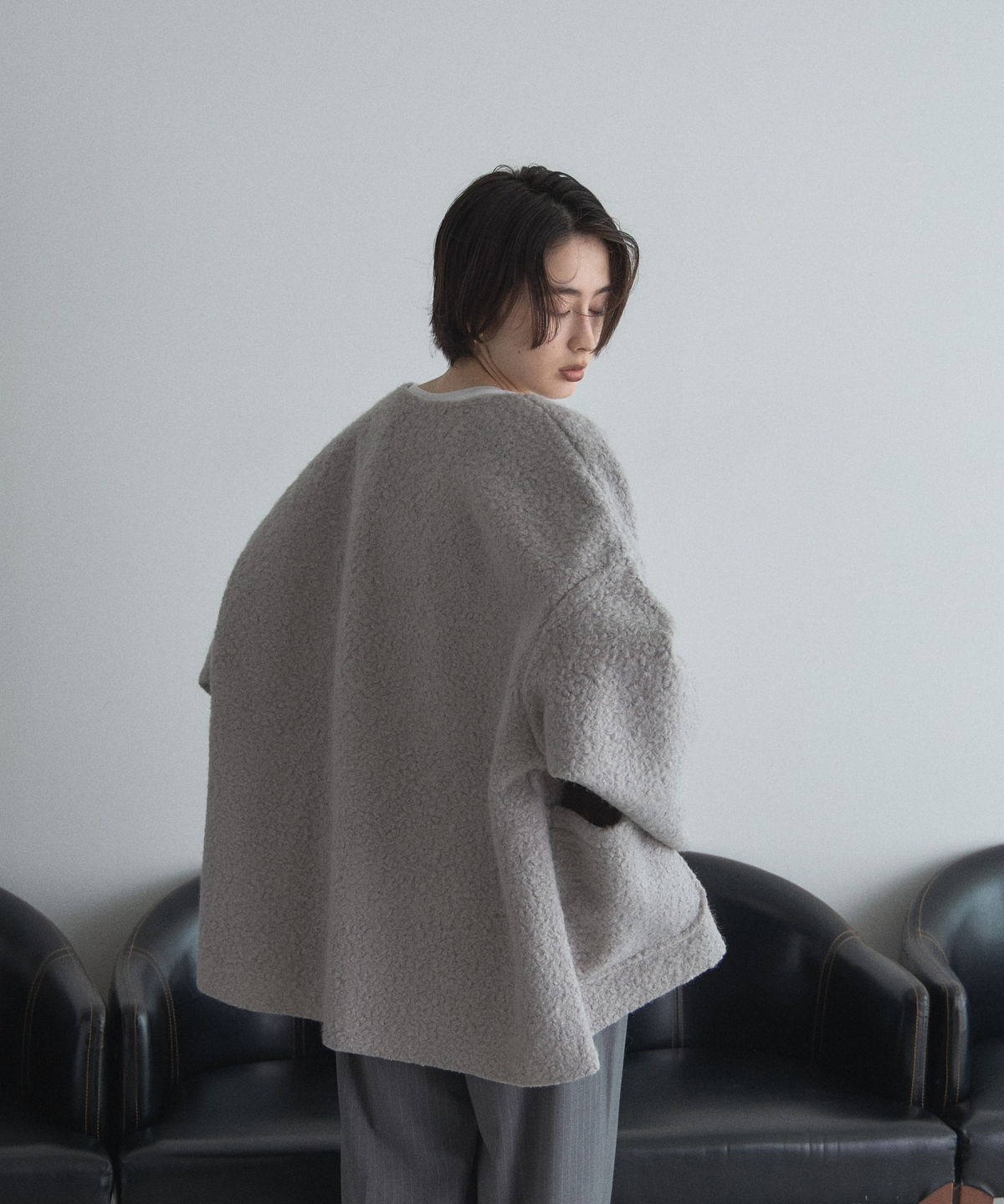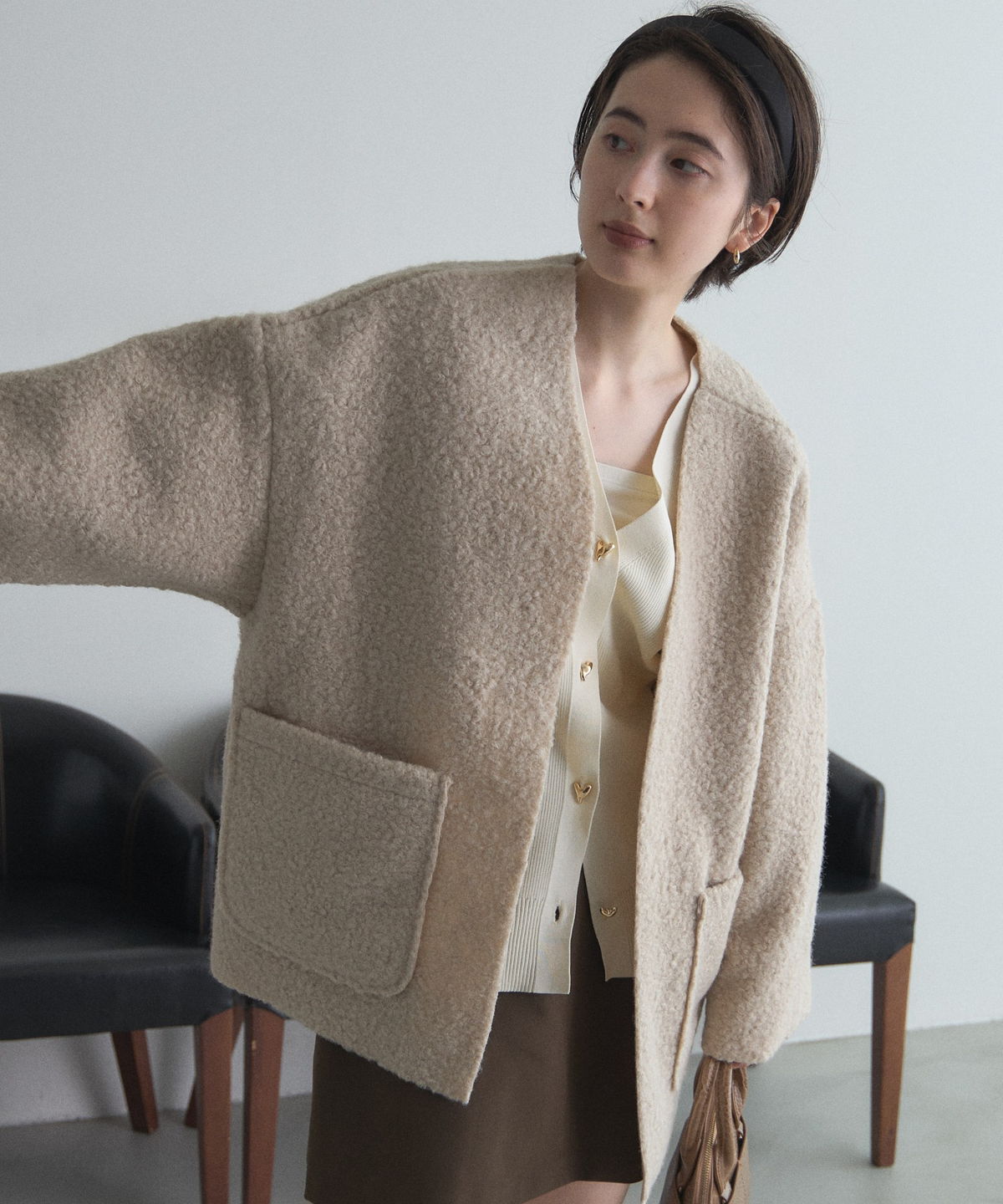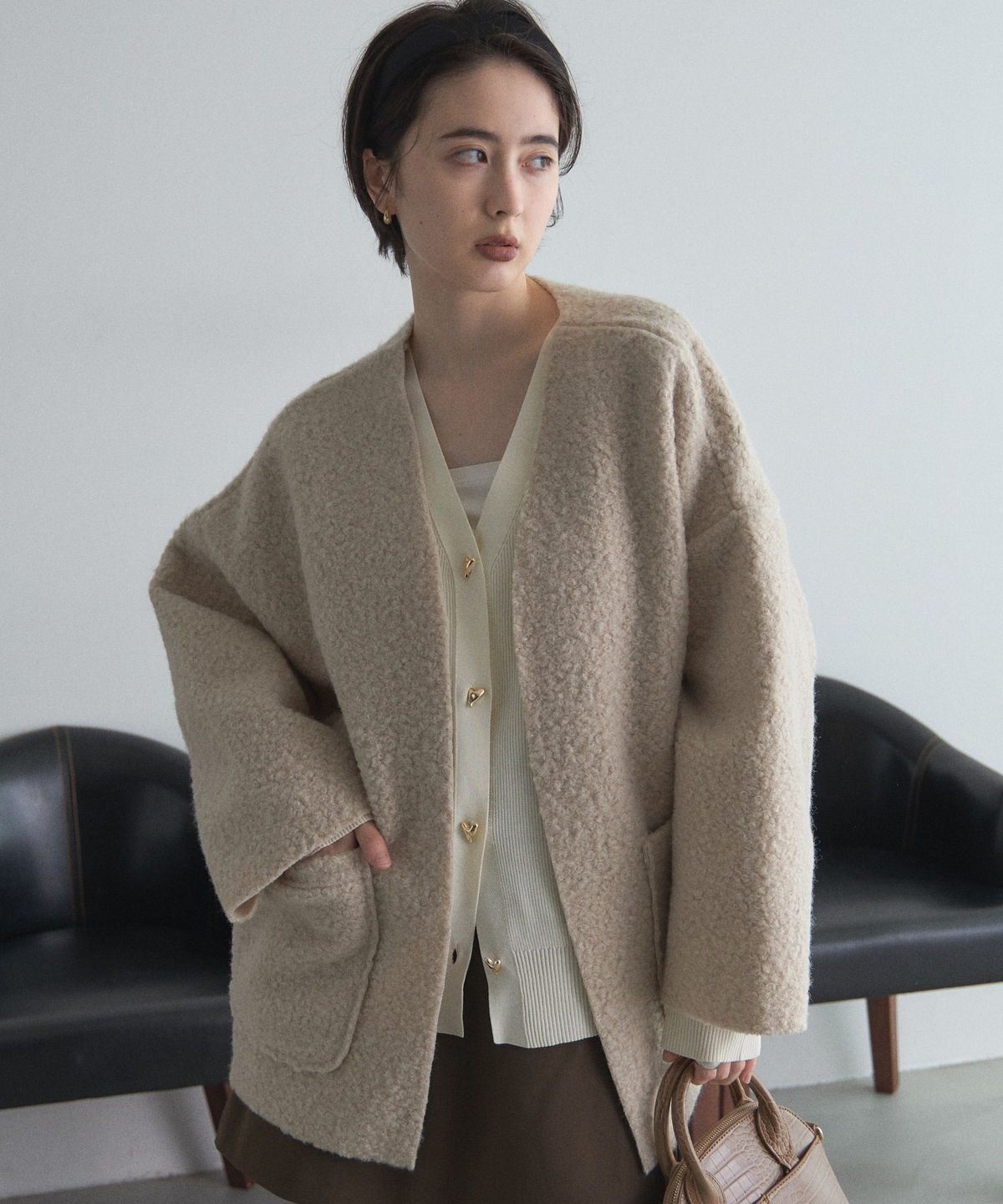 | 商品説明 | ≪ Attention:販売日、在庫状況はWEBと店舗と異なります。予めご了承くださいませ。≫ 軽く羽織れておしゃれ見え◎控えめもこもこ素材のコスパ抜群アウター ウールライクな素材が特徴的なガウンジャケット。 控えめなもこもこ感で上品な印象にしました。 大きなパッチポケットでトレンド感も機能性も◎ ゆとりを持たせたオーバーサイズで大人の抜け感コーデに仕上げてくれます。 軽やかな素材とボタンレスデザインで、さっと気軽に羽織っていただけます。 |