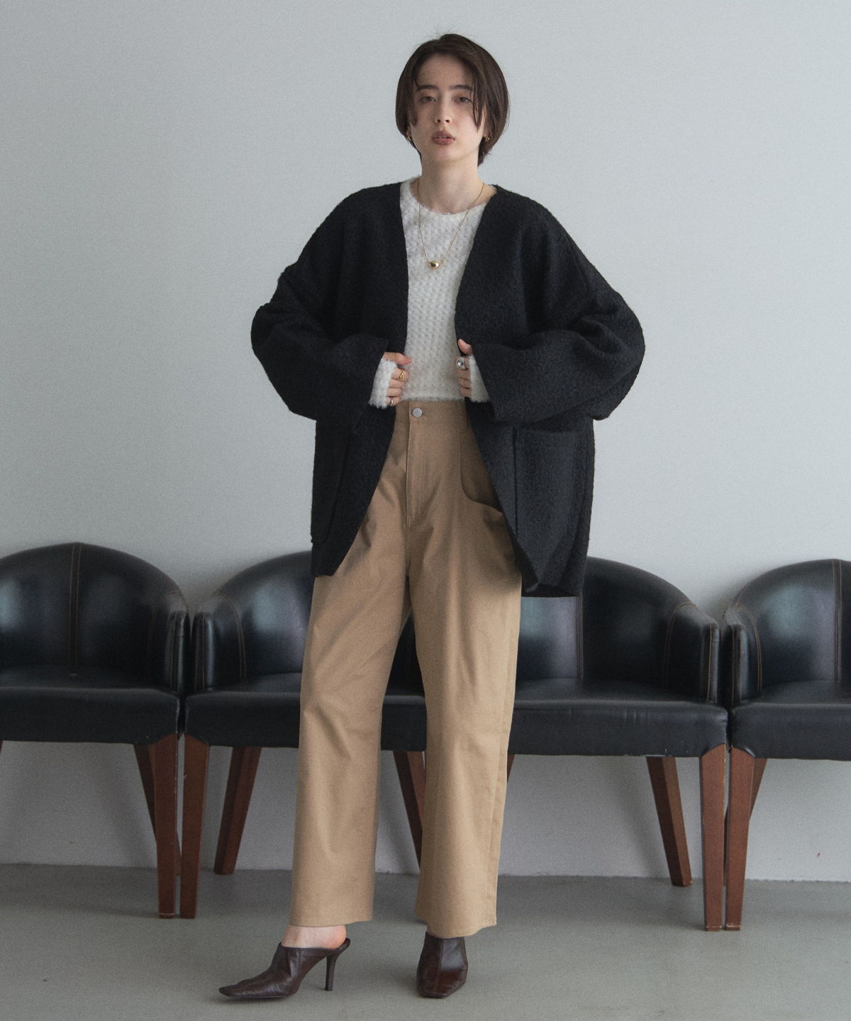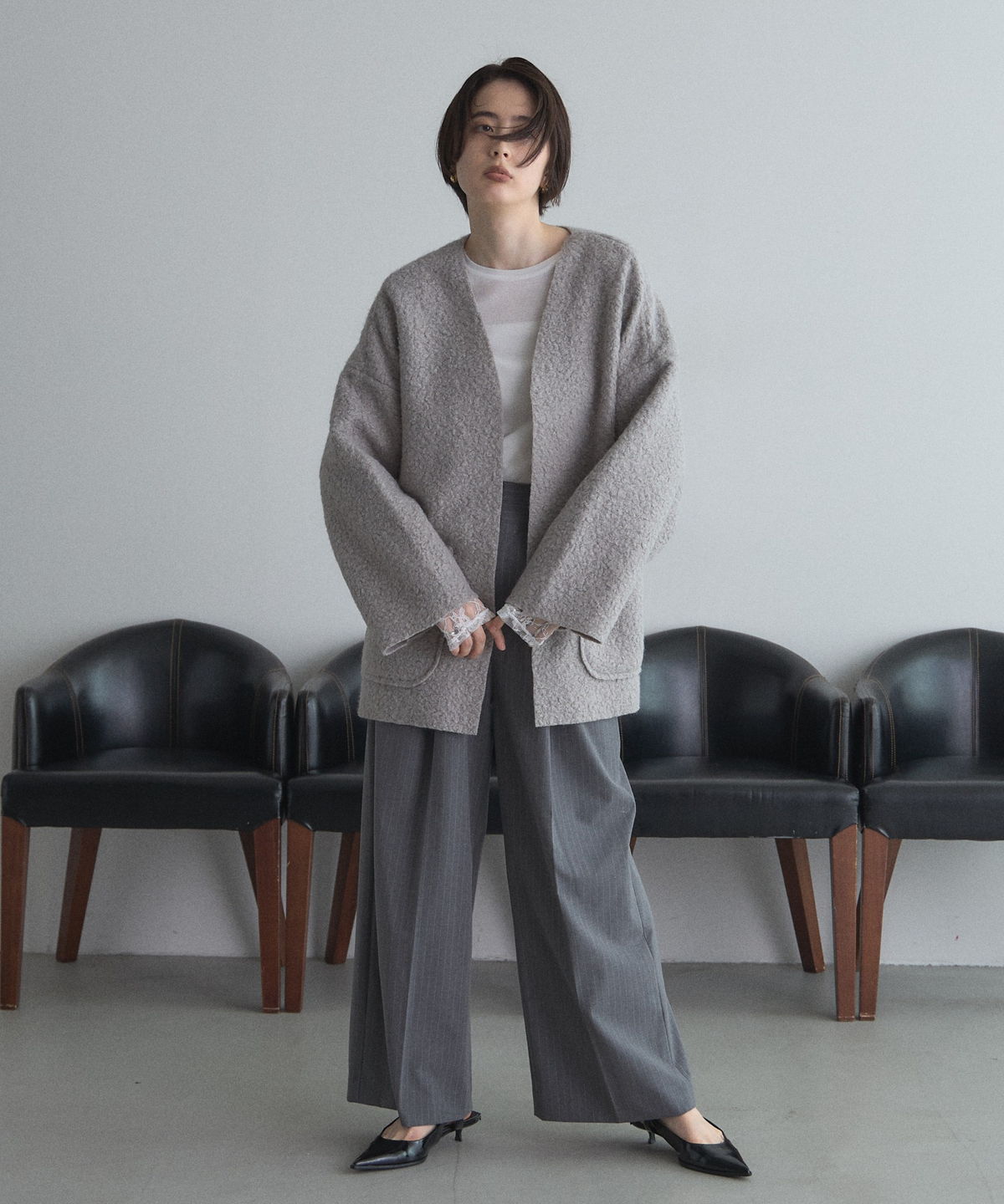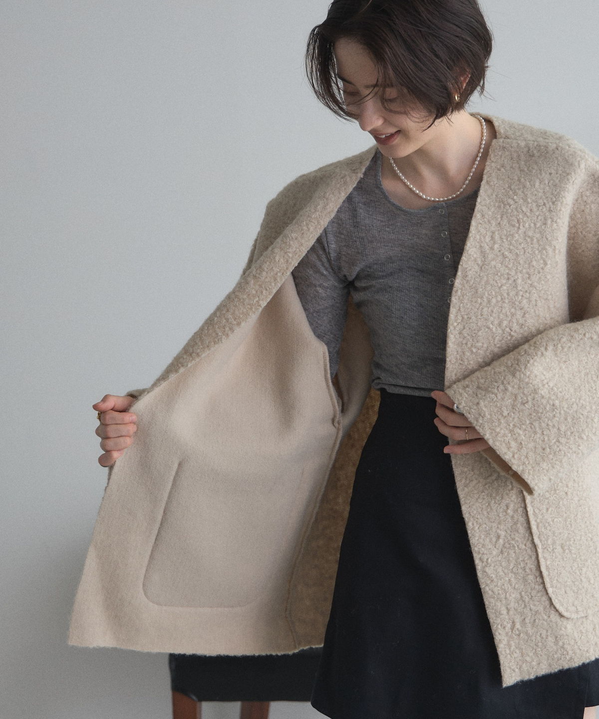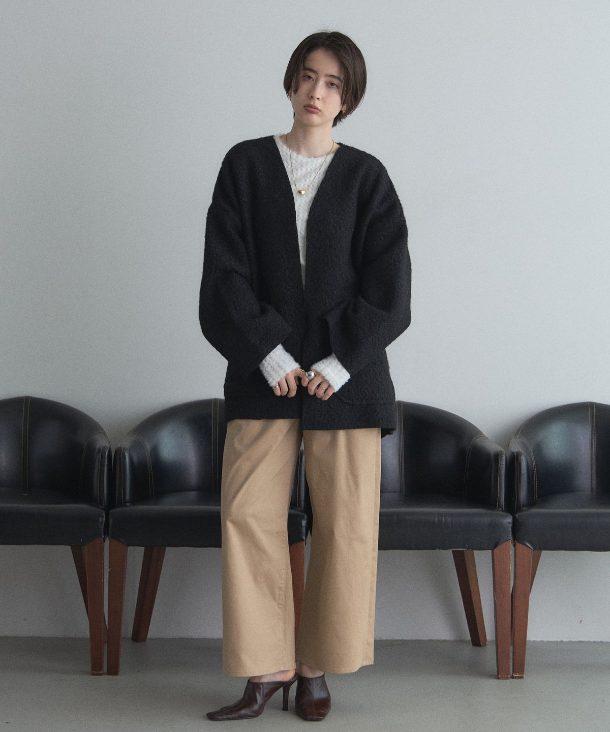 | 商品説明 | ≪ Attention:販売日、在庫状況はWEBと店舗と異なります。予めご了承くださいませ。≫ 軽く羽織れておしゃれ見え◎控えめもこもこ素材のコスパ抜群アウター ウールライクな素材が特徴的なガウンジャケット。 控えめなもこもこ感で上品な印象にしました。 大きなパッチポケットでトレンド感も機能性も◎ ゆとりを持たせたオーバーサイズで大人の抜け感コーデに仕上げてくれます。 軽やかな素材とボタンレスデザインで、さっと気軽に羽織っていただけます。 |